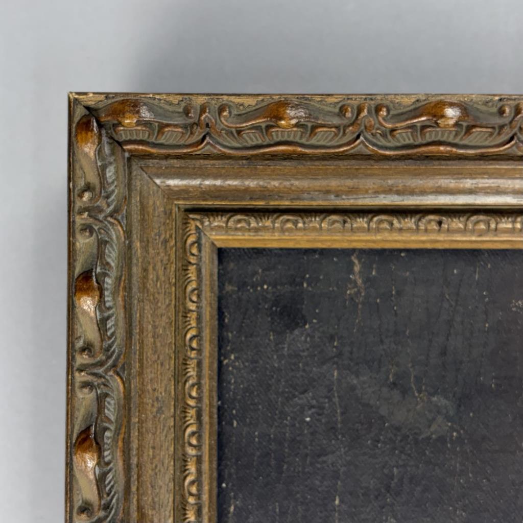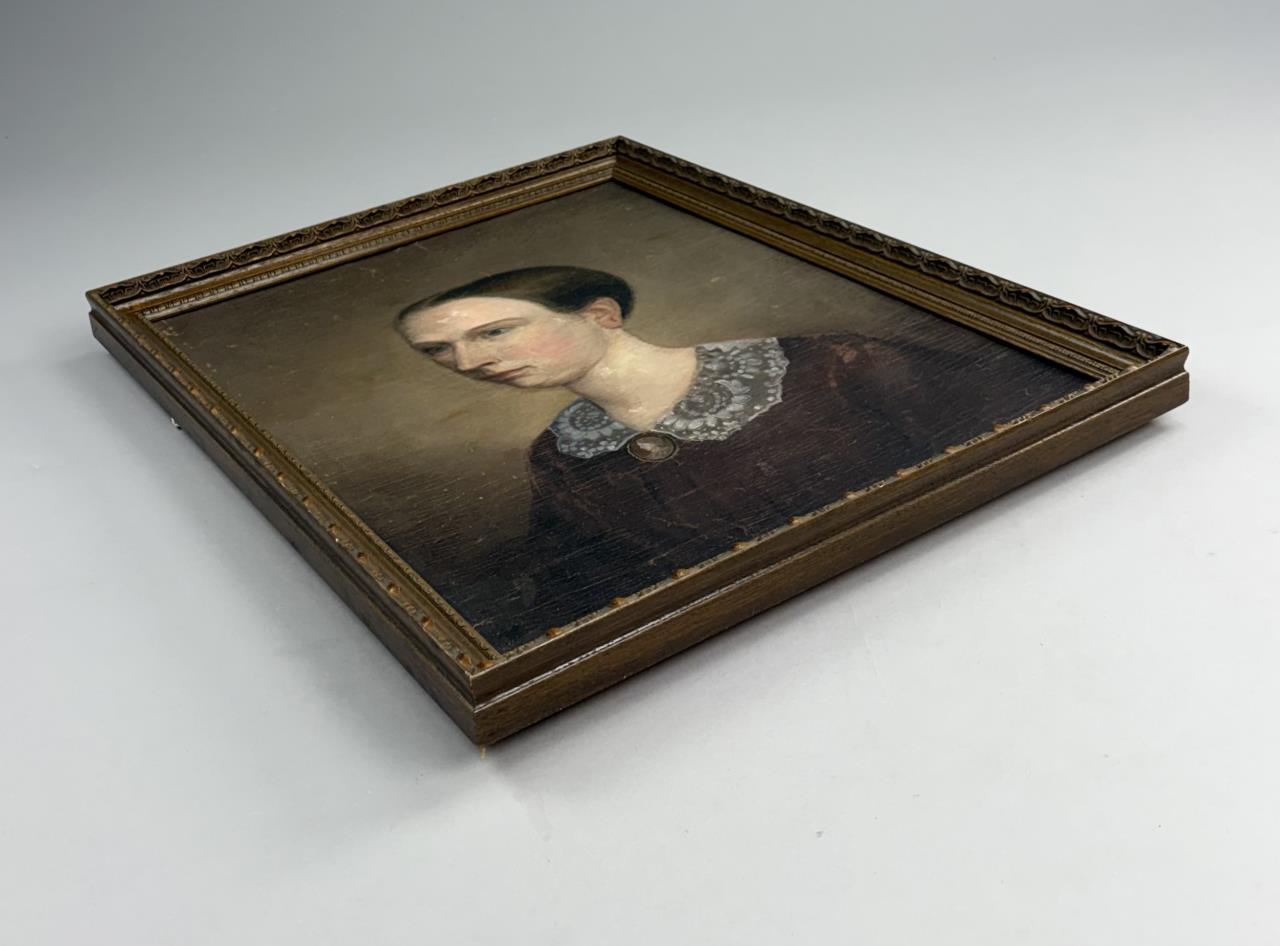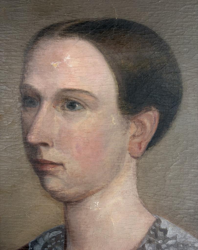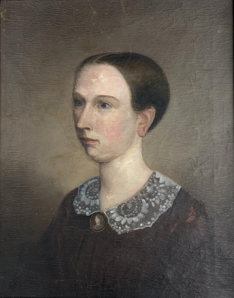 Oil portrait painting of a Victorian woman, on stretched canvas, most likely American School and late 19th century, in a later gesso and wood frame measuring 24″ x 19-1/2″.