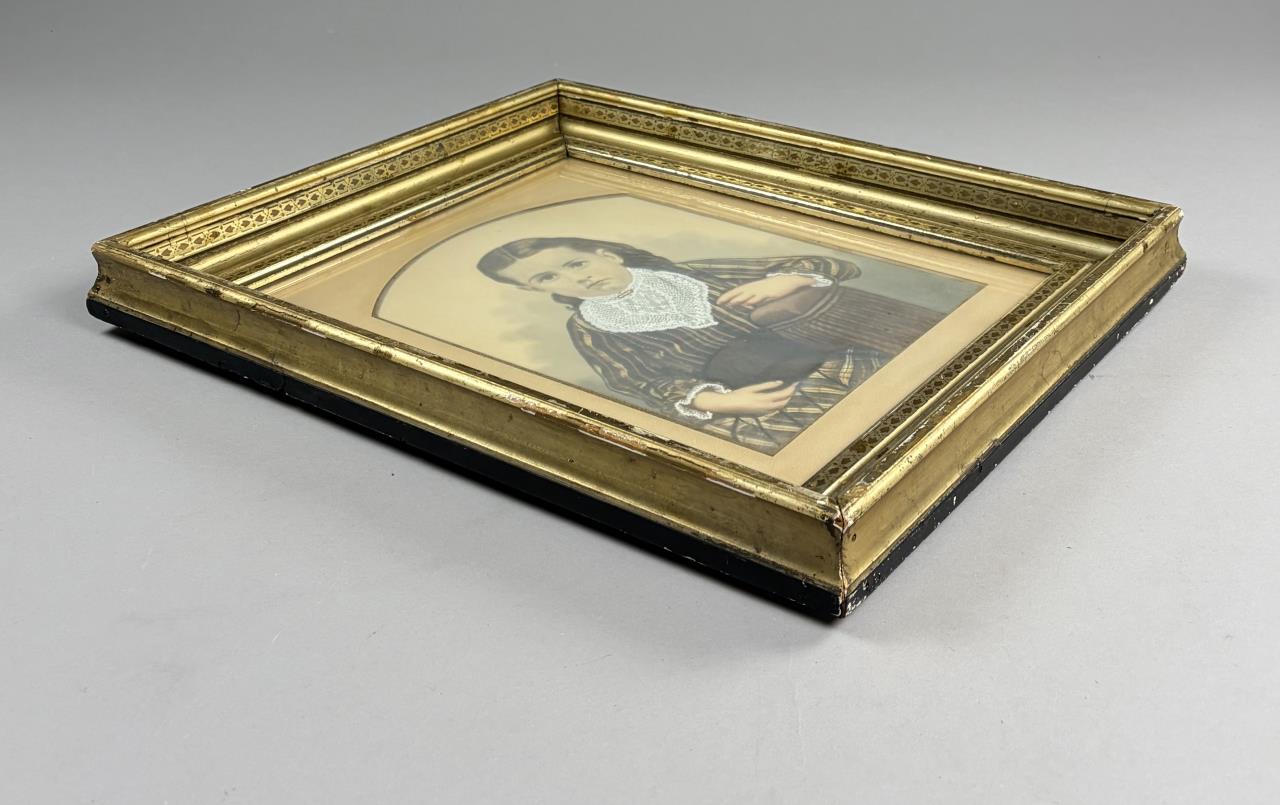 Victorian Era, painted portrait of a girl, in a period gilt gesso and wood frame, circa late 19th Century, measuring 21-1/2″x 18-1/2″.