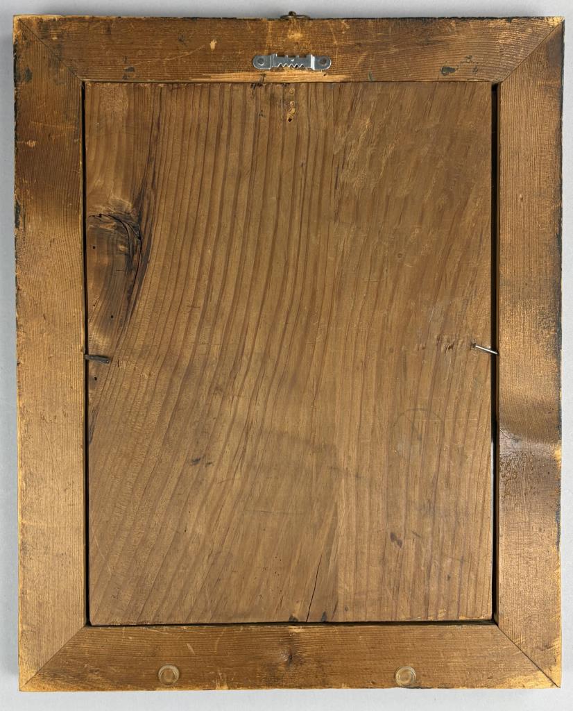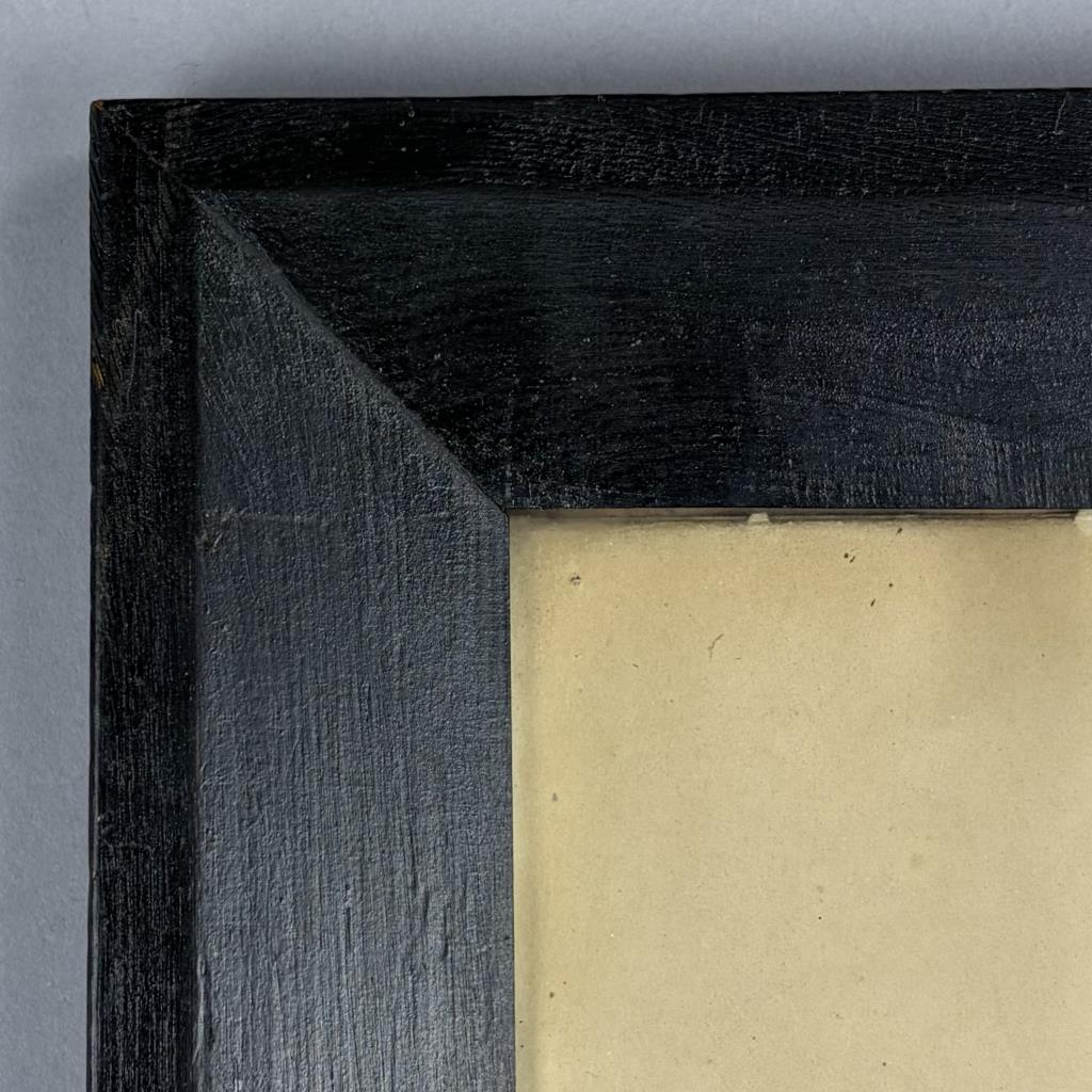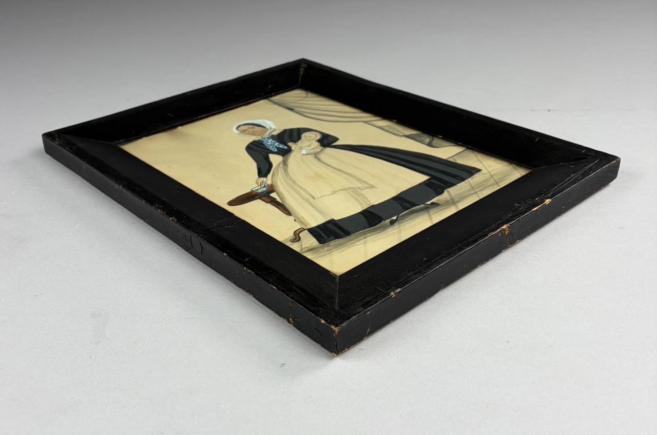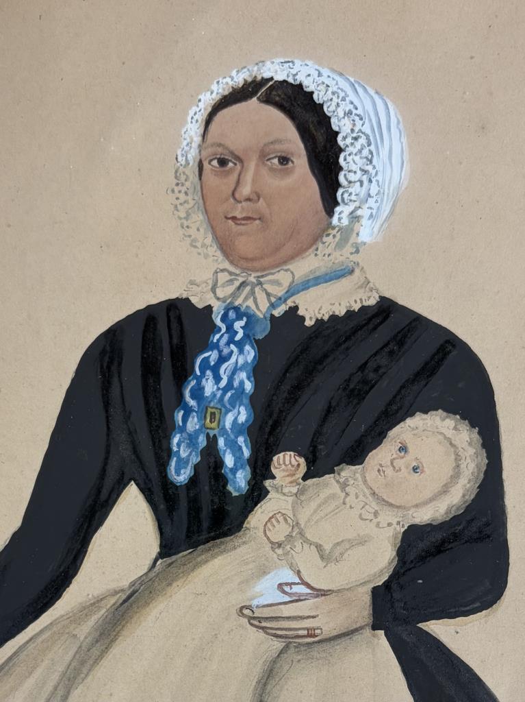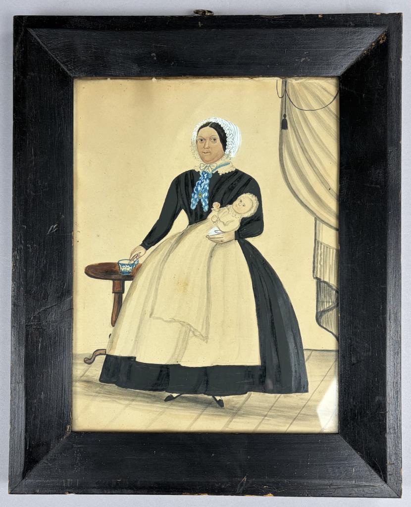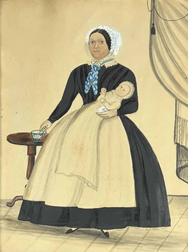 English folk art watercolor painting on paper, depicting a mother holding a baby in early to mid 19th Century attire, in a black painted wood frame measuring 15-15/16" x 13".