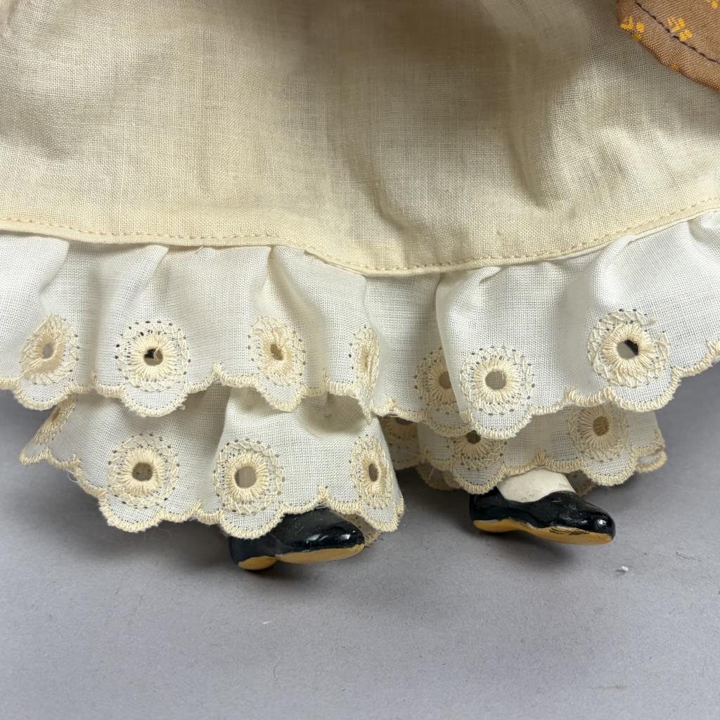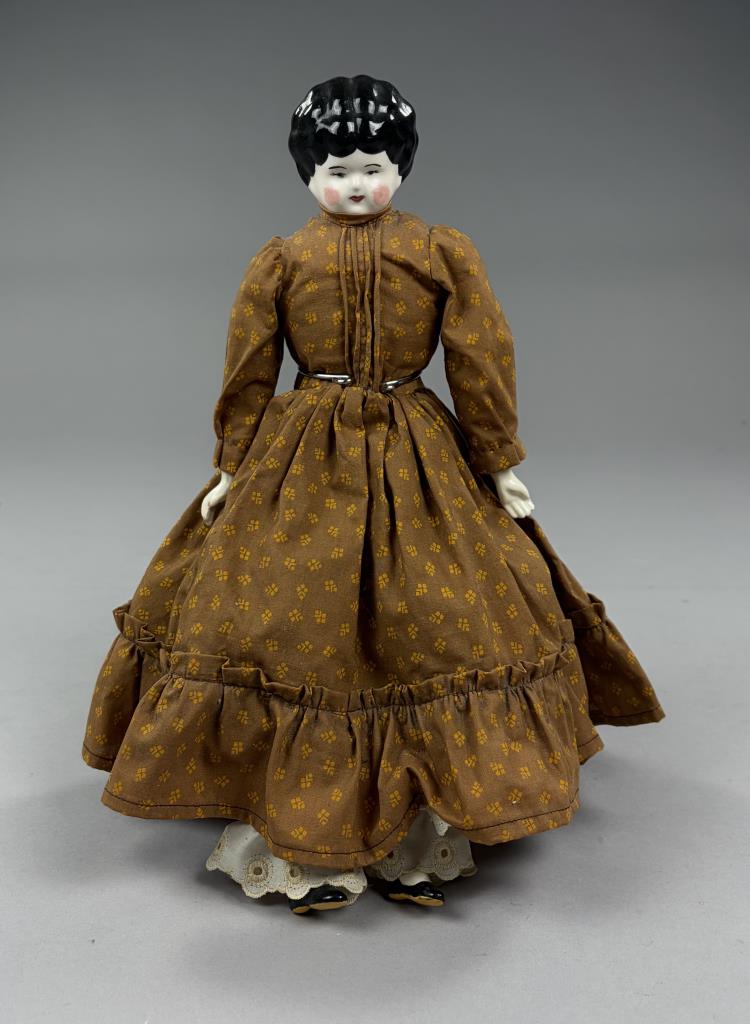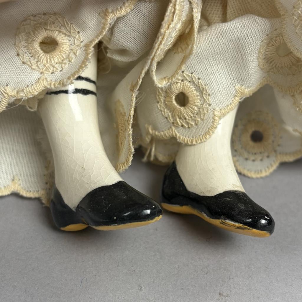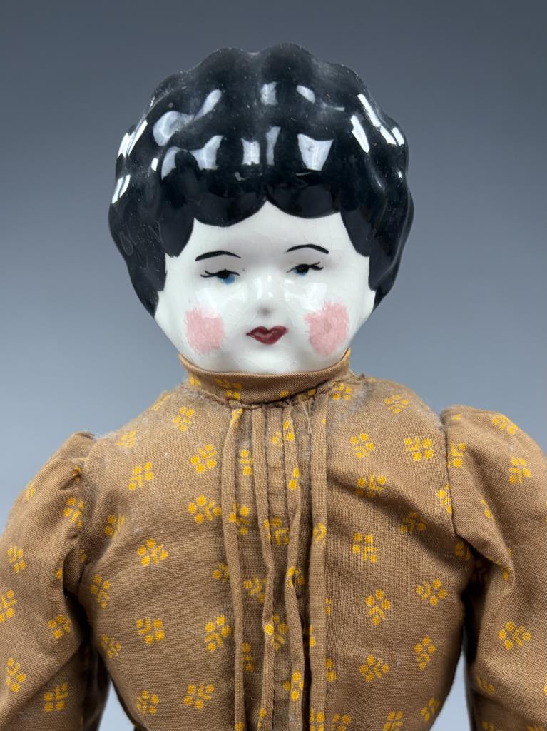 Victorian style china doll, cloth body with china arms and feet, 16″ (L).