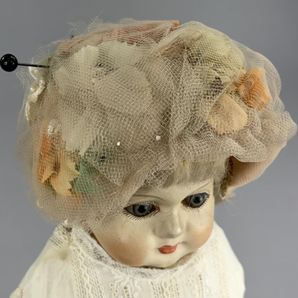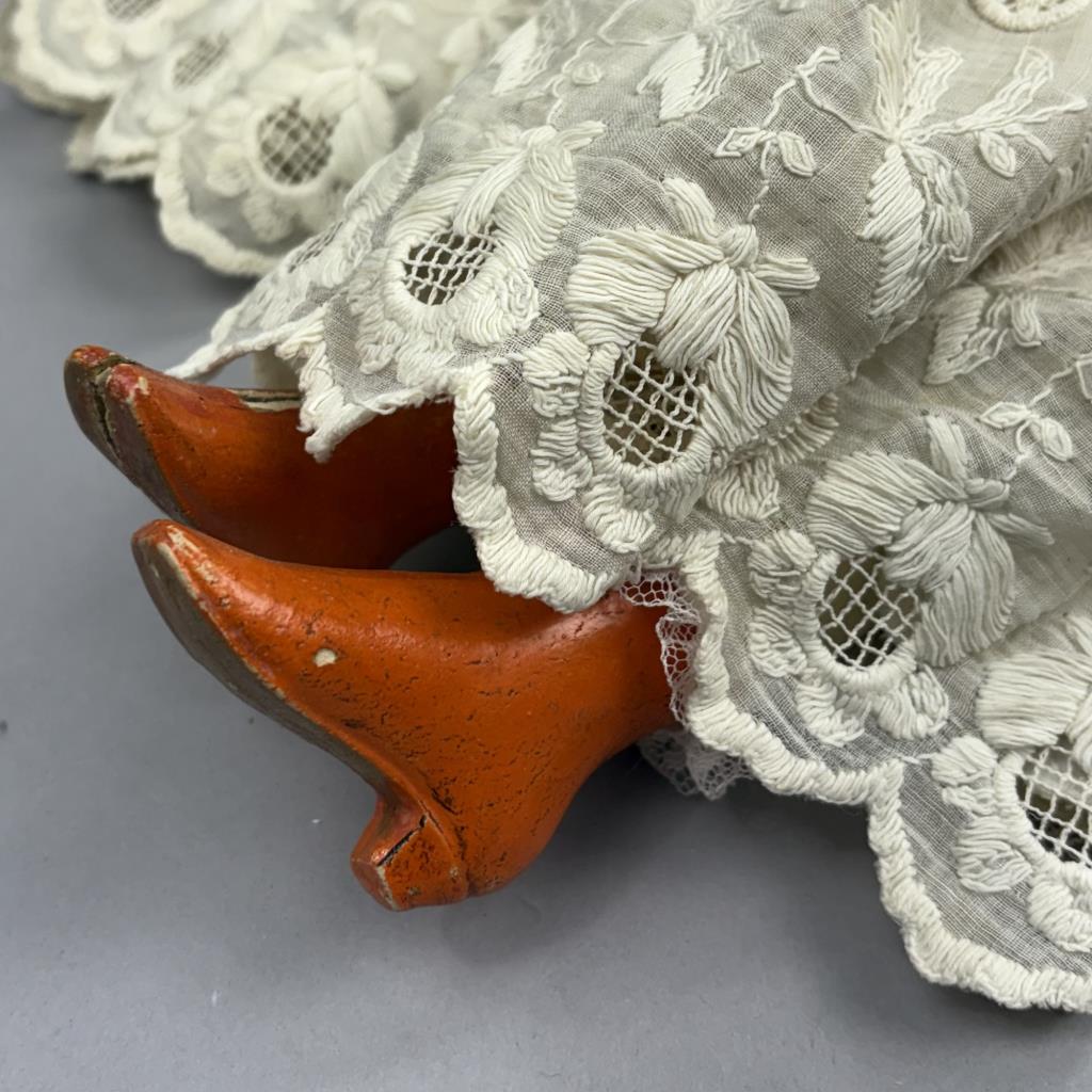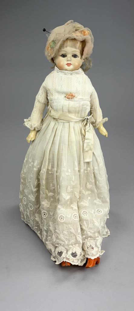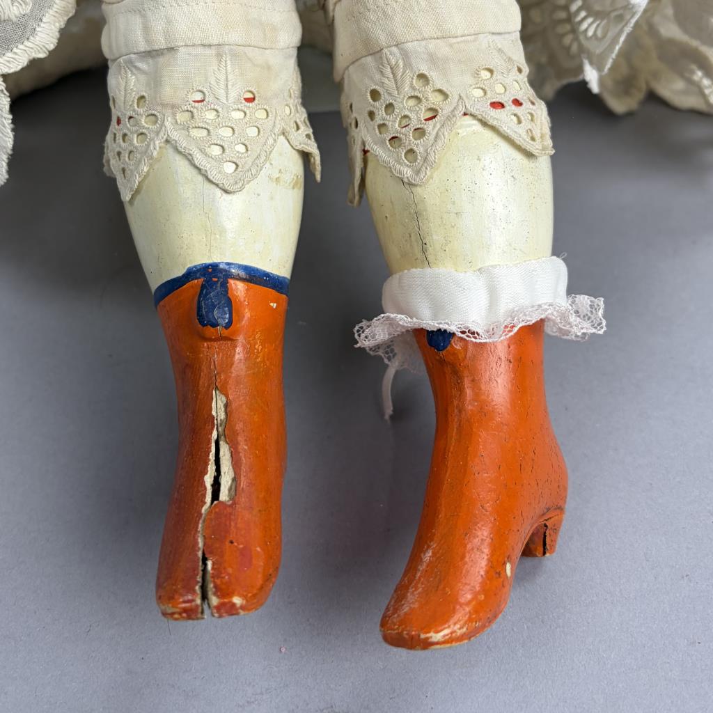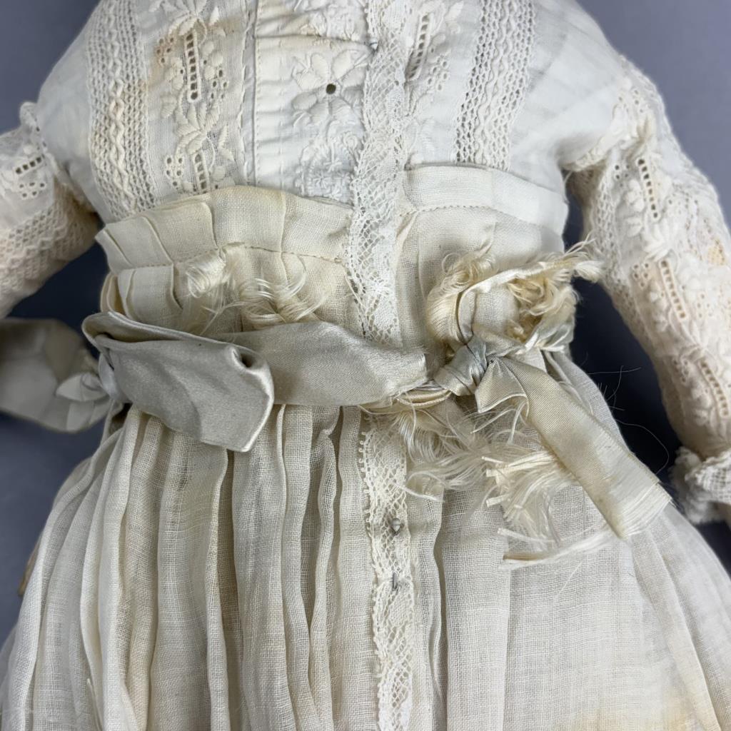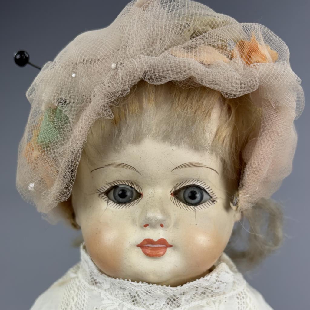 Antique Victorian Era composition doll, with cloth body and composition arms and feet, painted eyes, likely from early 20th century, 26″ (L).