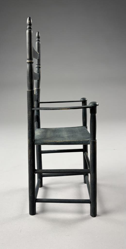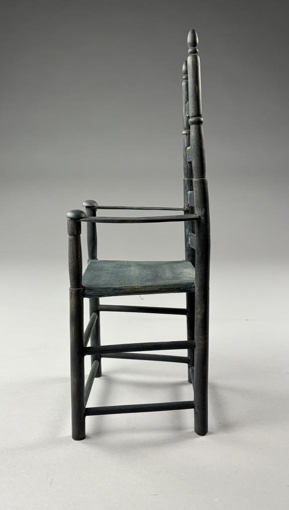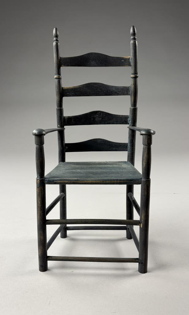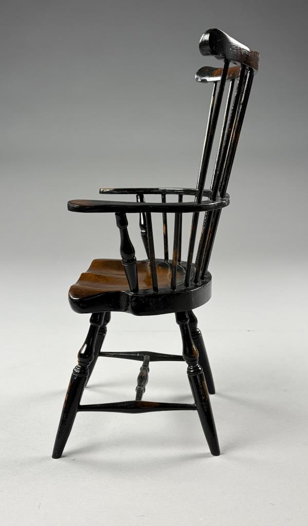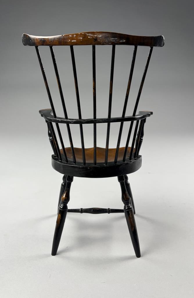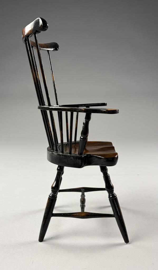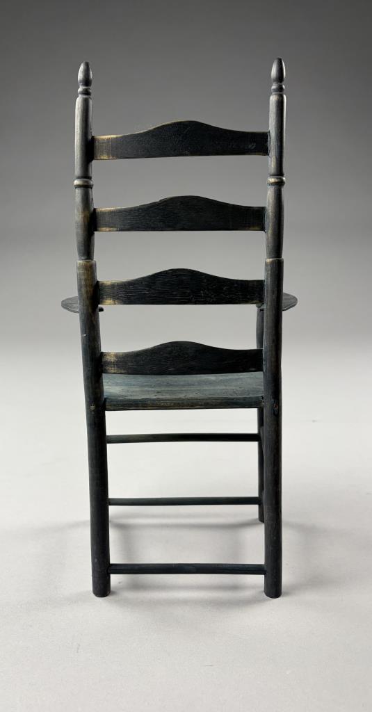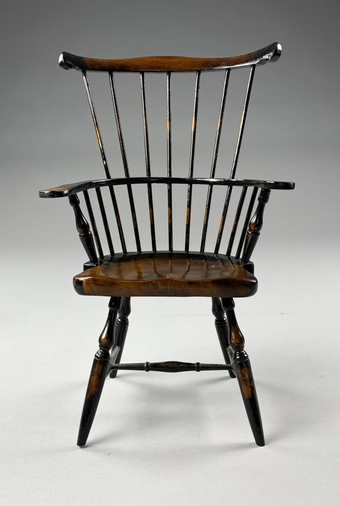 Two miniature chairs, a Shaker style ladder back and a comb-back Windsor, both approximately 15″ (H).