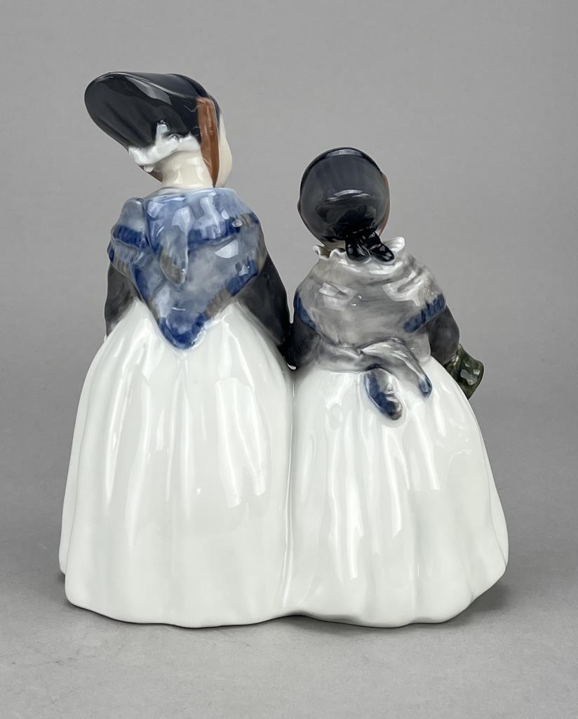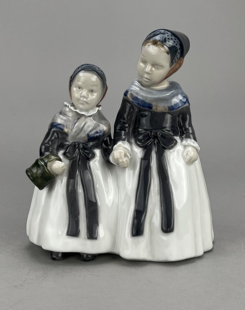 Royal Copenhagen (Denmark) porcelain figurine, “Amager Girls”, also known sometimes as “Two Amager Girls”, #1316, modelled by Lotte Benter in 1911, possible date code for 1967, 7-1/4″ (H).