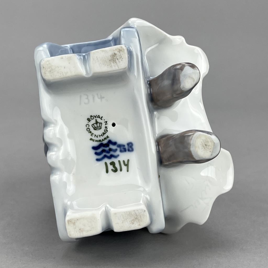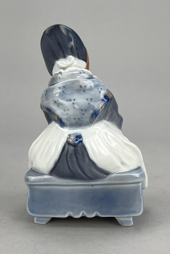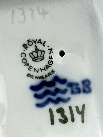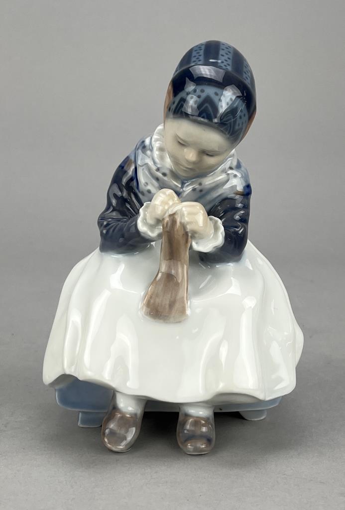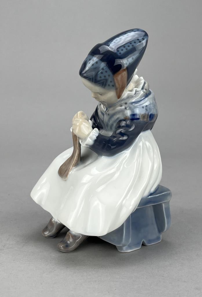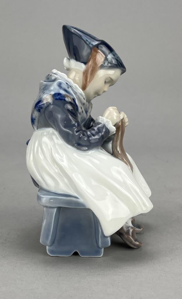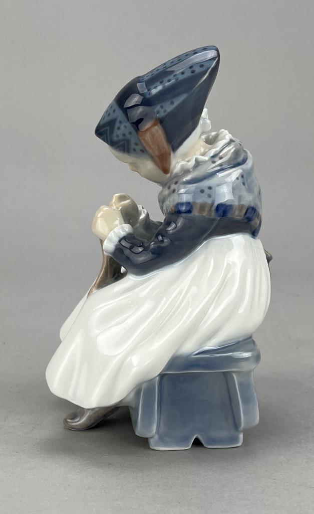 Royal Copenhagen (Denmark) porcelain figurine, “Amager Girl Sewing”, #1314, modelled by Lotte Benter in 1911, possible date code for 1985-1991, 5-7/8″ (H).