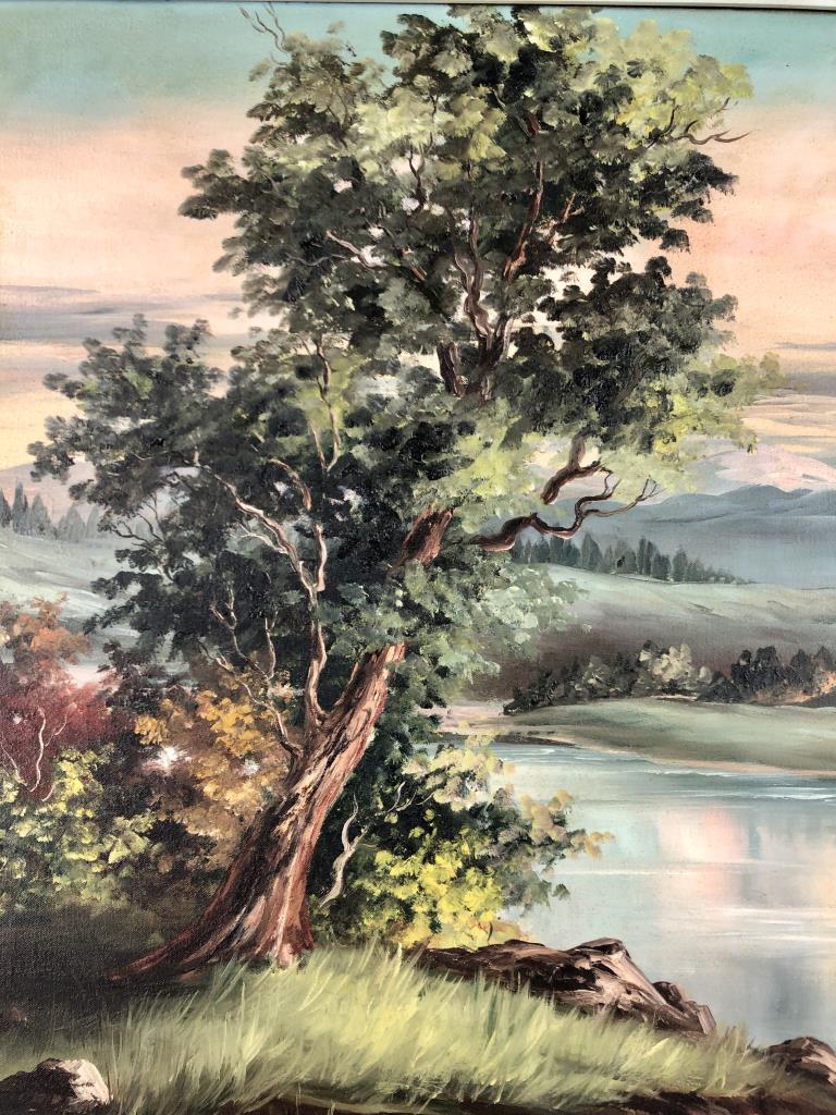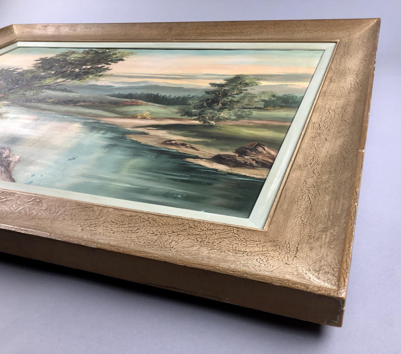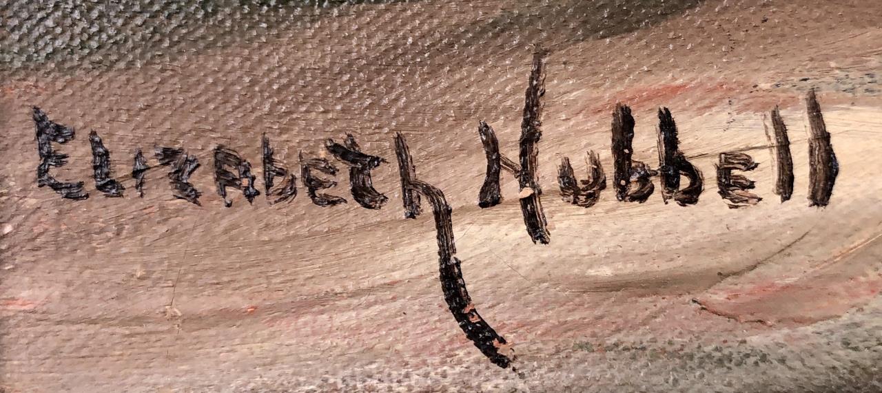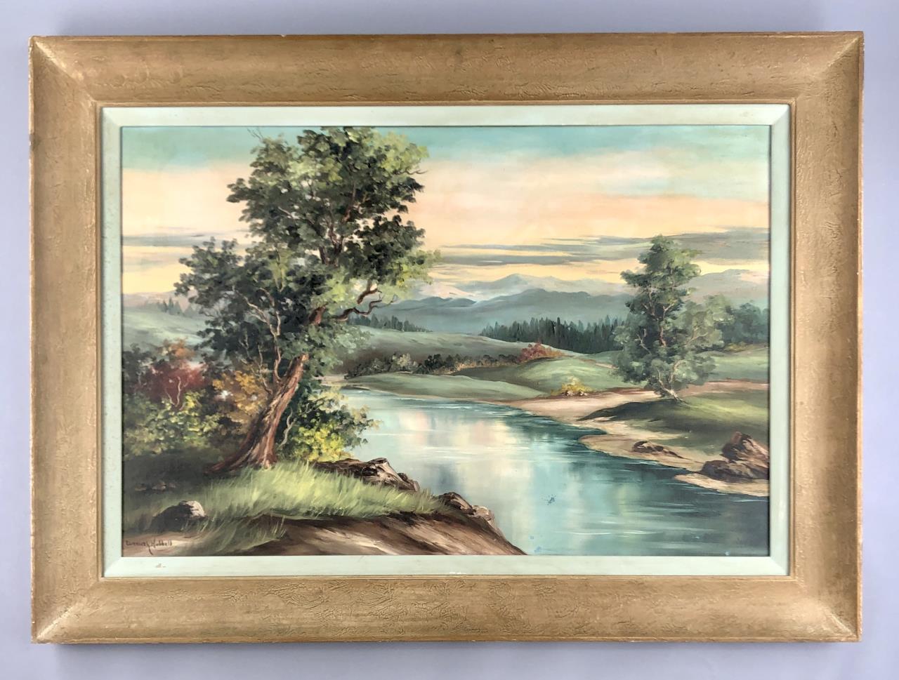 Riparian landscape oil painting on stretched canvas, by the Californian artist, Elizabeth Hubbell (American, 1905 – 1999), signed lower left, circa mid 20th Century, in a gilt wood and gesso frame measuring 32-1/2″ x 44-7/16″.
