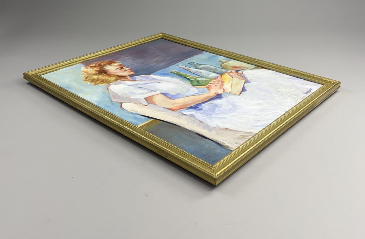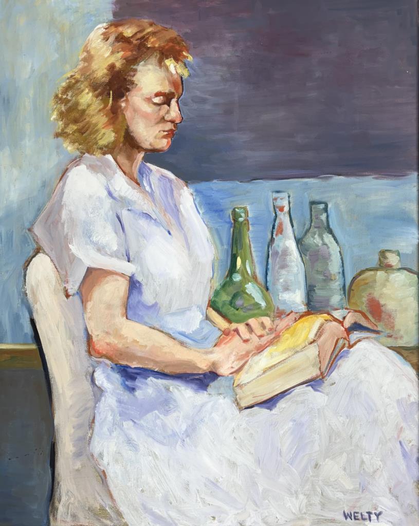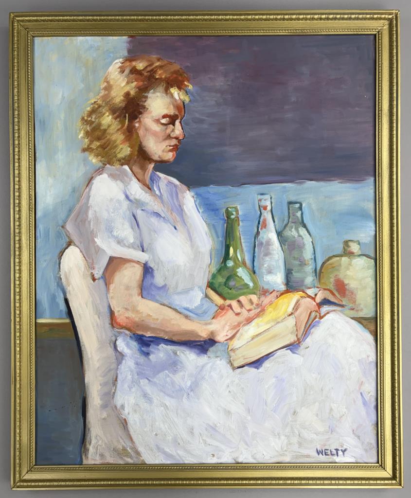 Oil painting on stretched canvas, depicting a woman holding a book with bottles in the background, signed lower right “Welty”, in a gold painted wood frame measuring 32-1/2″ x 26-1/2″.