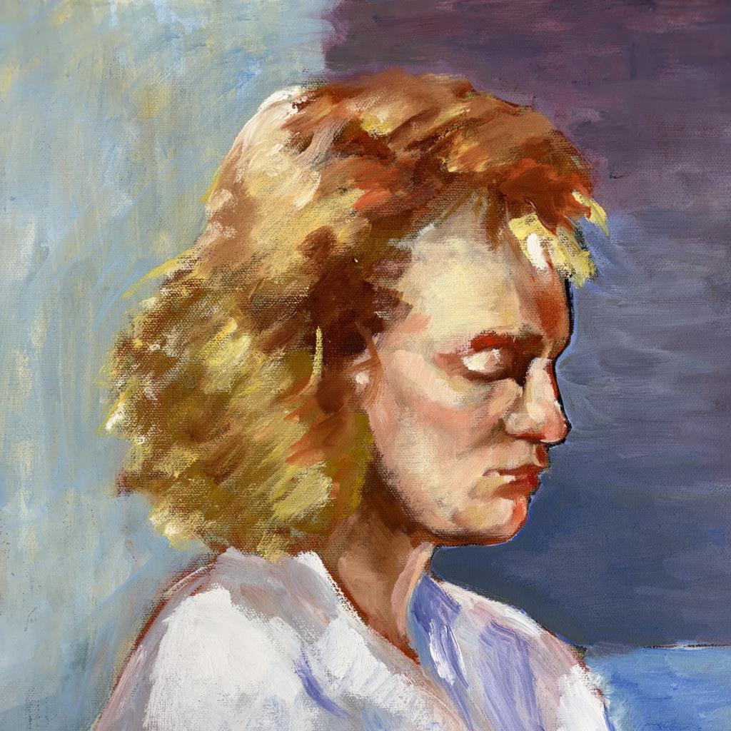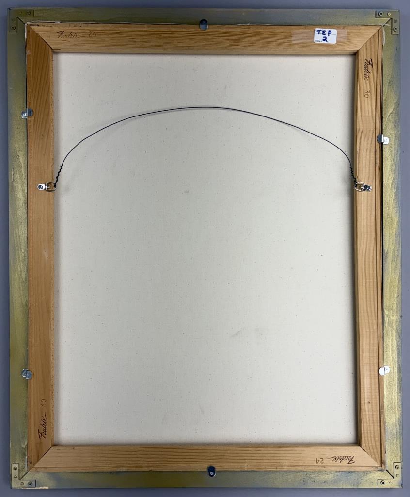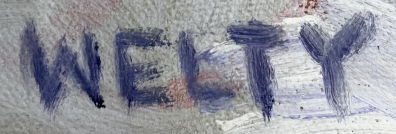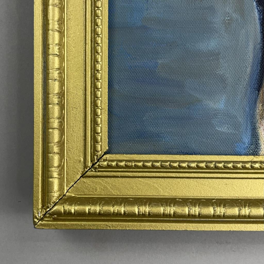 Oil painting on stretched canvas, depicting a woman holding a book with bottles in the background, signed lower right “Welty”, in a gold painted wood frame measuring 32-1/2″ x 26-1/2″.