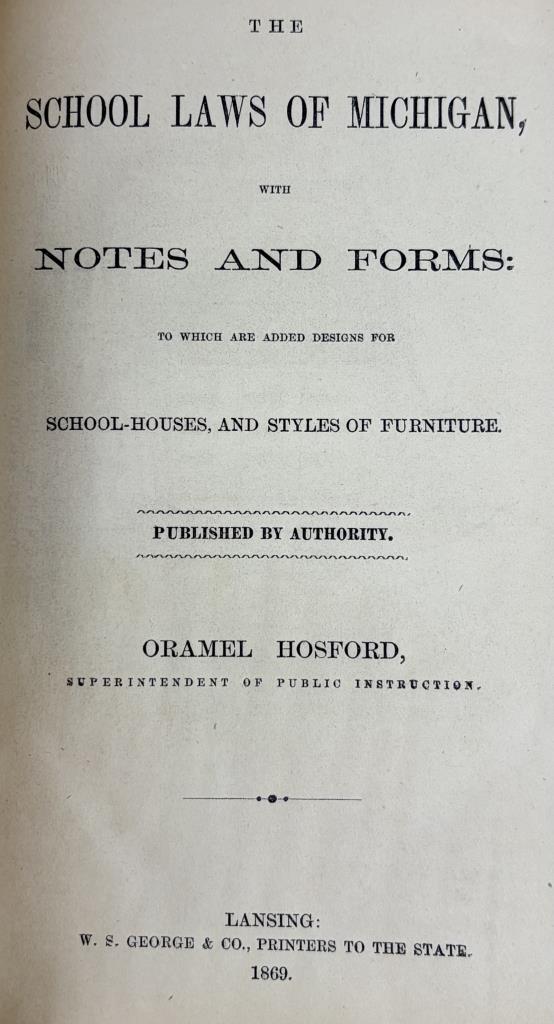 Oramel Hosford (American, 1820-1893), “The School Laws of Michigan with Notes and Forms to Which are Added Designs for Schoolhouses, and Styles of Furniture”, Lansing, Michigan: 1869.