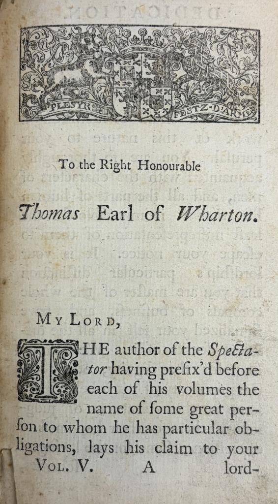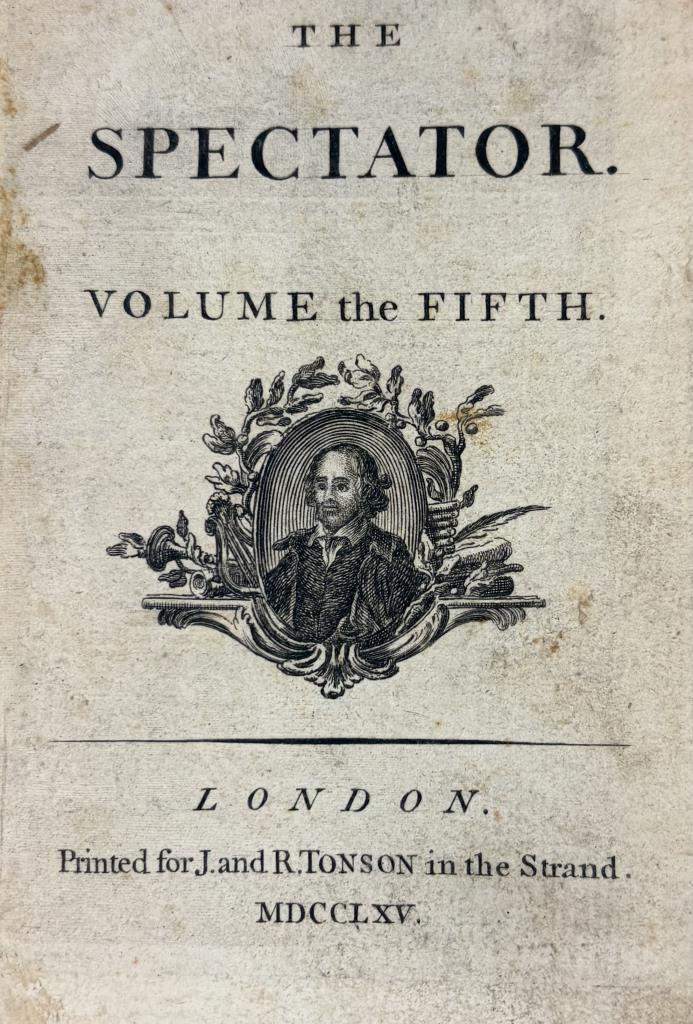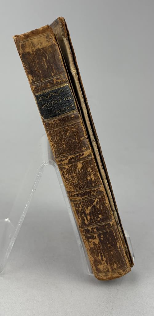 “The Spectator, Volume five”, by Richard Steele (ENG, 1671-1729) and Joseph Addison (ENG. 1672-1719), London: 1765; leatherbound book.