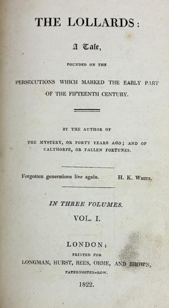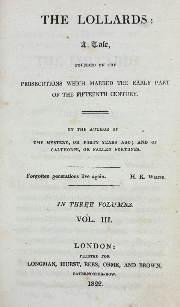 Thomas Gaspey (English, 1788-1871), “The Lollards: A Tale; Founded on the Persecutions Which Marked the Early Part of the Fifteenth Century”, volumes I and III, London: 1822.