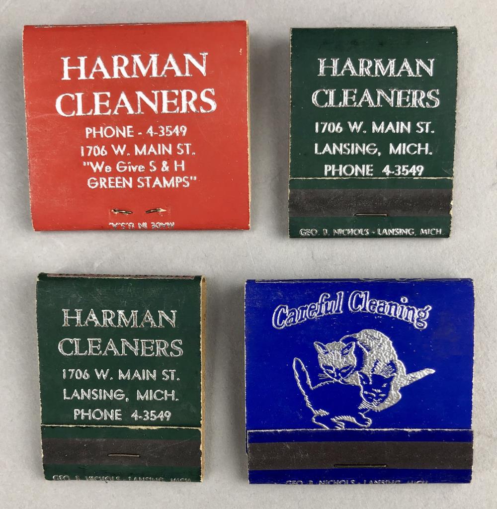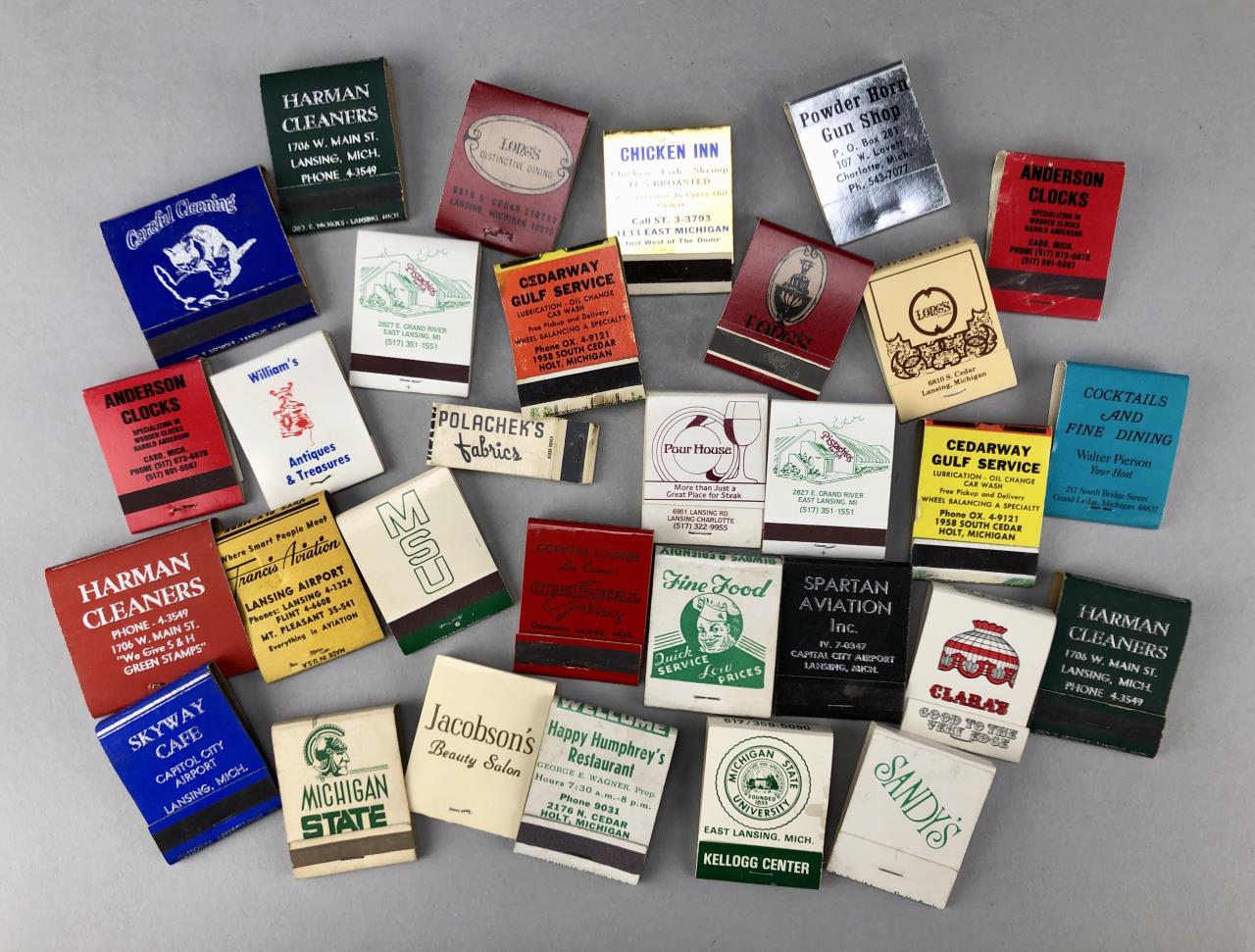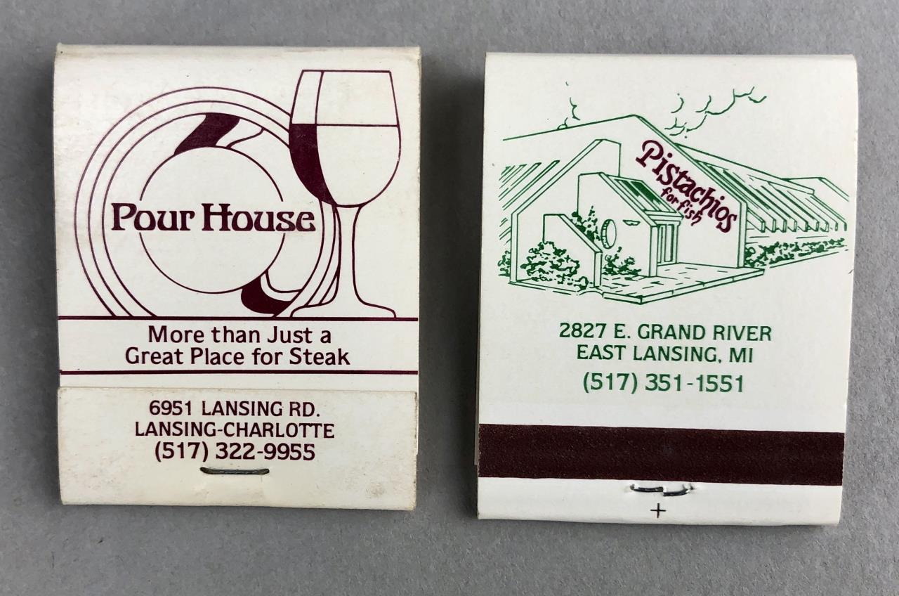 Matchbooks from Lansing, Michigan restaurants and business, including the Pourhouse, Harmon Cleaners, Long’s, Clara’s, Jacobson’s, and more; mid 20th Century.