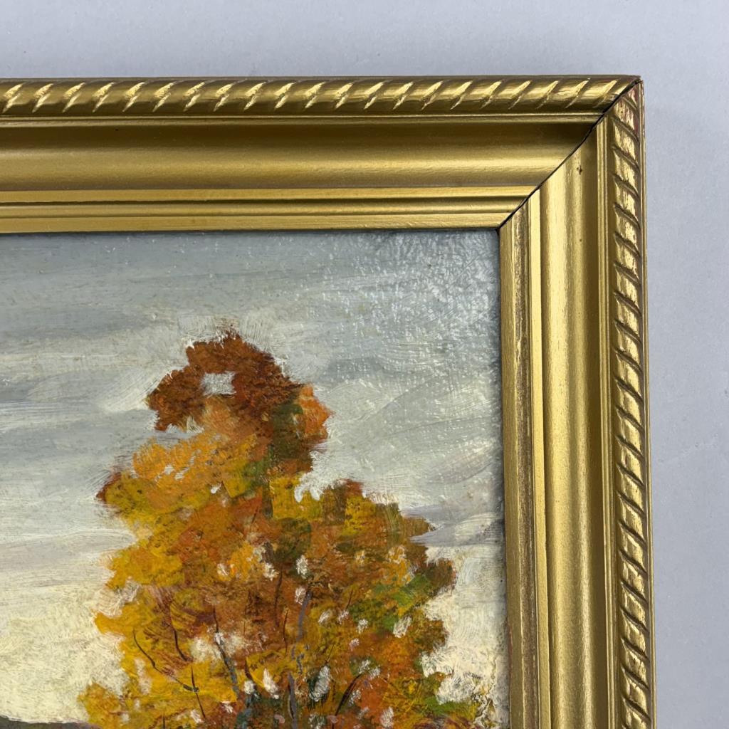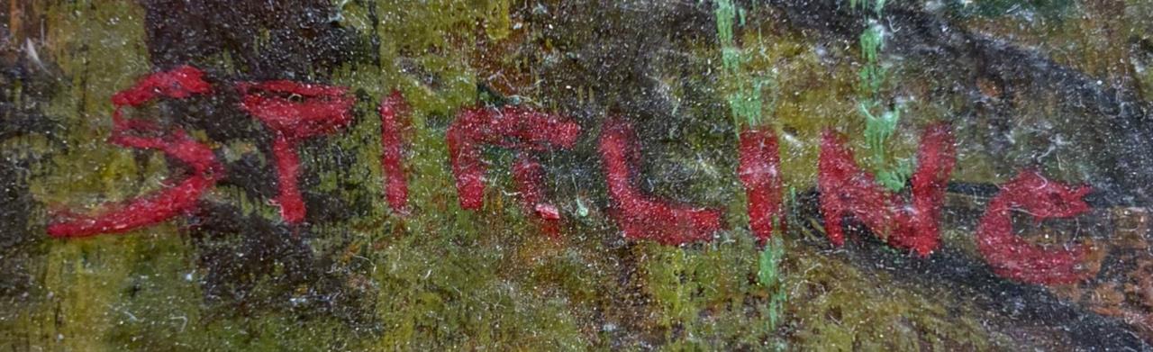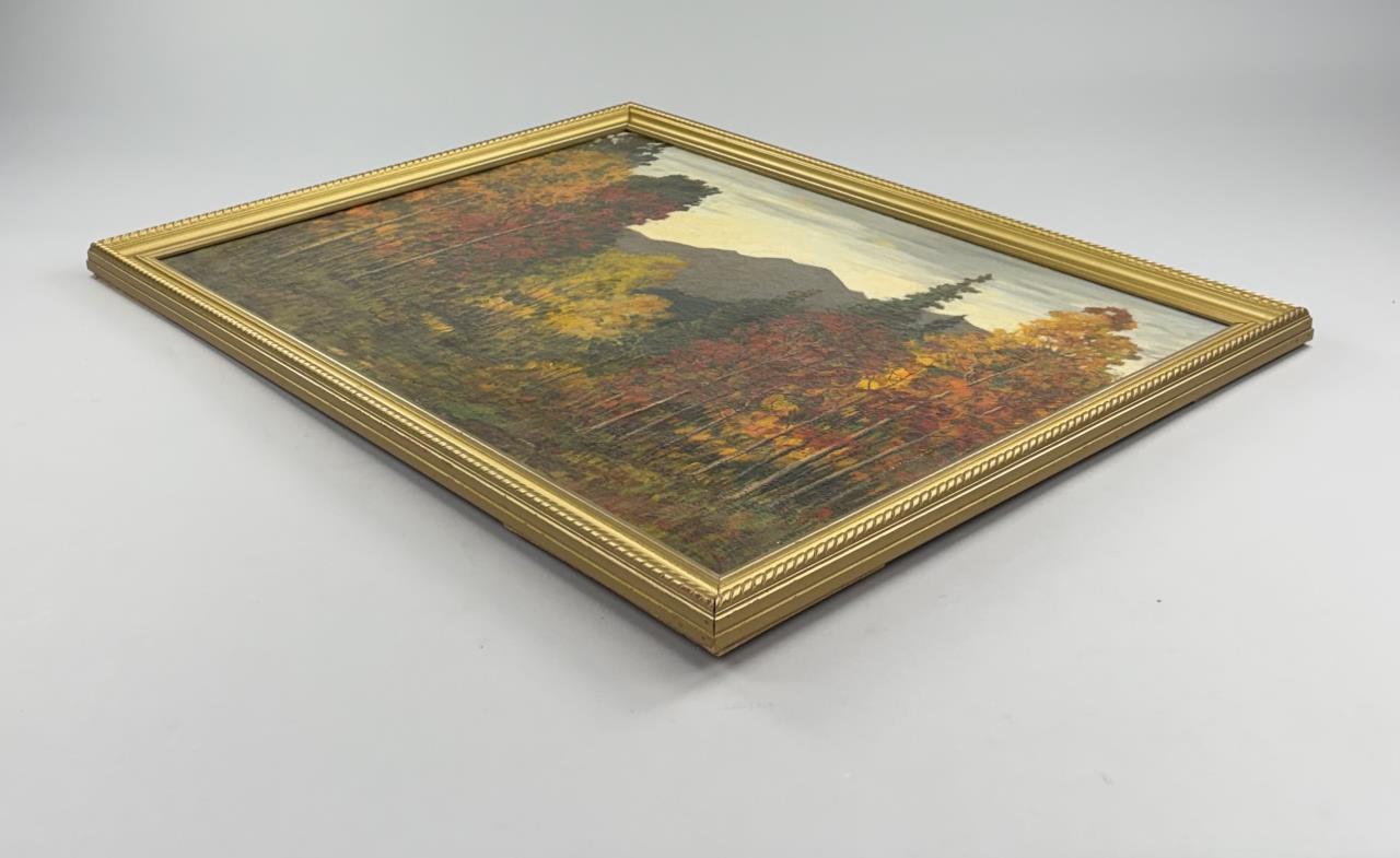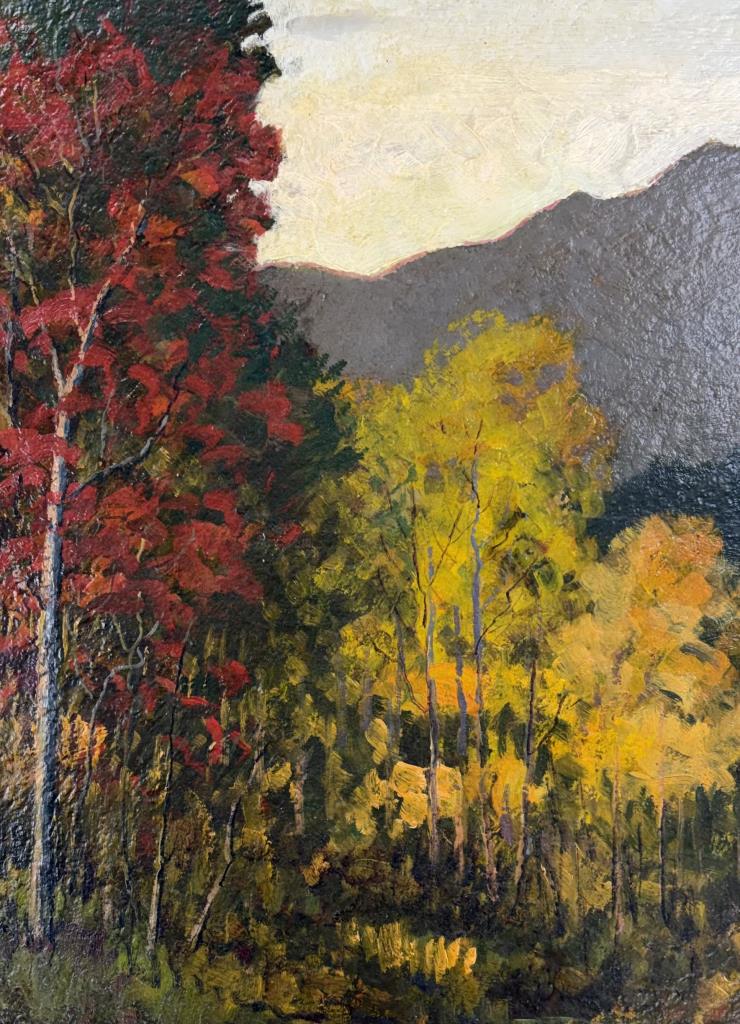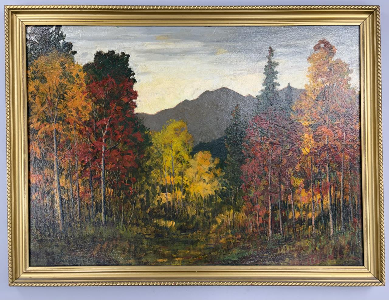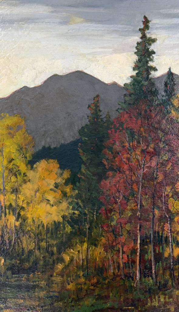 David (Dave) Stirling (Iowa/Colorado, 1887-1971), oil painting on board depicting an autumnal Rocky Mountain landscape, most likely a scene within the Rocky Mountain National Park where Stirling lived, signed lower right, circa 1940s – 1960s, in a gilt wood frame measuring 39-1/2″ x 29-2/2″ with a tag from a Detroit picture framer. Stirling was born in Iowa but is predominantly associated with Colorado and the Rocky Mountain National Park. He attended Cummings Art School in Des Moines (Iowa) and later studied at the Academy of Fine Arts in Chicago.