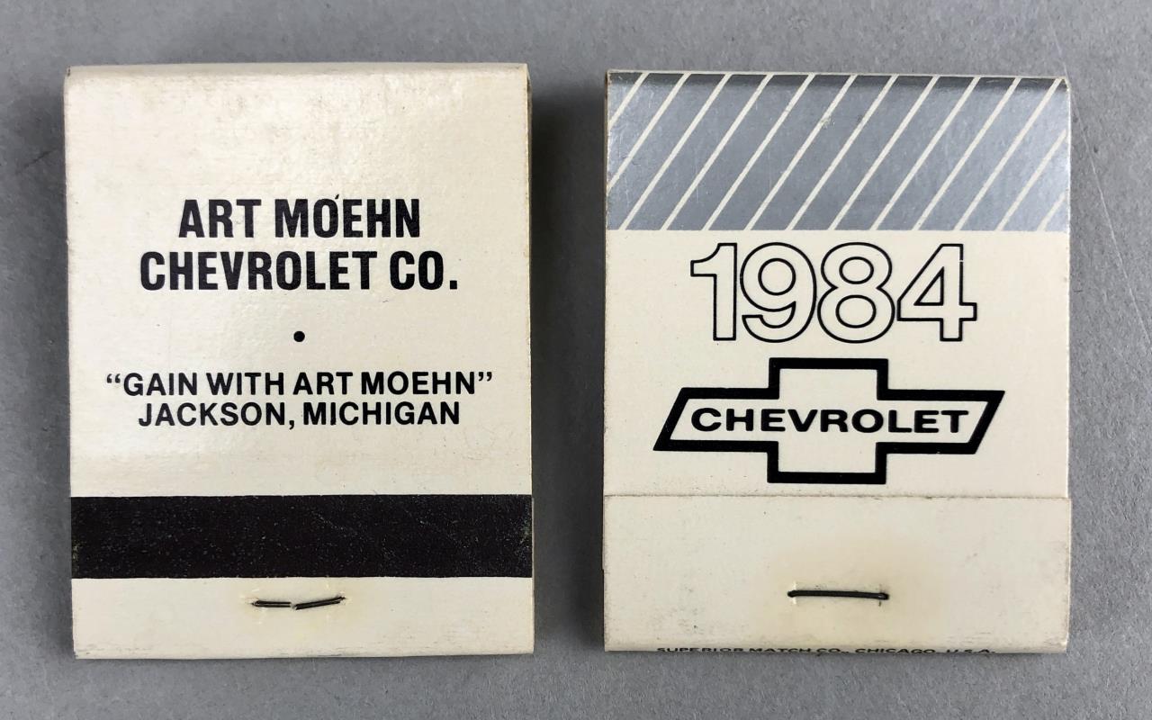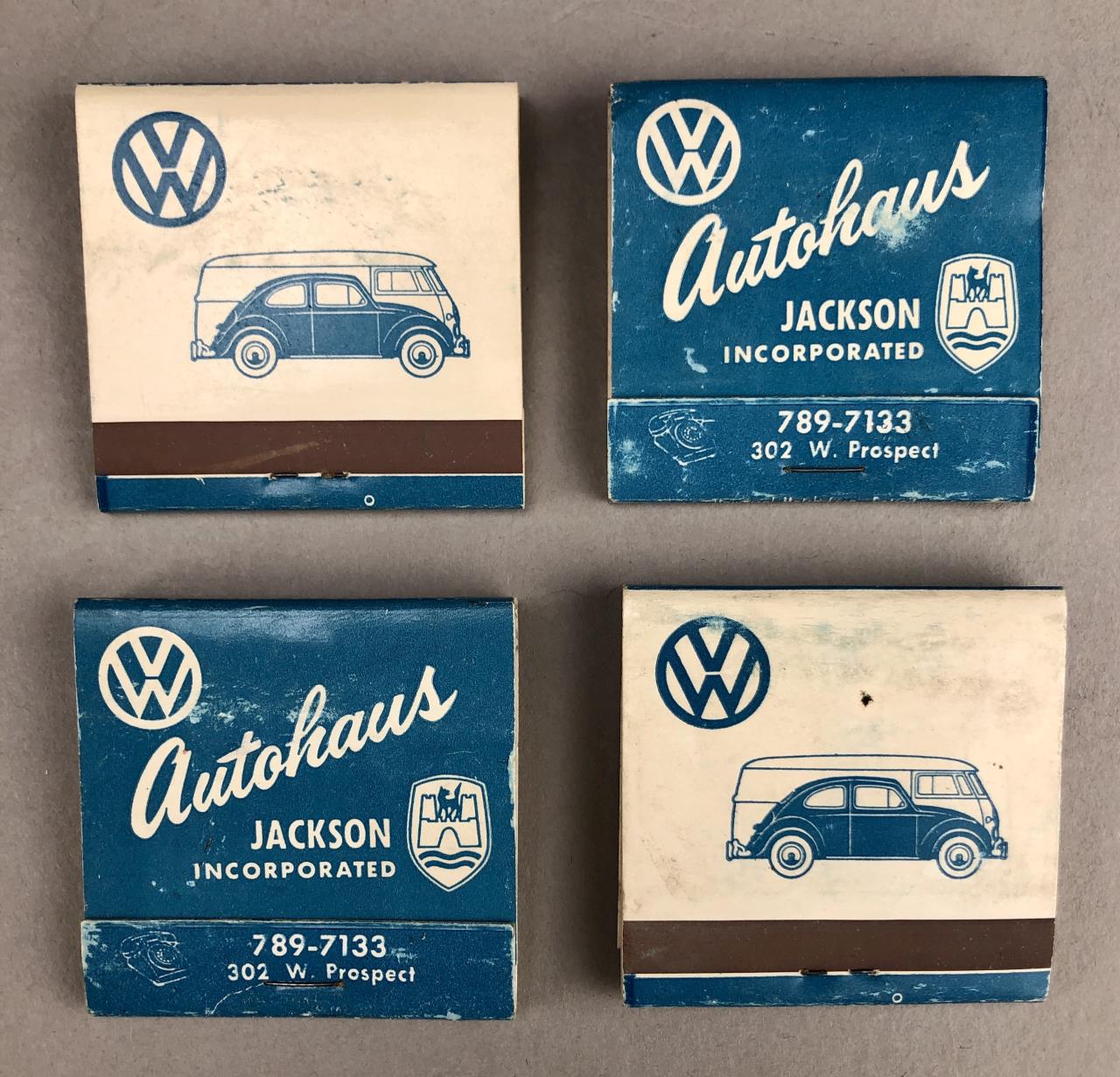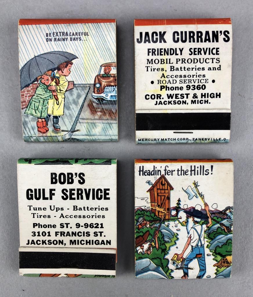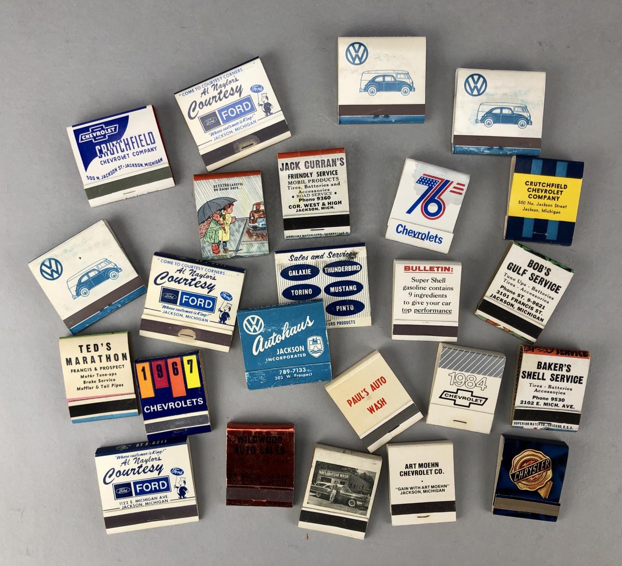 Jackson, Michigan automotive matchbooks, including dealerships, repair shops, and car washes; featuring VW Autohaus, Art Moehn, Paul’s Auto Wash, Al Naylor’s Ford, Crutchfield Chevrolet Company, Bob’s Gulf Service, and more; mid 20th Century.