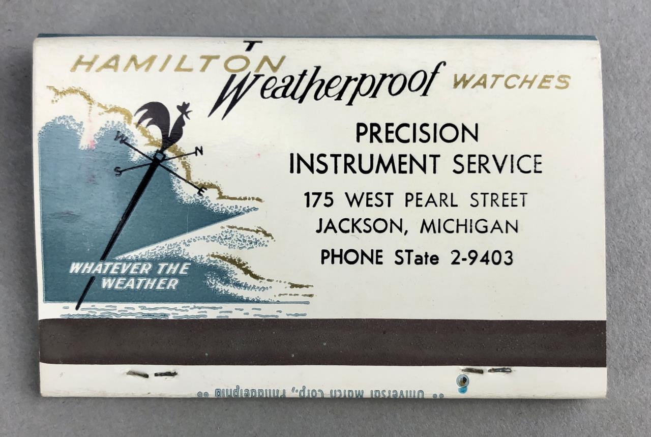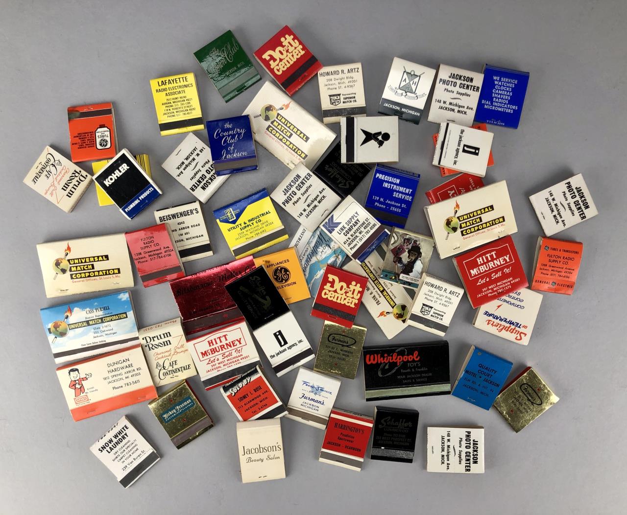 Jackson Michigan businesses matchbooks, including Jacobson’s, Forman’s, Precision Instruments, Beiswenger’s, Dunigan Hardware, Hasbrouck Appliance & TV, Universal Match Corporation, Fulton Radio Supply Co., and more; mid 20th Century.