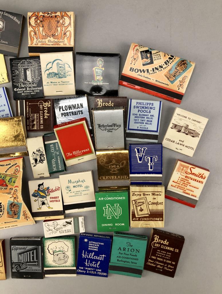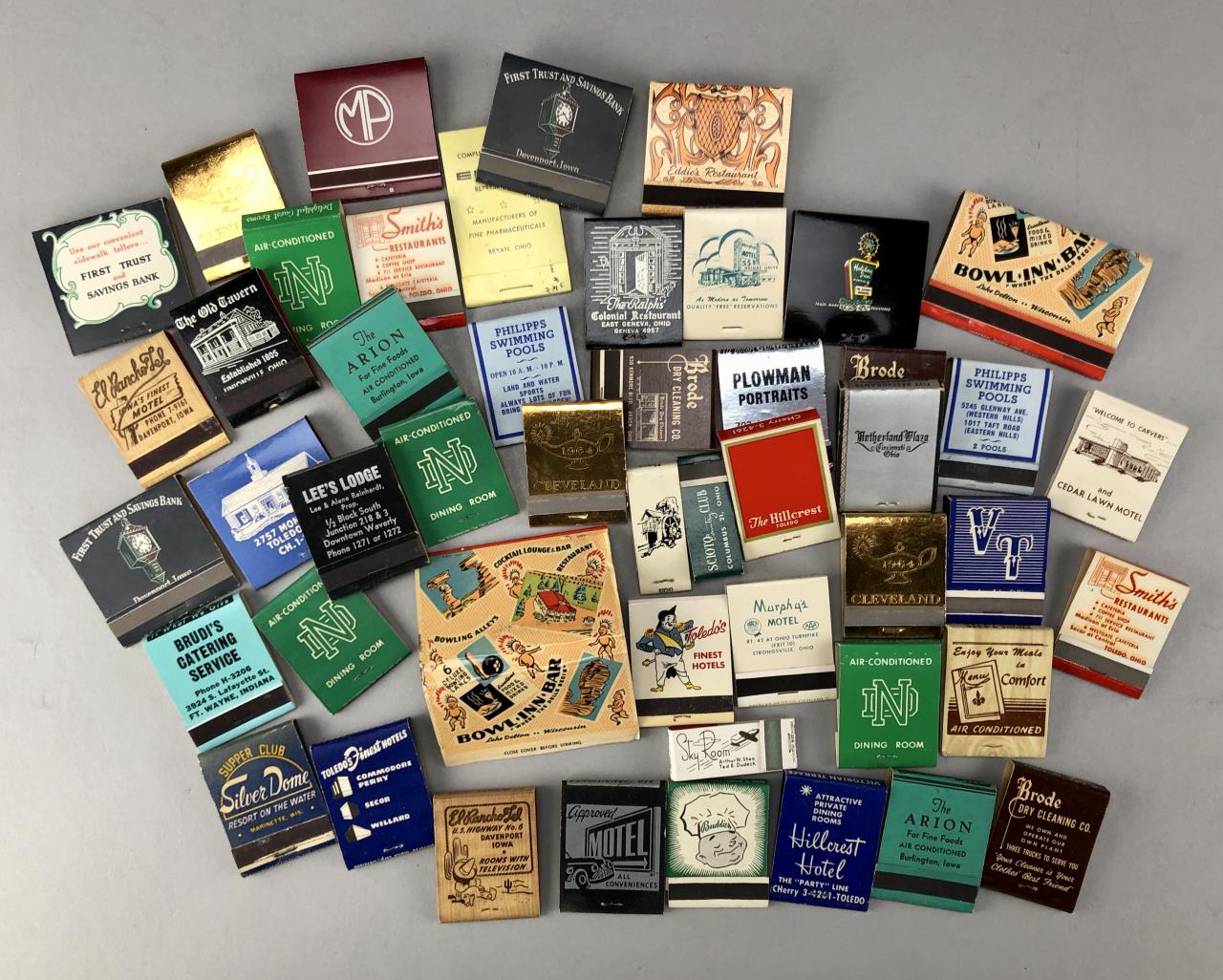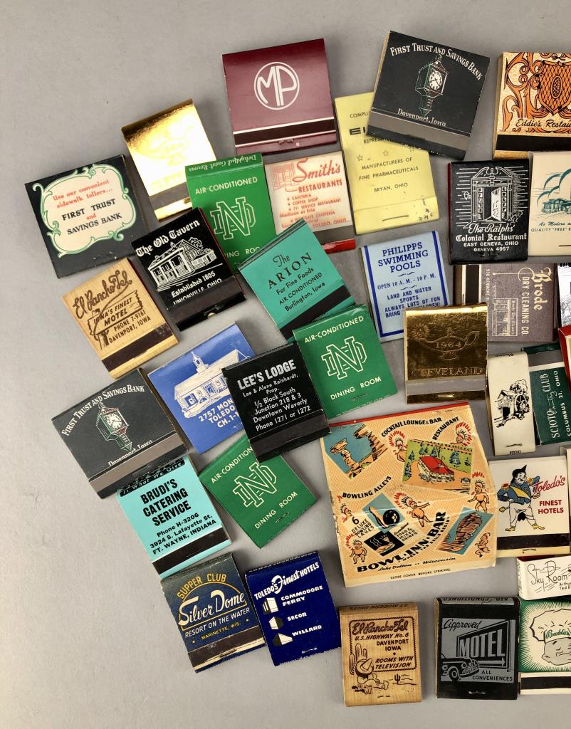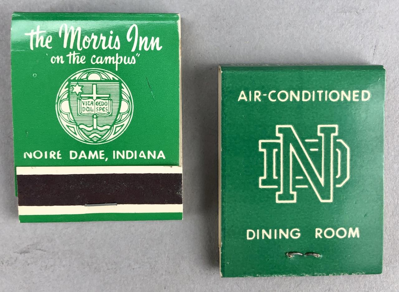 Ohio, Indiana, Iowa, and Wisconsin hotels, motels, bars, and restaurants matchbooks, including The Morris Inn at Notre Dame University, Bowl Inn Bar, Lee’s Lodge, Sky Room, Silver Dome Resort on the Water, and more; mid 20th Century.