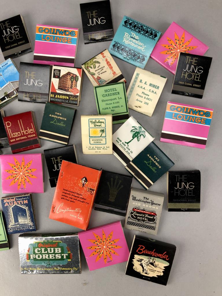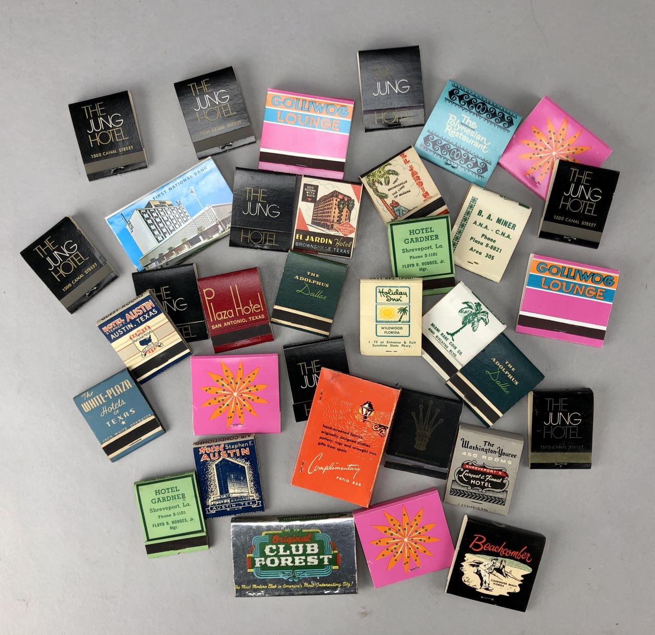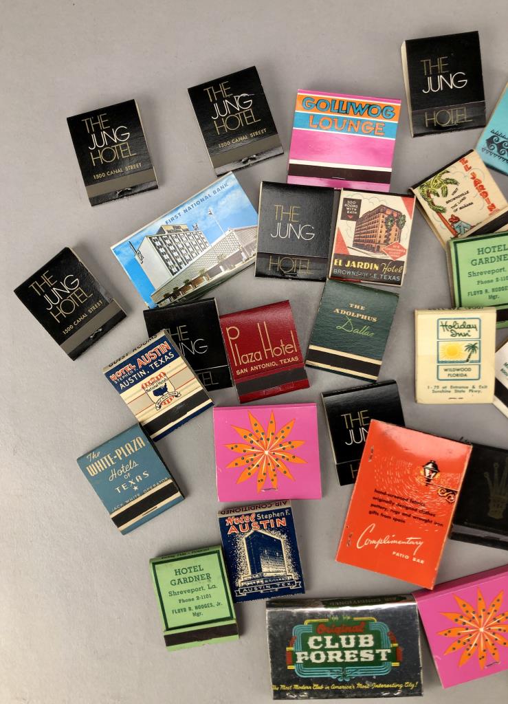 Mostly Texas, Florida, and Louisiana matchbooks, including bars, restaurants, hotels in New Orleans, Miami, Austin, Dallas, San Antonio, Shreveport, and more; mid 20th Century.
