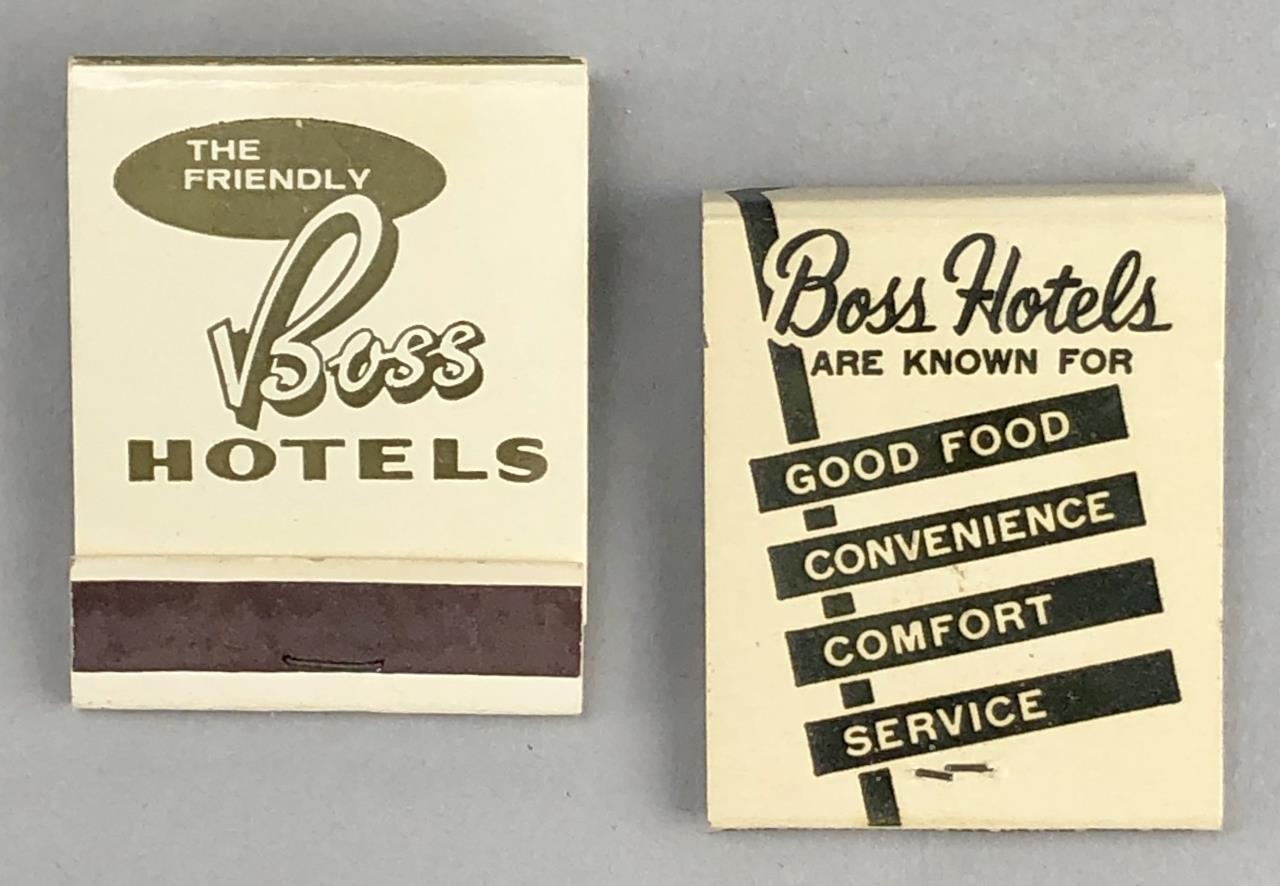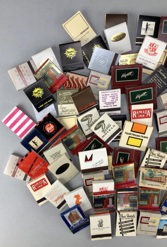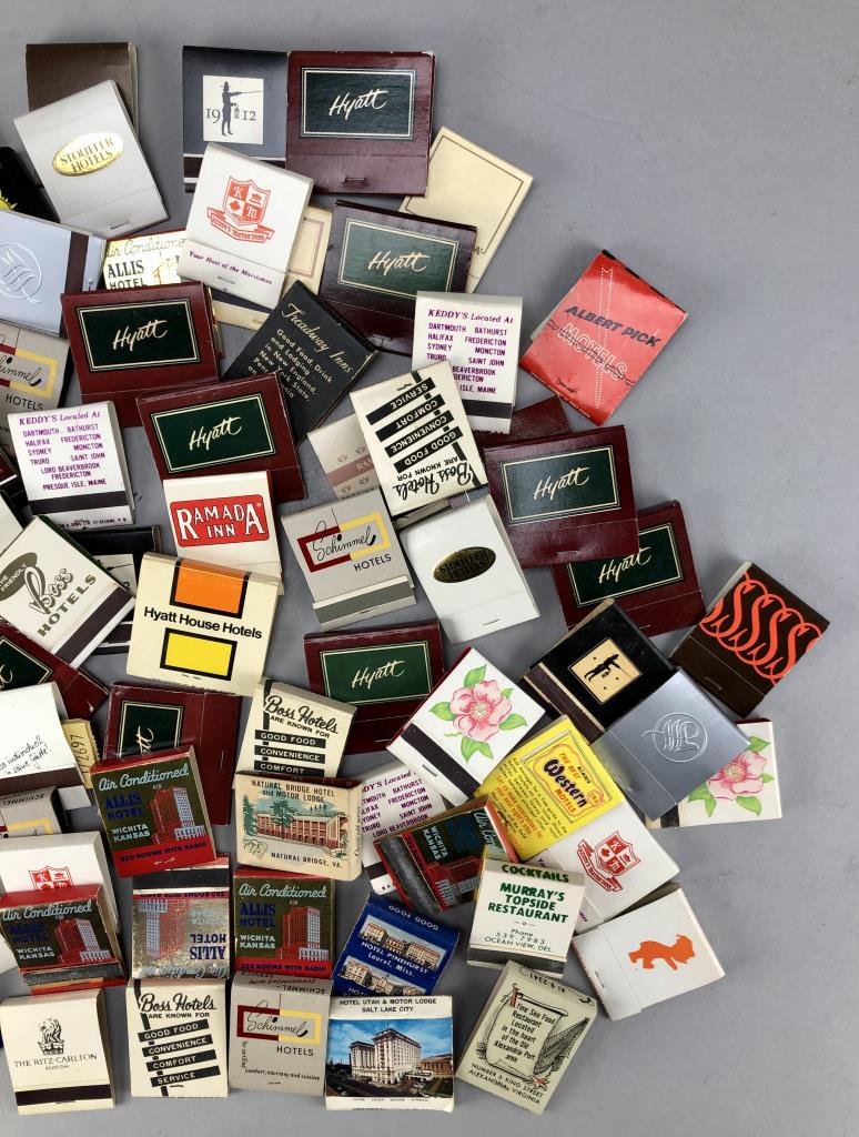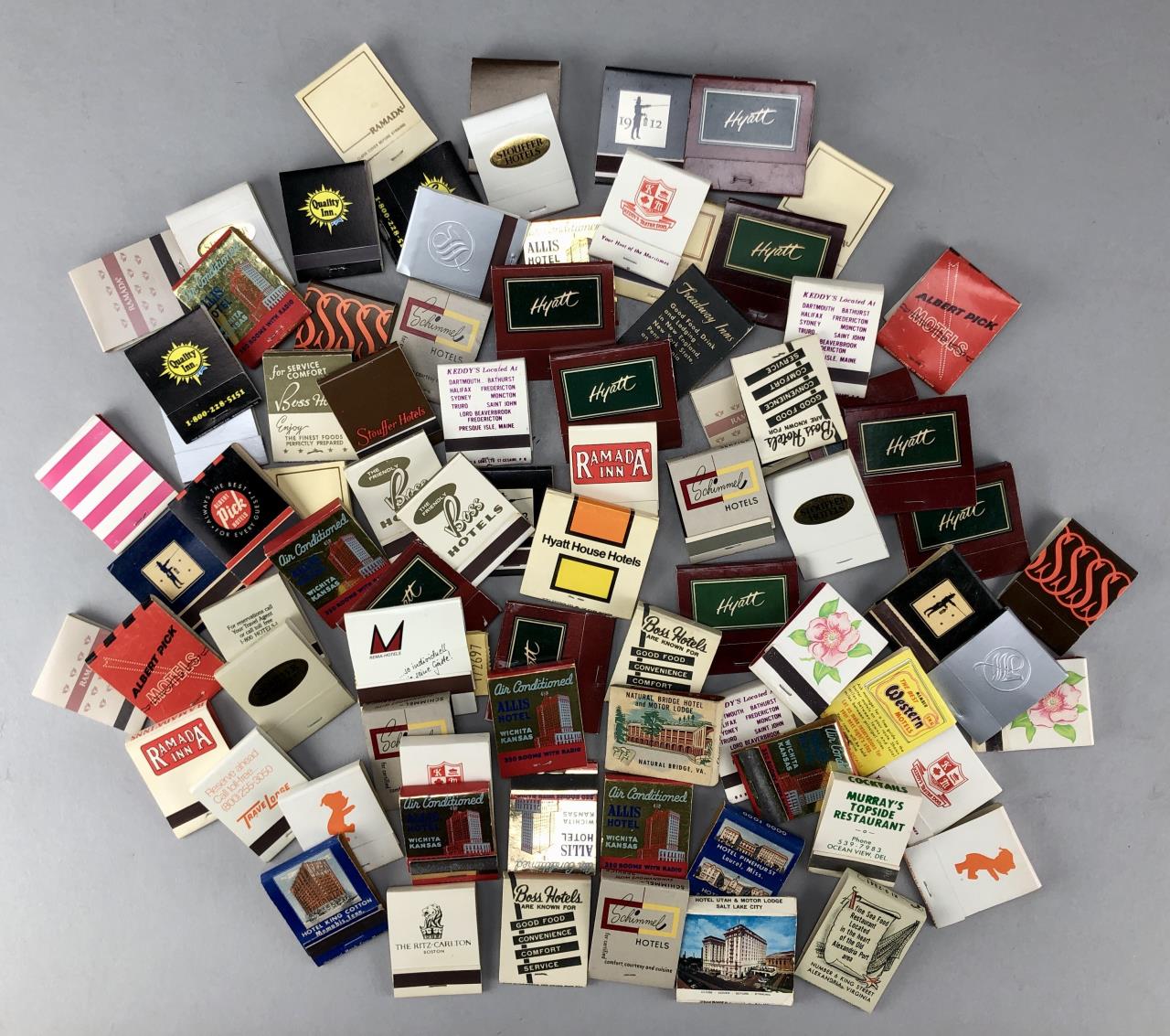 Matchbooks from various hotels, including Boss Hotels, Hyatt, Ramada, Travel Lodge, Quality Inn, Westin, Stouffer Hotels and Resorts, Albert Pick, Treadway Inns, Schimmel Hotels, and more; mid 20th Century.