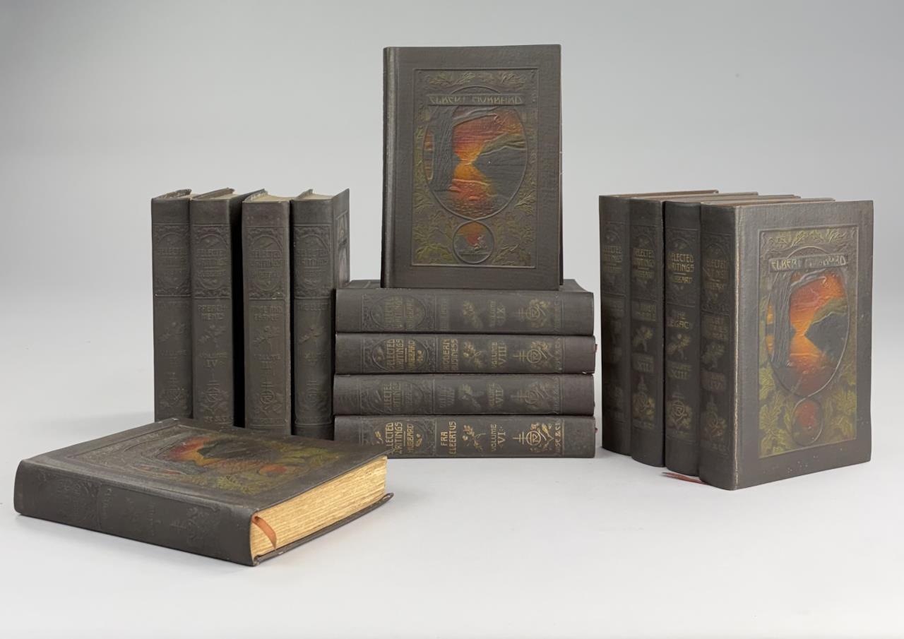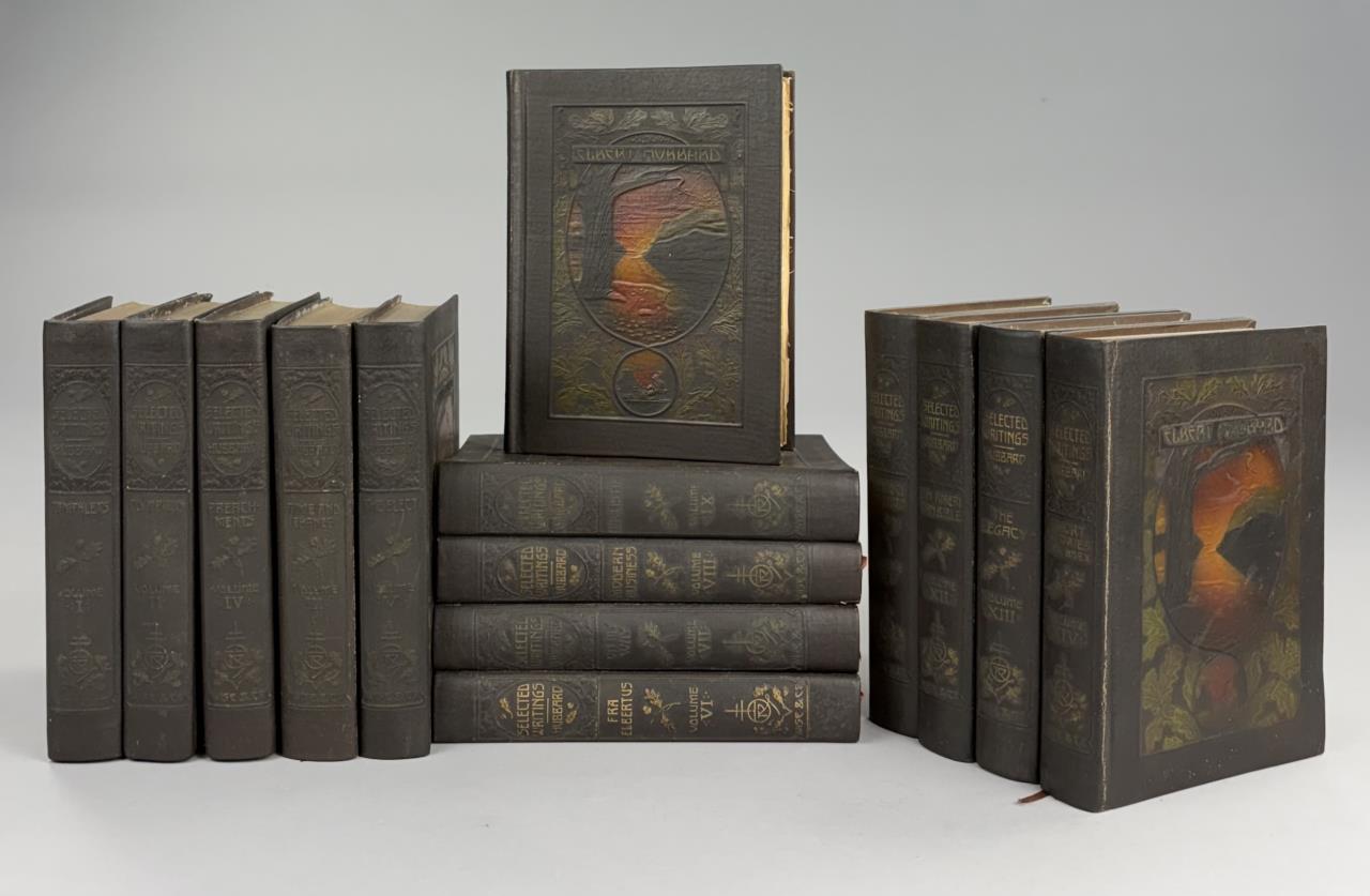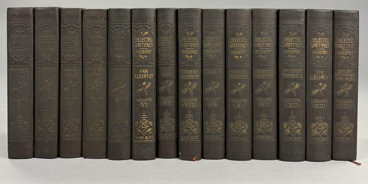 “Selected Writings of Elbert Hubbard” (American, 1856-1915) Memorial Edition Roycrofters/Arts and Crafts, full 14 Volumes, edited by Elbert Hubbard II (American, 1882-1970) New York: 1922; leatherette bindings.