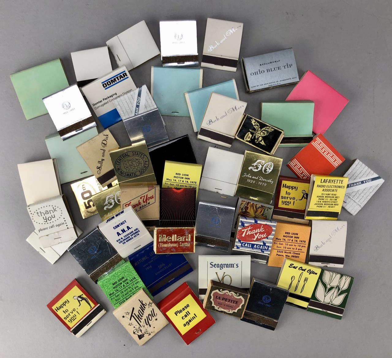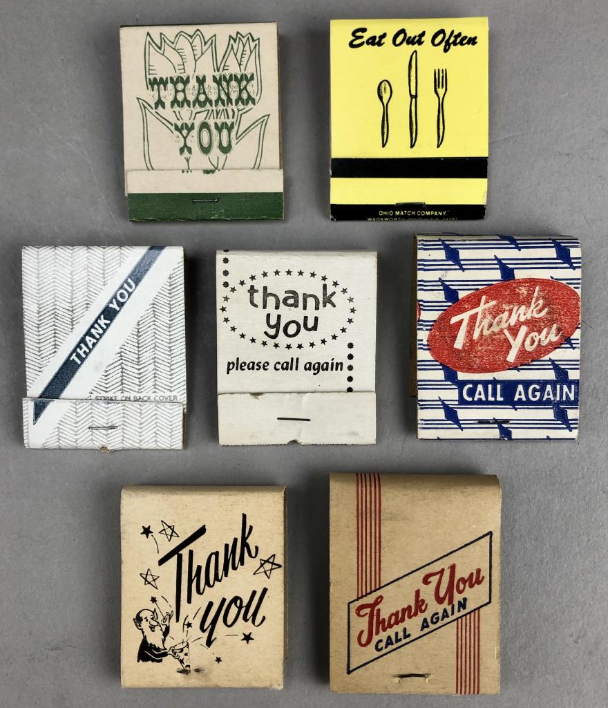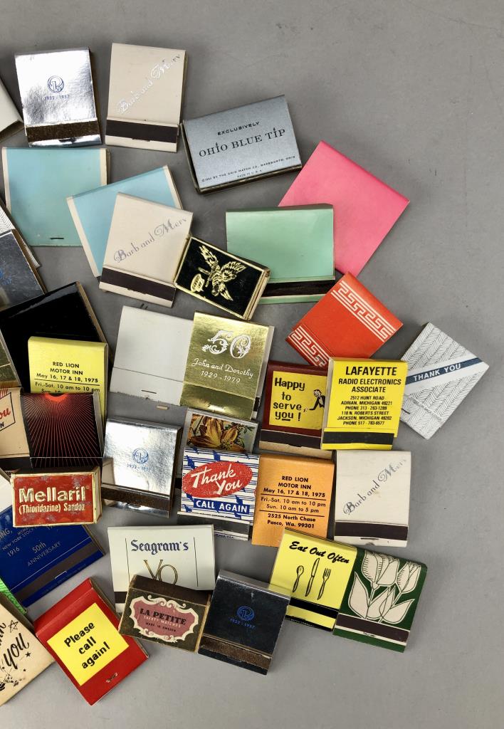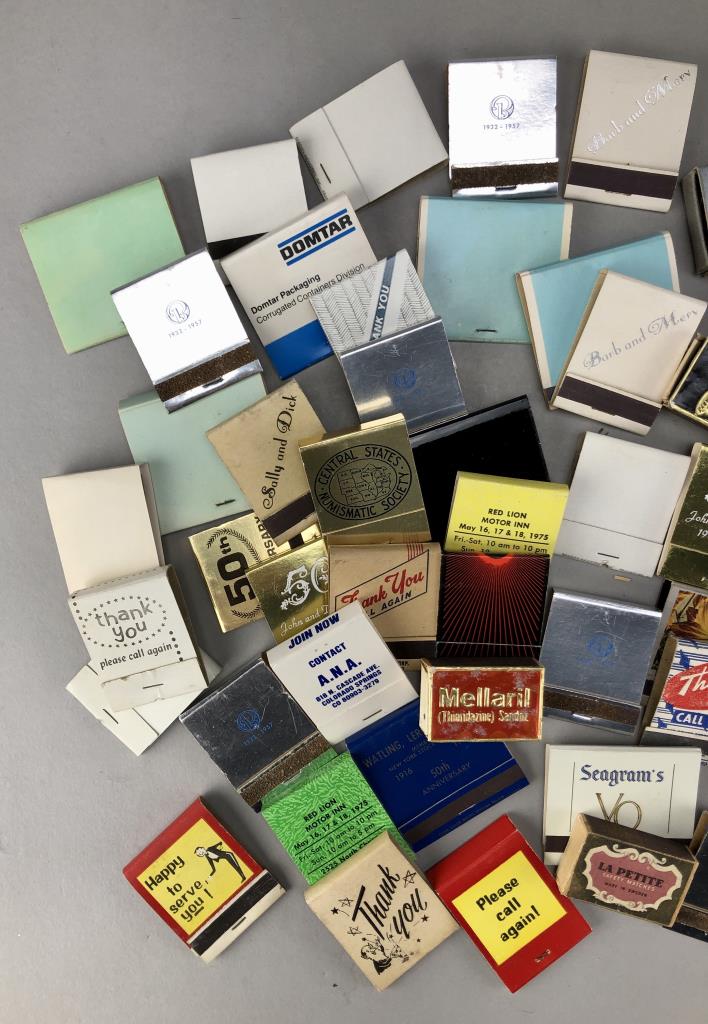 Assorted matchbooks, including Seagram, Thank You, commemorative, and more; mid 20th Century.