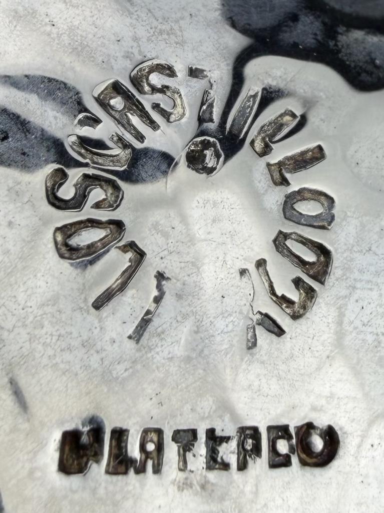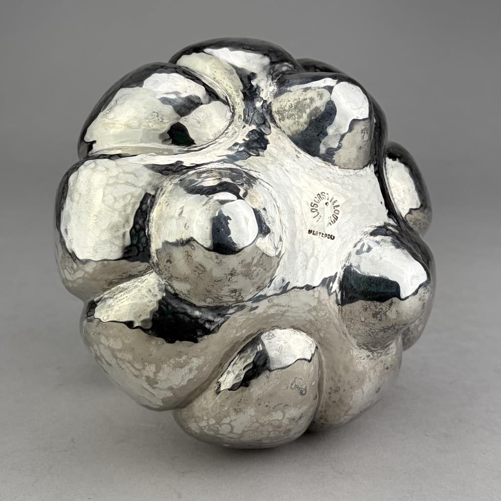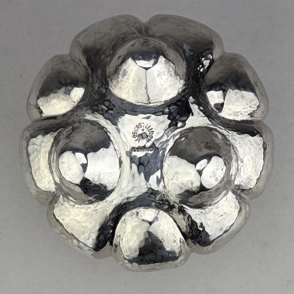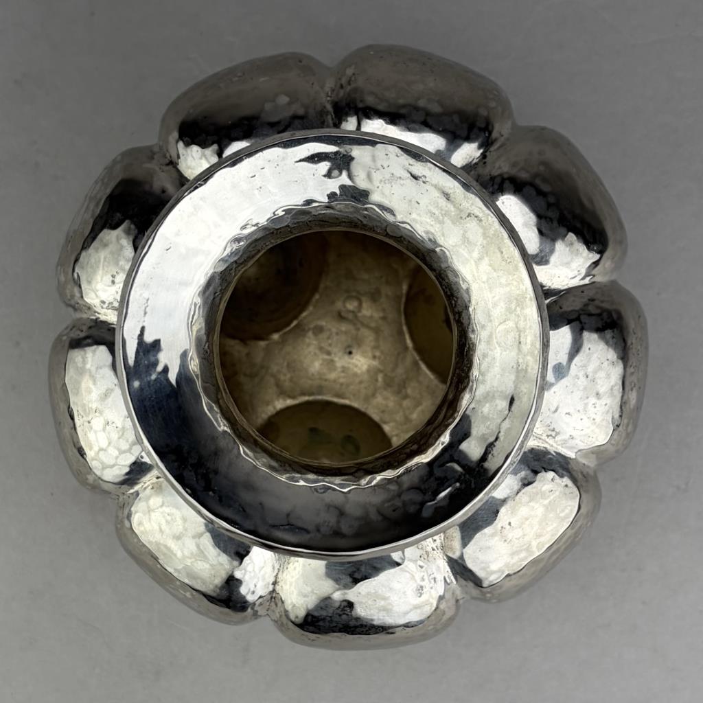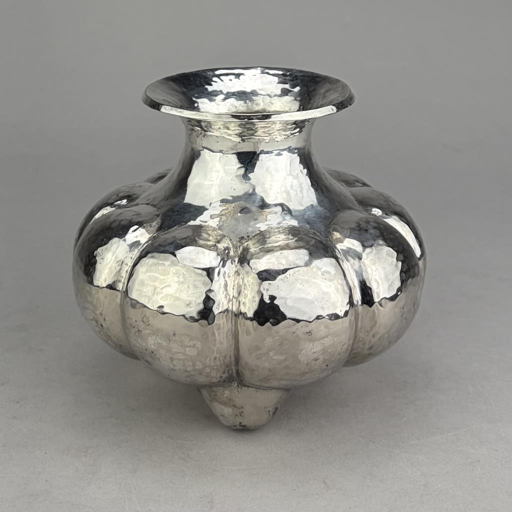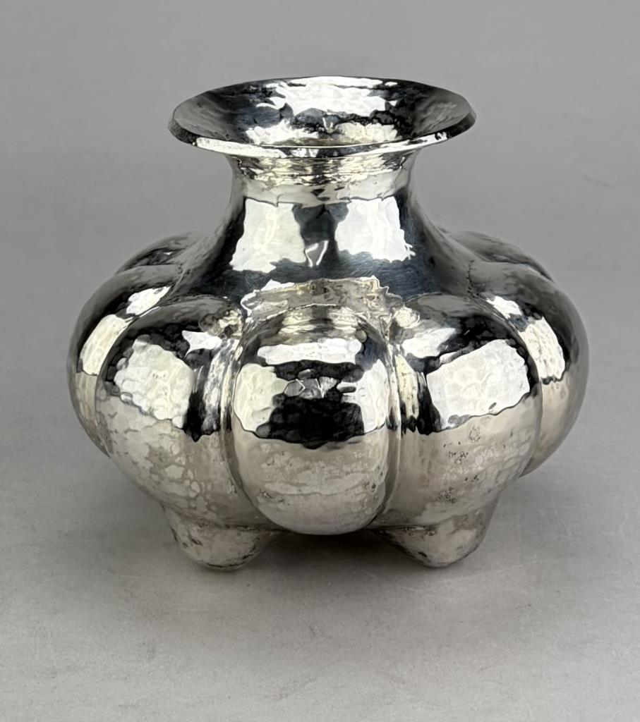 Los Castillo (Mexico) hand-hammered silverplated compressed form vase, featuring a flaring neck finishing in a wide rim, over a lobing bulbous body, atop three feet, stamped on underside “LOS CASTILLO, TAXCO, PLATEADO,” circa 1939-1962, 4-5/8″ (H) x 5-1/2″ (DIA).