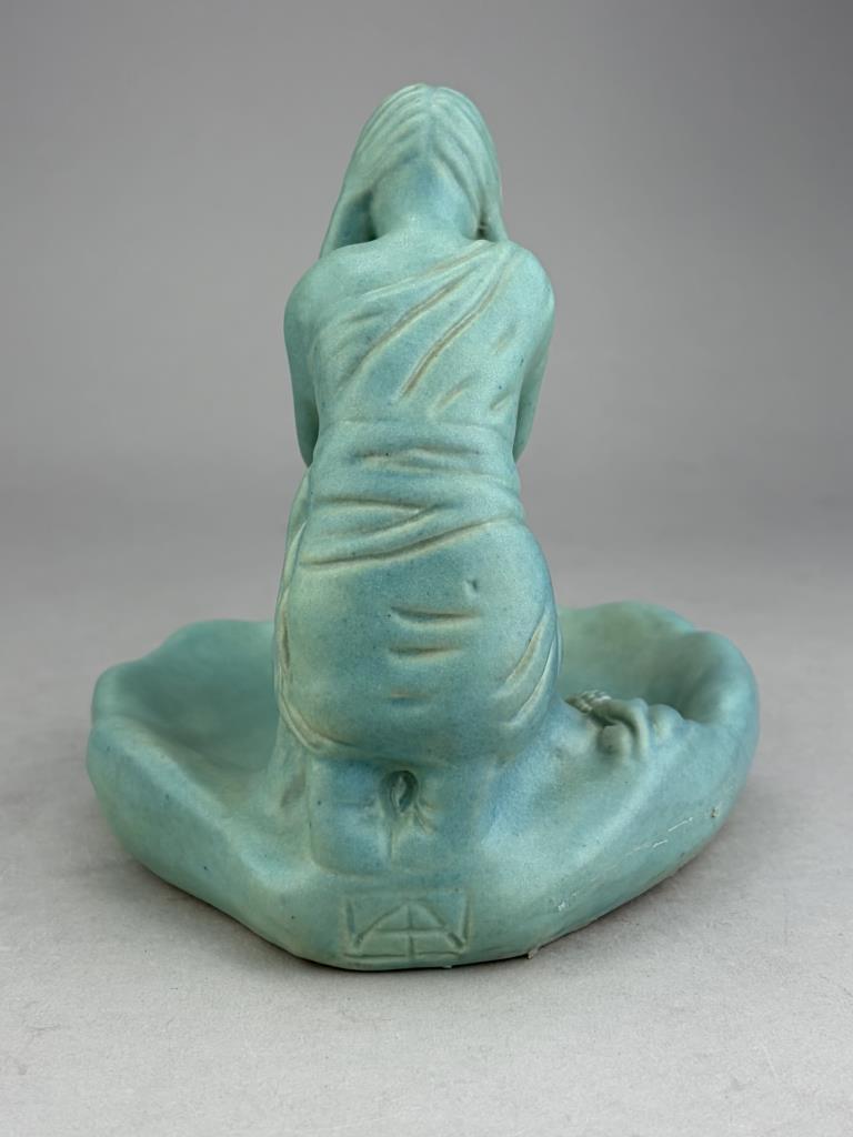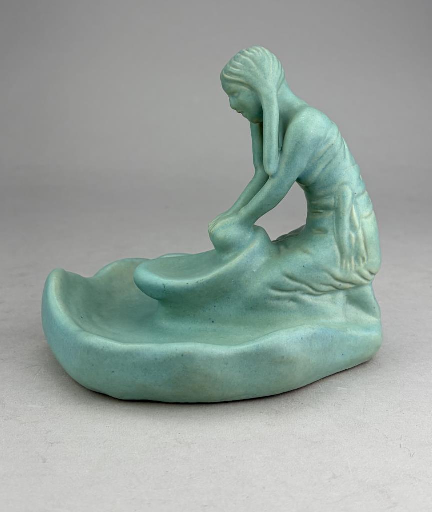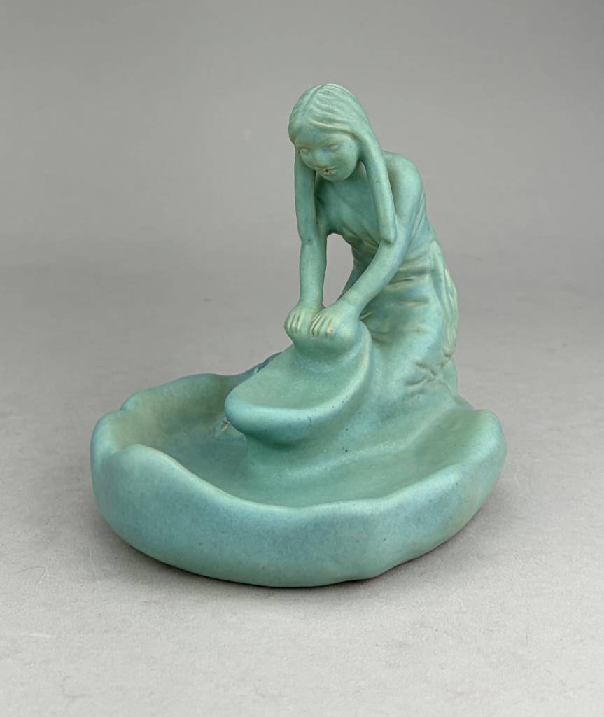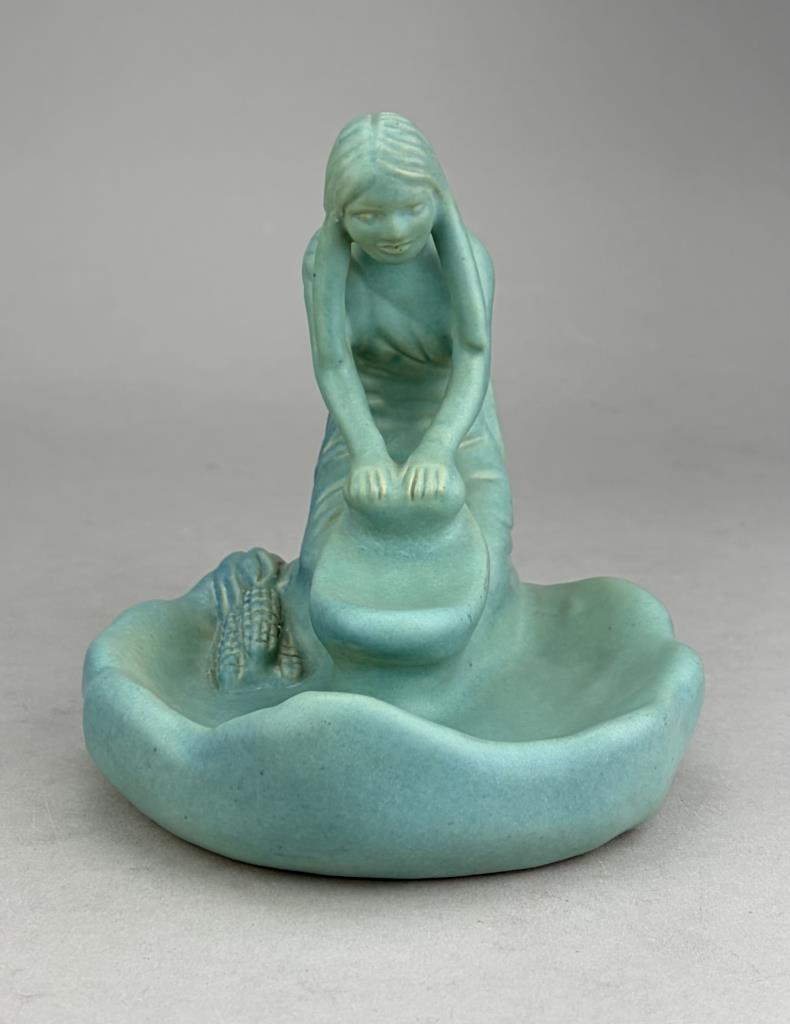 Van Briggle (Colorado Springs, Colorado), figural tray or shallow dish, depicting a kneeling Native American female figure grinding corn, in the iconic Van Briggle Ming Turquoise glaze, etched marks on bottom, 5-3/4″ (H).