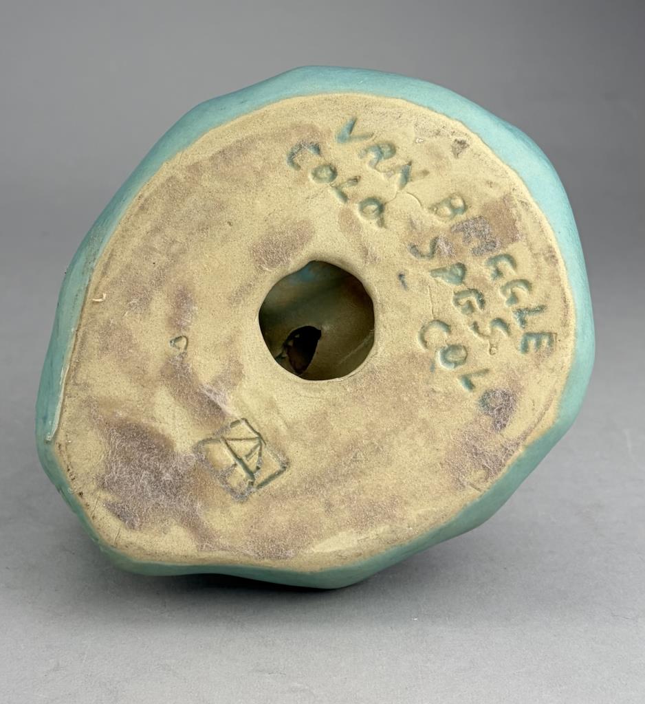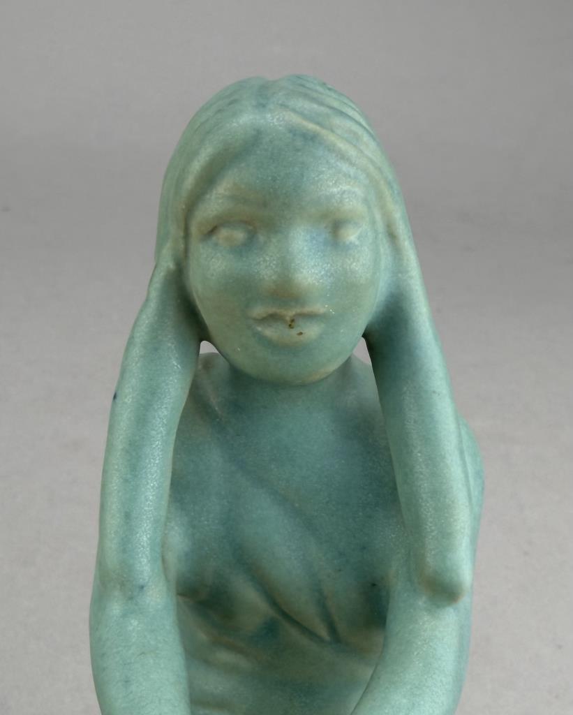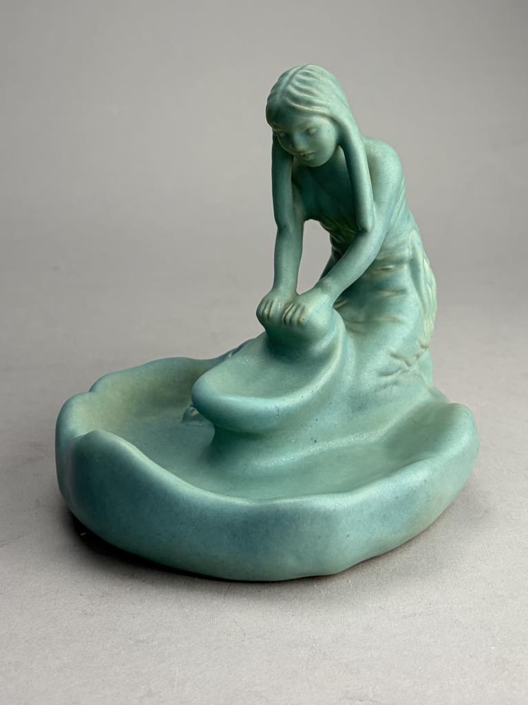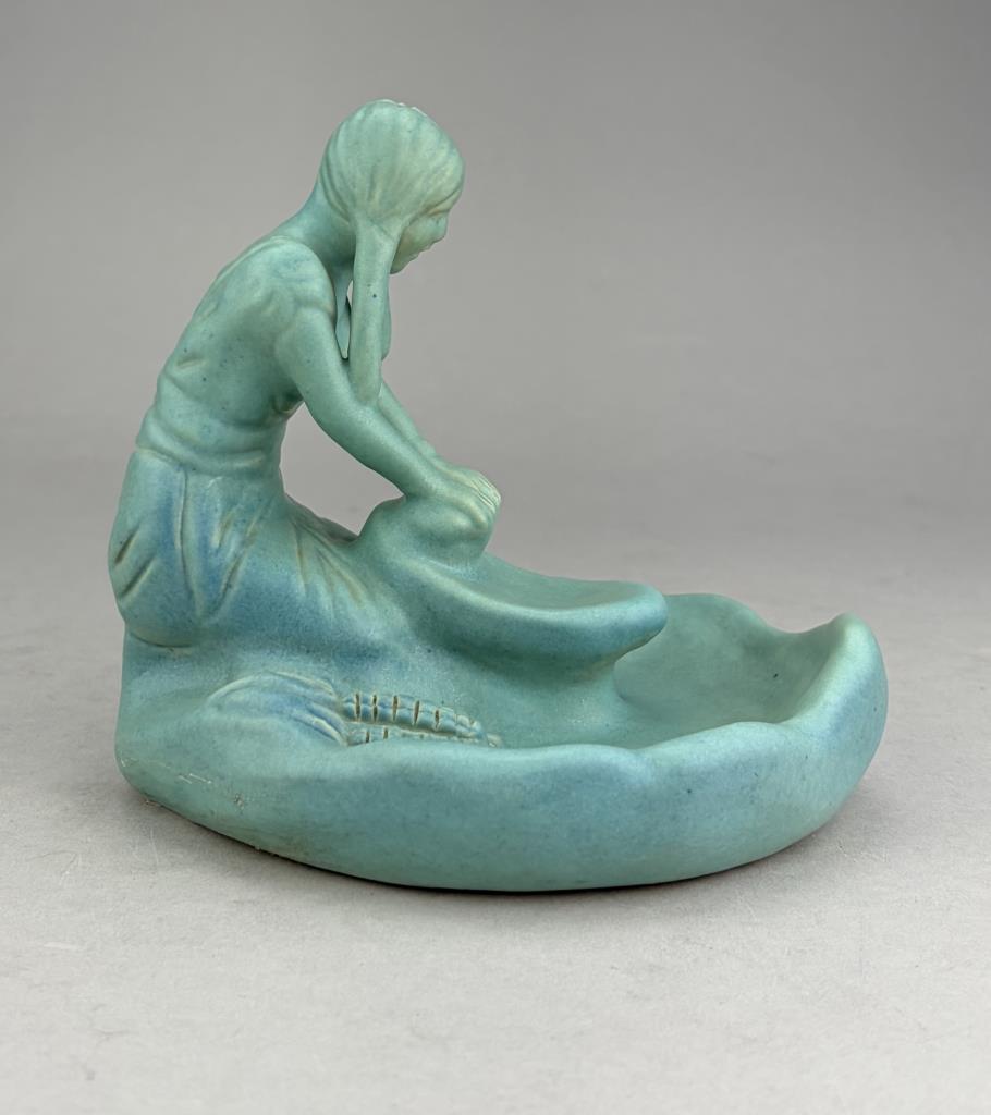 Van Briggle (Colorado Springs, Colorado), figural tray or shallow dish, depicting a kneeling Native American female figure grinding corn, in the iconic Van Briggle Ming Turquoise glaze, etched marks on bottom, 5-3/4″ (H).