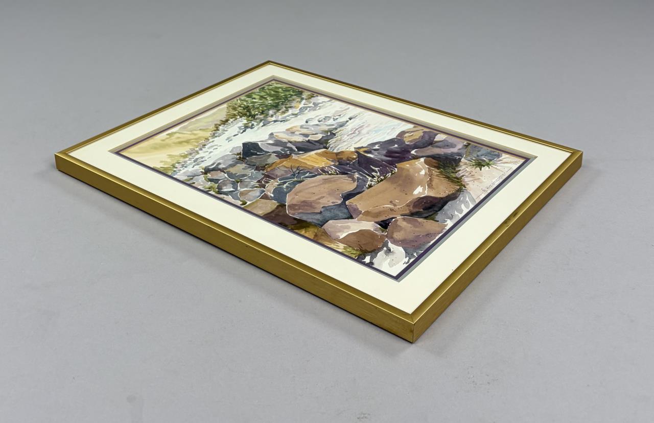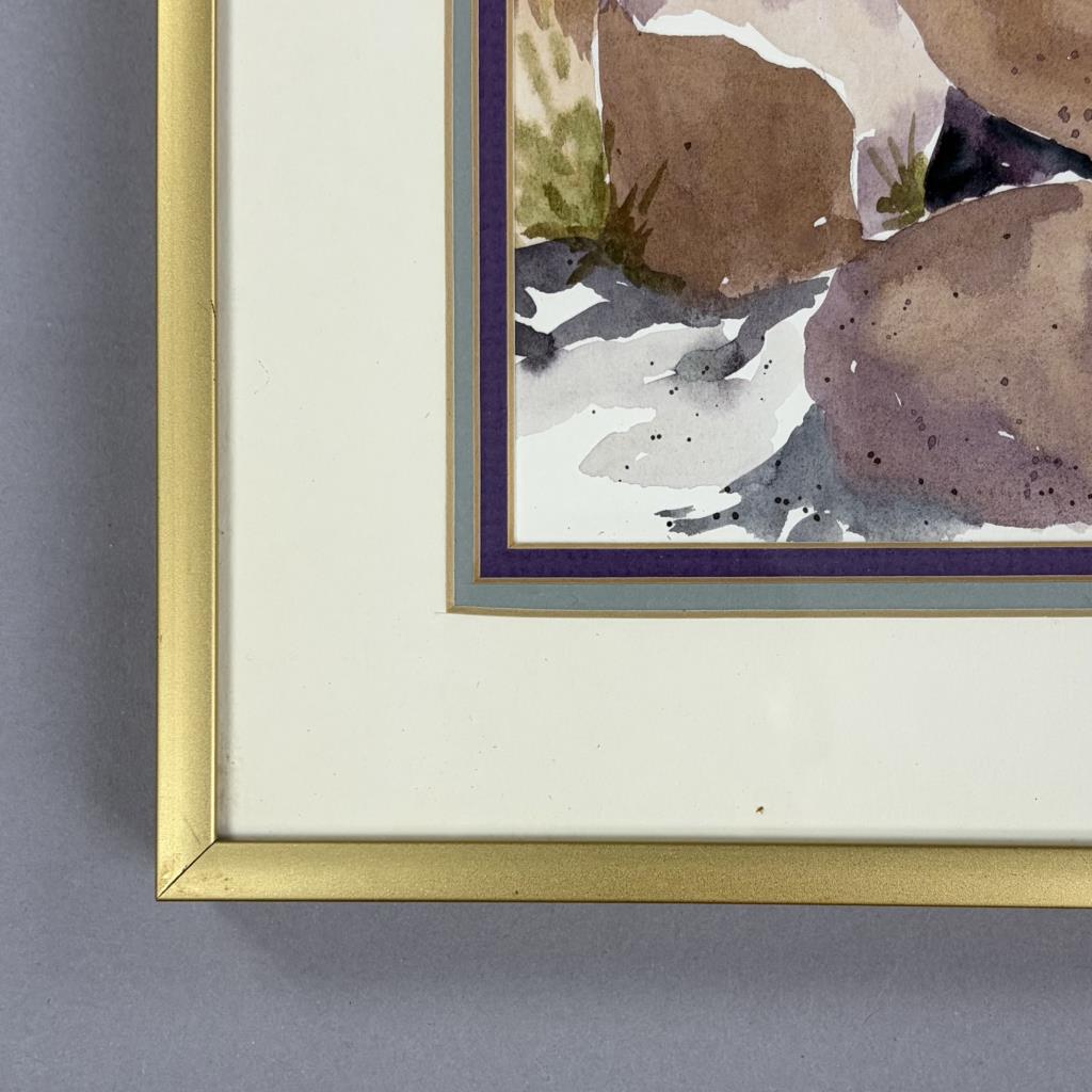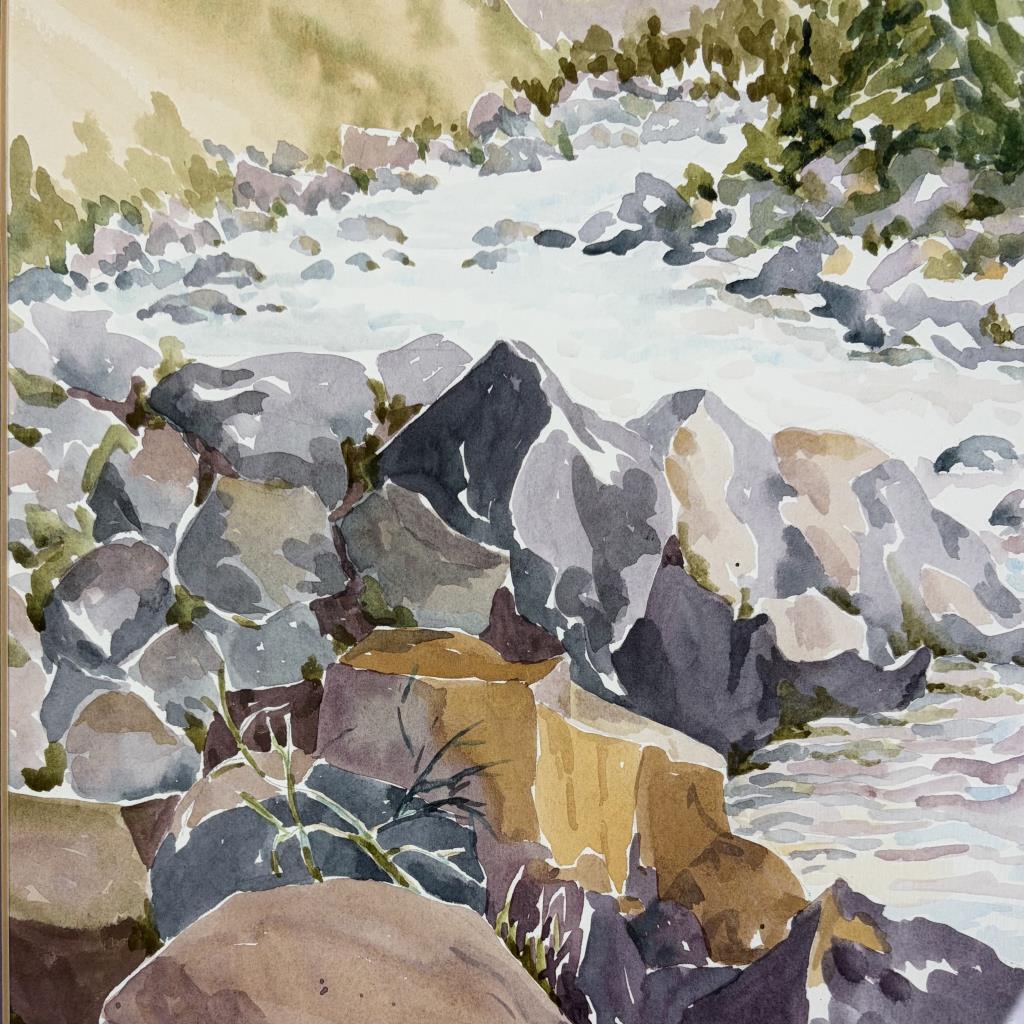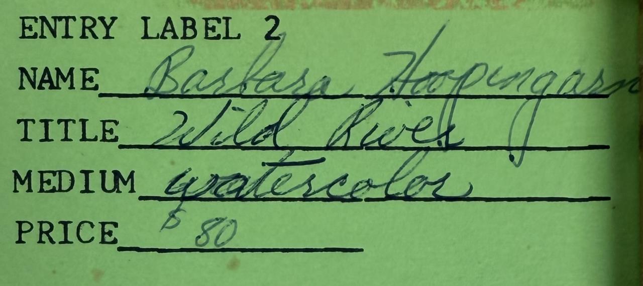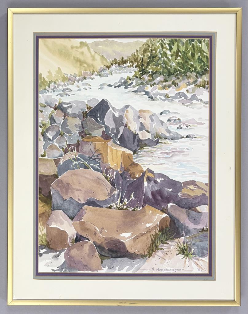 Barbara Marie Hoopingarner (Michigan, 1934-1999), watercolor painting on paper, identified and titled on back “Wild River”, signed “B. Hoopingarner” and dated “’87” lower right, in a period gold toned metal frame measuring 18-1/4″ x 14-1/4″. Hoopingarner was a member of the Lansing Watercolor Society, a master of color and developed many of her own colors. It is rumoured that Crayola at one point bought one of her colors to add to their line of crayons.