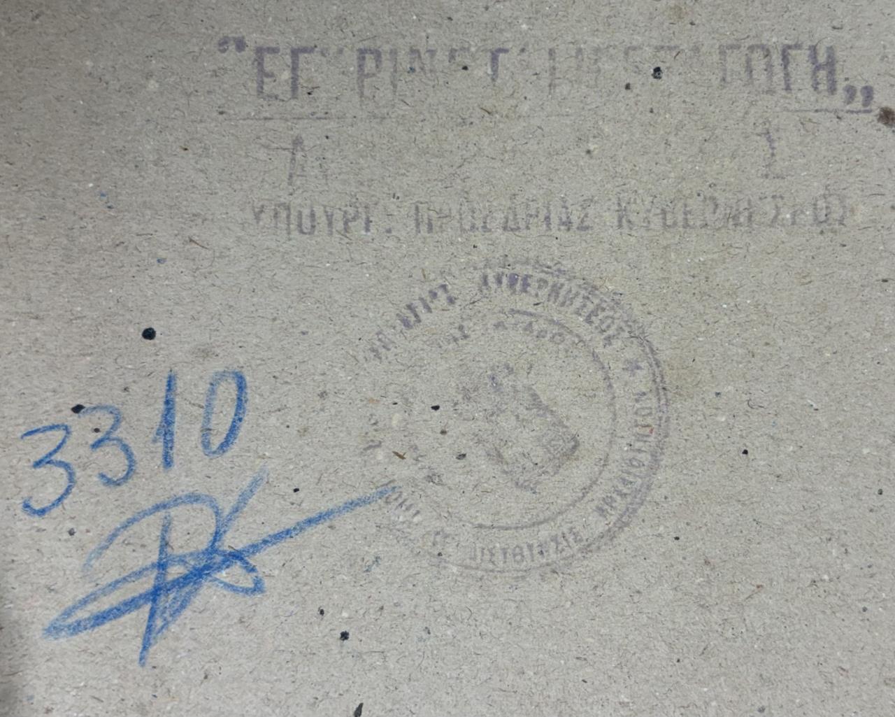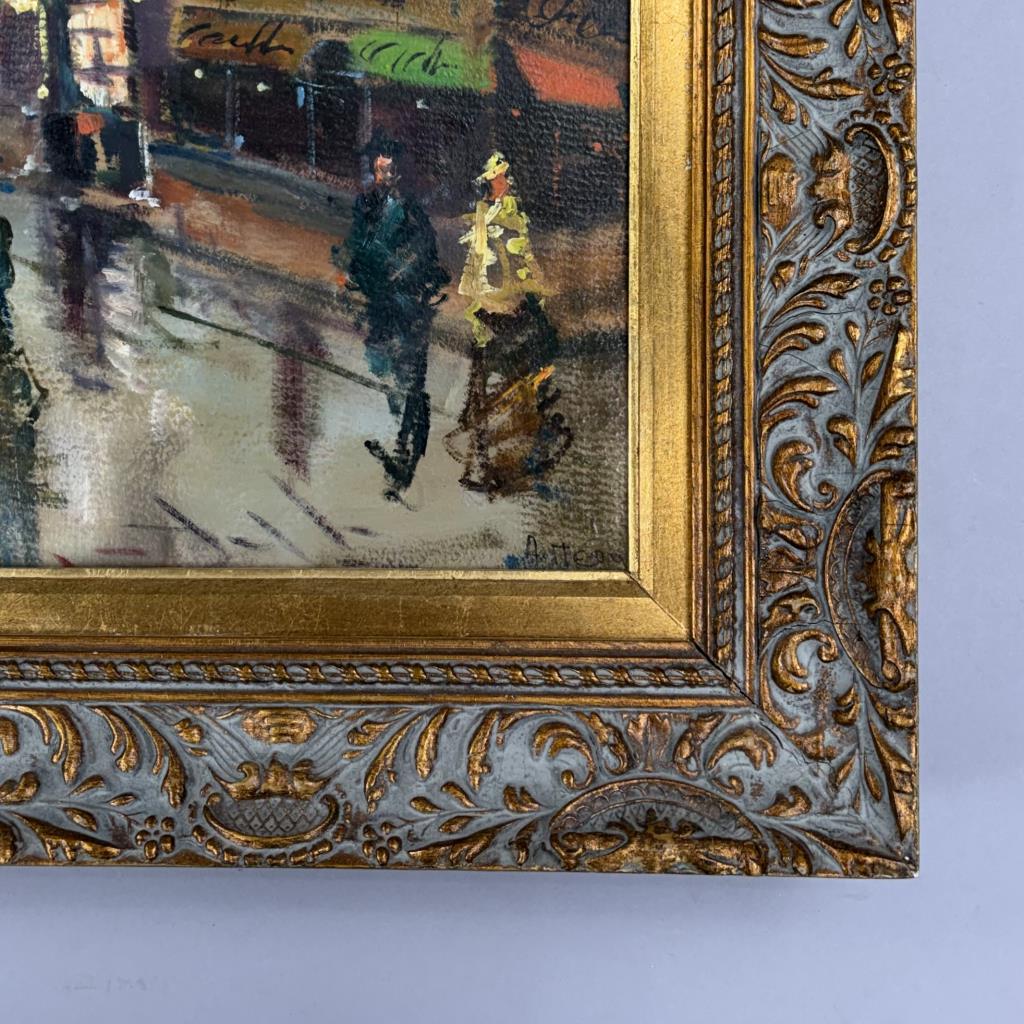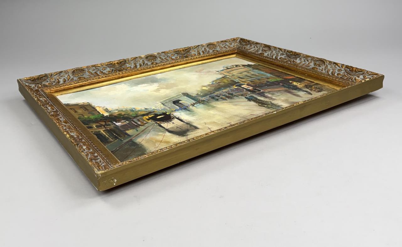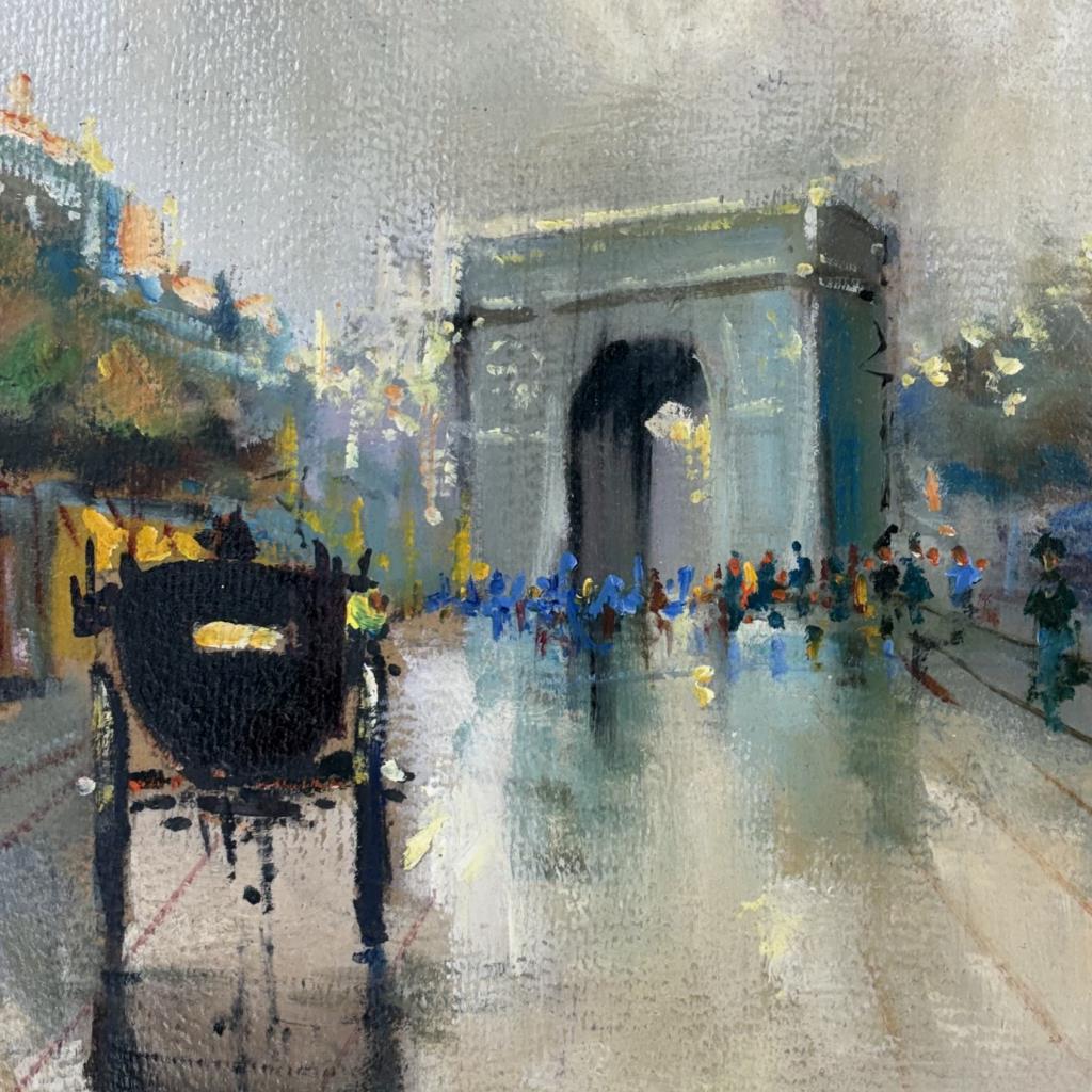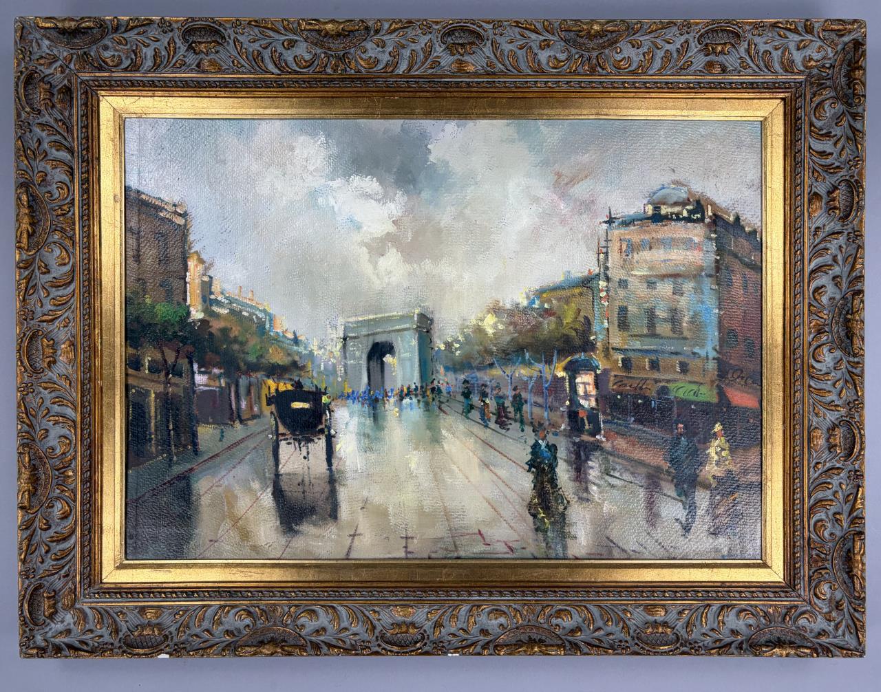 Mid-Century Modern impressionist style oil painting on board, depicting a bustling 19th century Parisian street scene with the Arc de Triomphe in the background, signed lower right, possibly in Greek, circa 1950s / 1960s, in a gilt and gesso frame measuring 26-3/4″ x 35-1/2″.