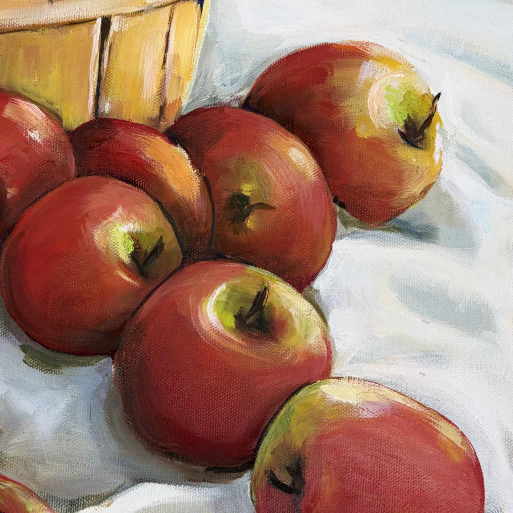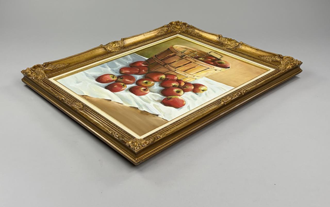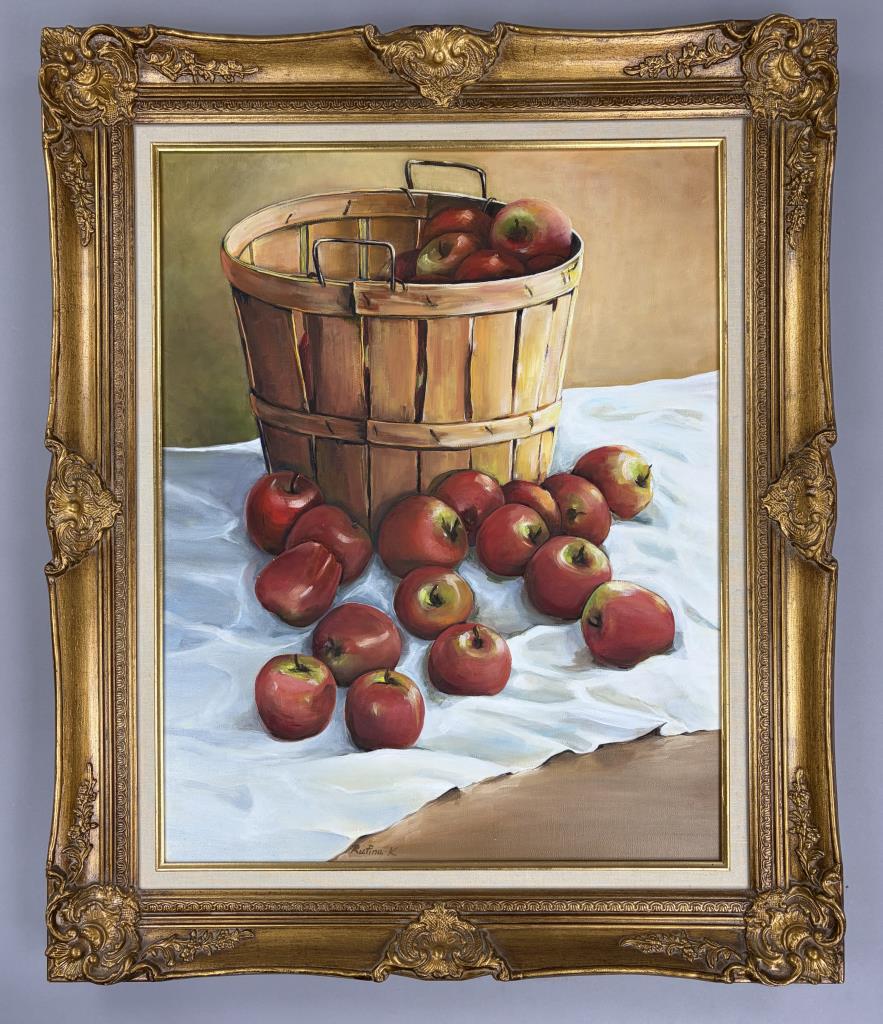 Still life oil painting of apples and basket, signed “Rufina, K.” lower center, and dated on back 1989, in a period gilt and gesso frame measuring 35-3/8″ x 29-3/8″, from the estate of Lansing heart surgeon, philanthropist, and art collector, Dr. Seong Hae Chi.