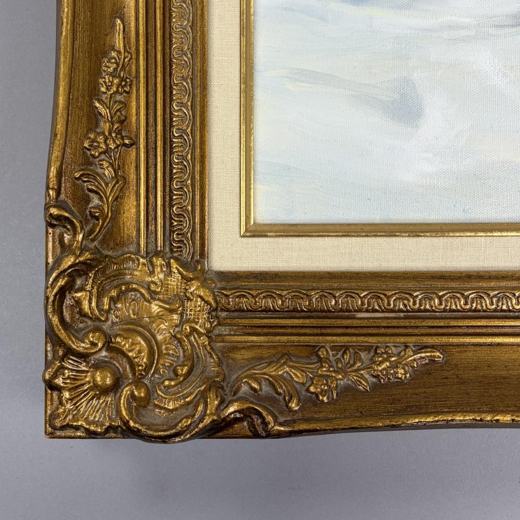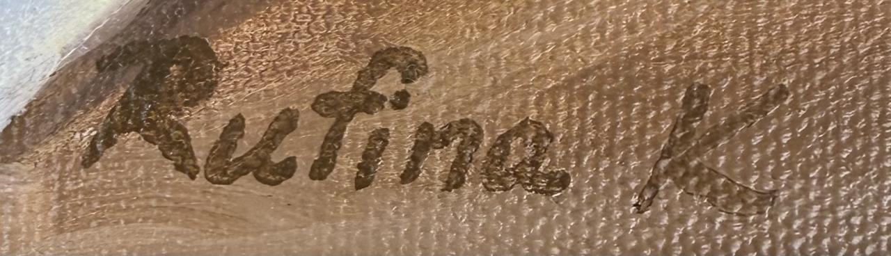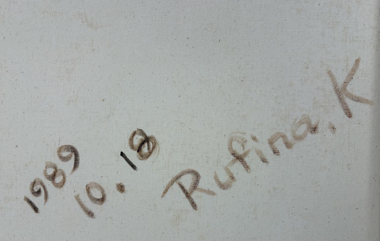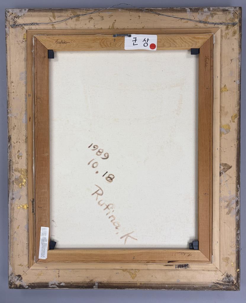 Still life oil painting of apples and basket, signed “Rufina, K.” lower center, and dated on back 1989, in a period gilt and gesso frame measuring 35-3/8″ x 29-3/8″, from the estate of Lansing heart surgeon, philanthropist, and art collector, Dr. Seong Hae Chi.