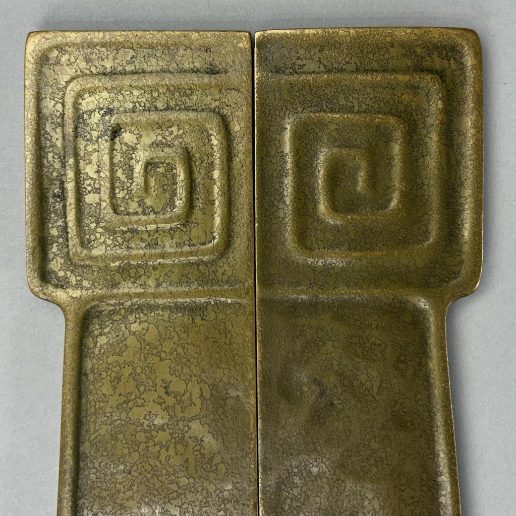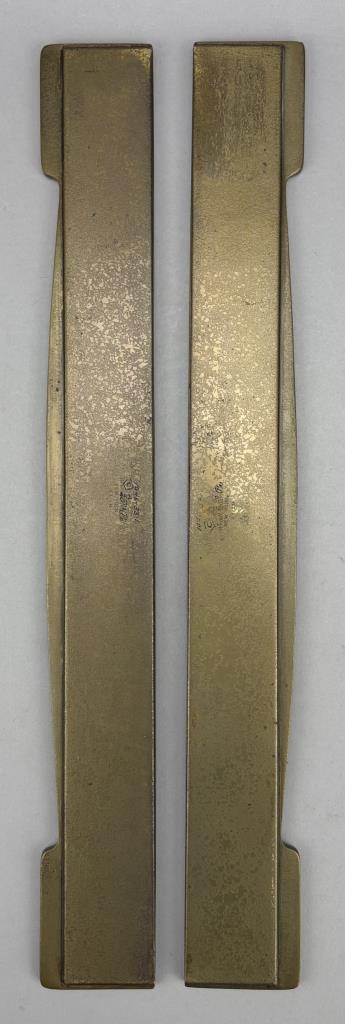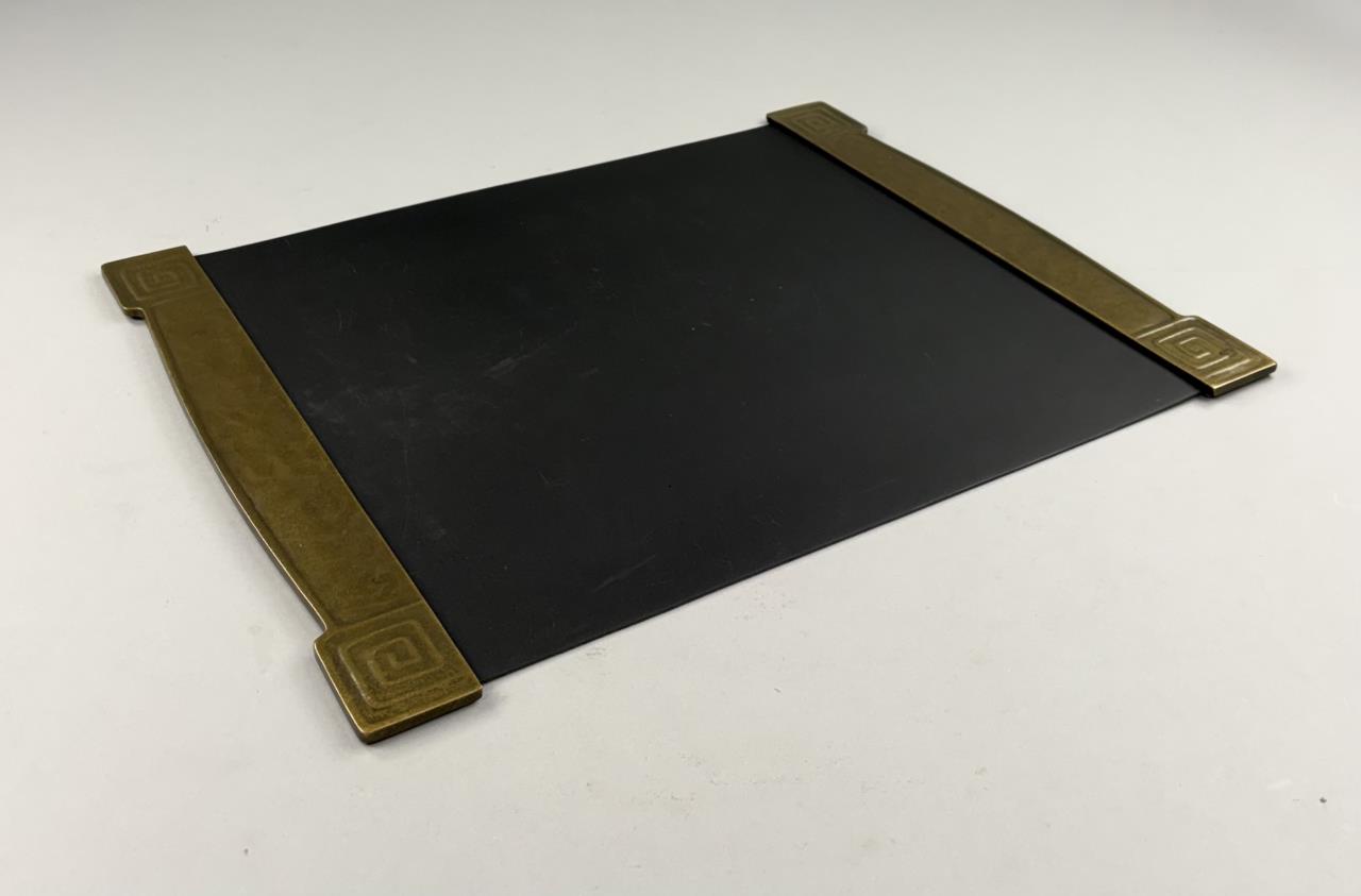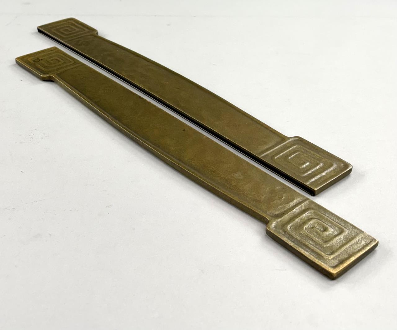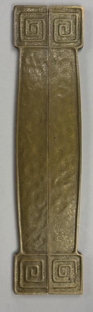Tiffany Studios (New York City), Arts and Crafts Movement desk blotter ends, in the “Modeled” pattern, also sometimes know as the “Greek Key” or the “Meander” pattern, marked on underside, gilt bronze, circa 1920s, each measuring 19-1/4″ x 2-1/4″. Comes with a later desk pad. Reference: “Tiffany Desk Treasures; A Collectors Guide”, by George A. Kemeny and Donald Miller, 2002, pp. 46-49.