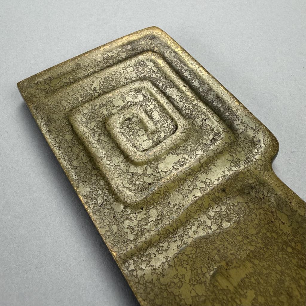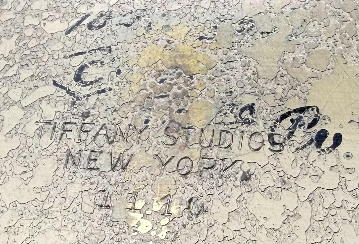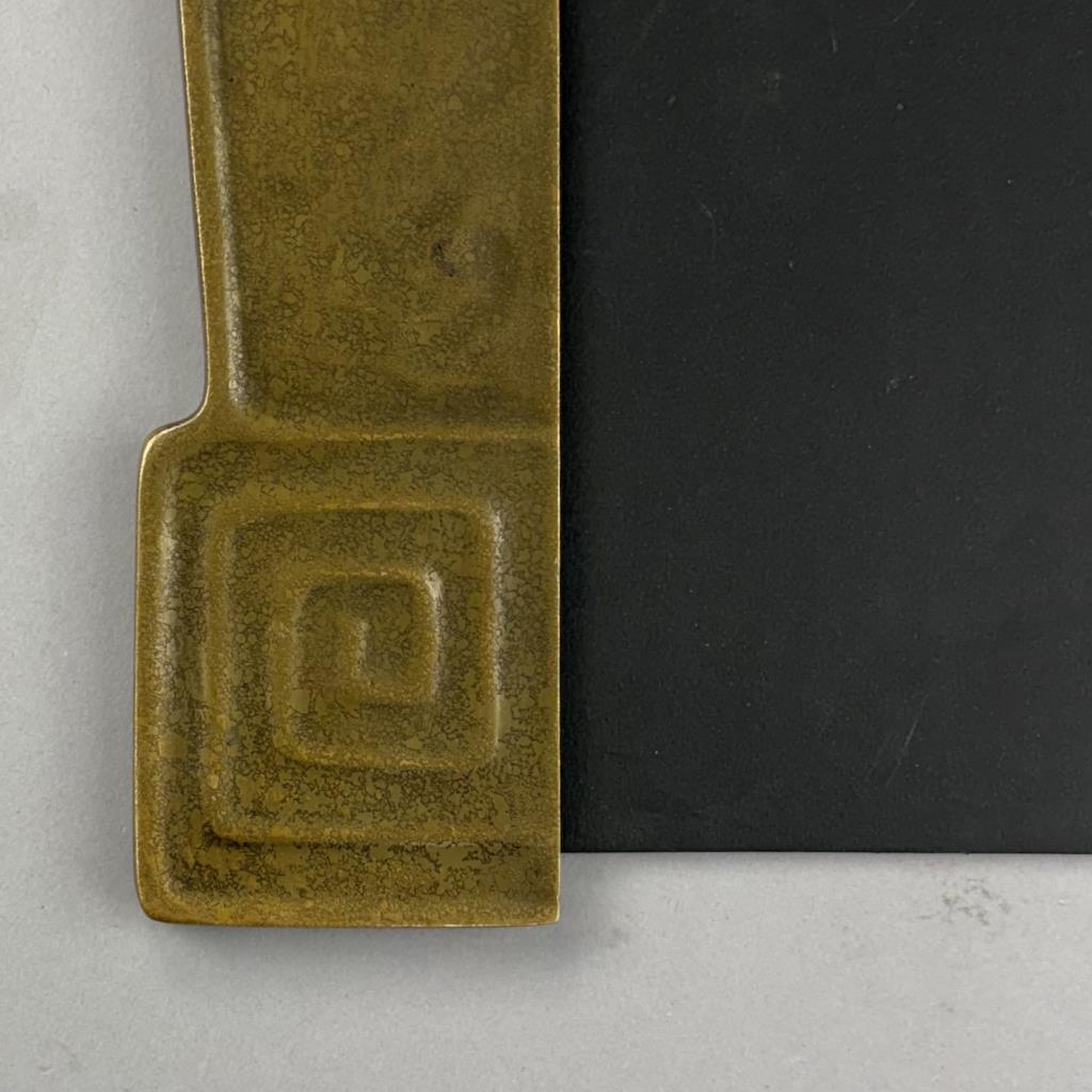 Tiffany Studios (New York City), Arts and Crafts Movement desk blotter ends, in the “Modeled” pattern, also sometimes know as the “Greek Key” or the “Meander” pattern, marked on underside, gilt bronze, circa 1920s, each measuring 19-1/4″ x 2-1/4″. Comes with a later desk pad. Reference: “Tiffany Desk Treasures; A Collectors Guide”, by George A. Kemeny and Donald Miller, 2002, pp. 46-49.