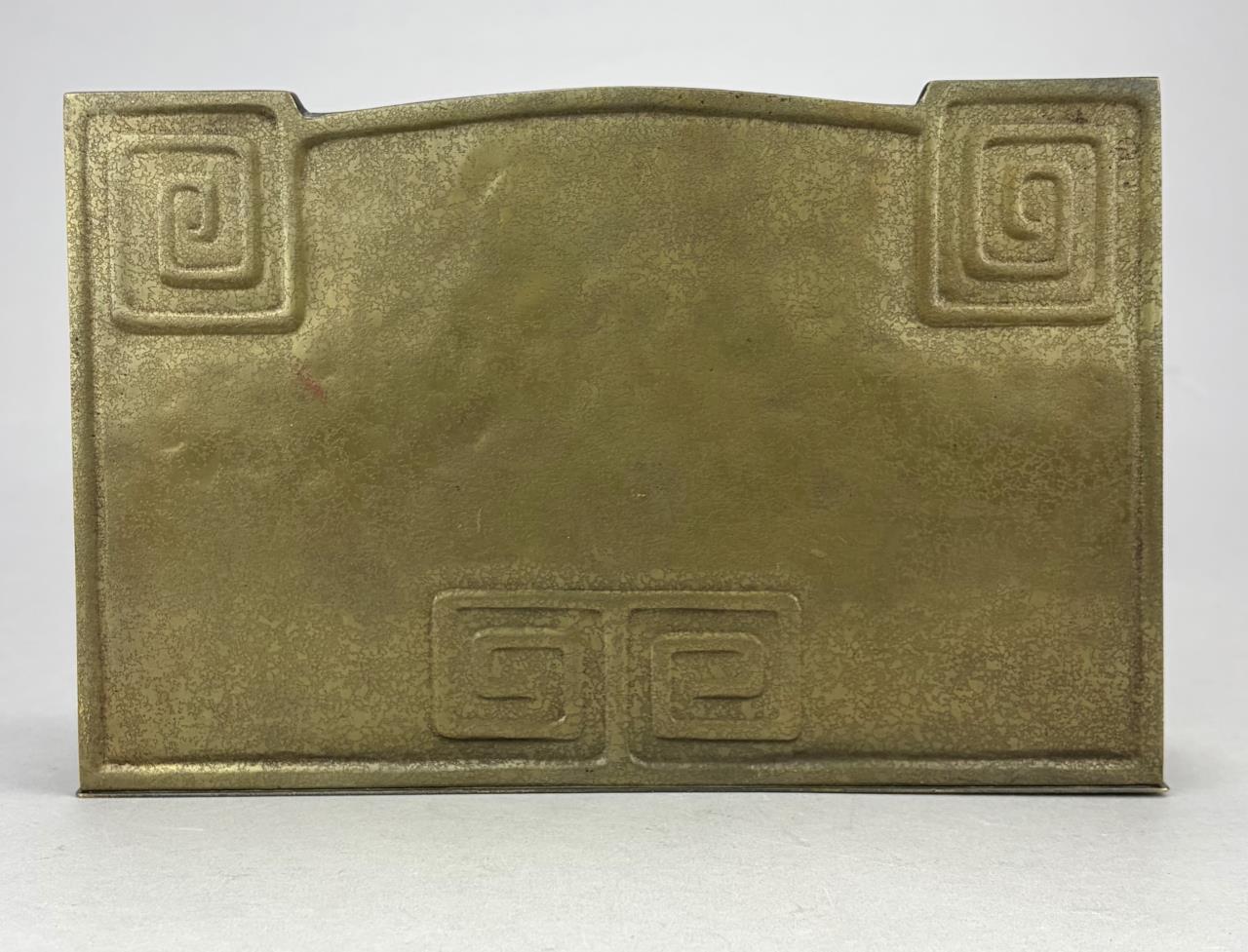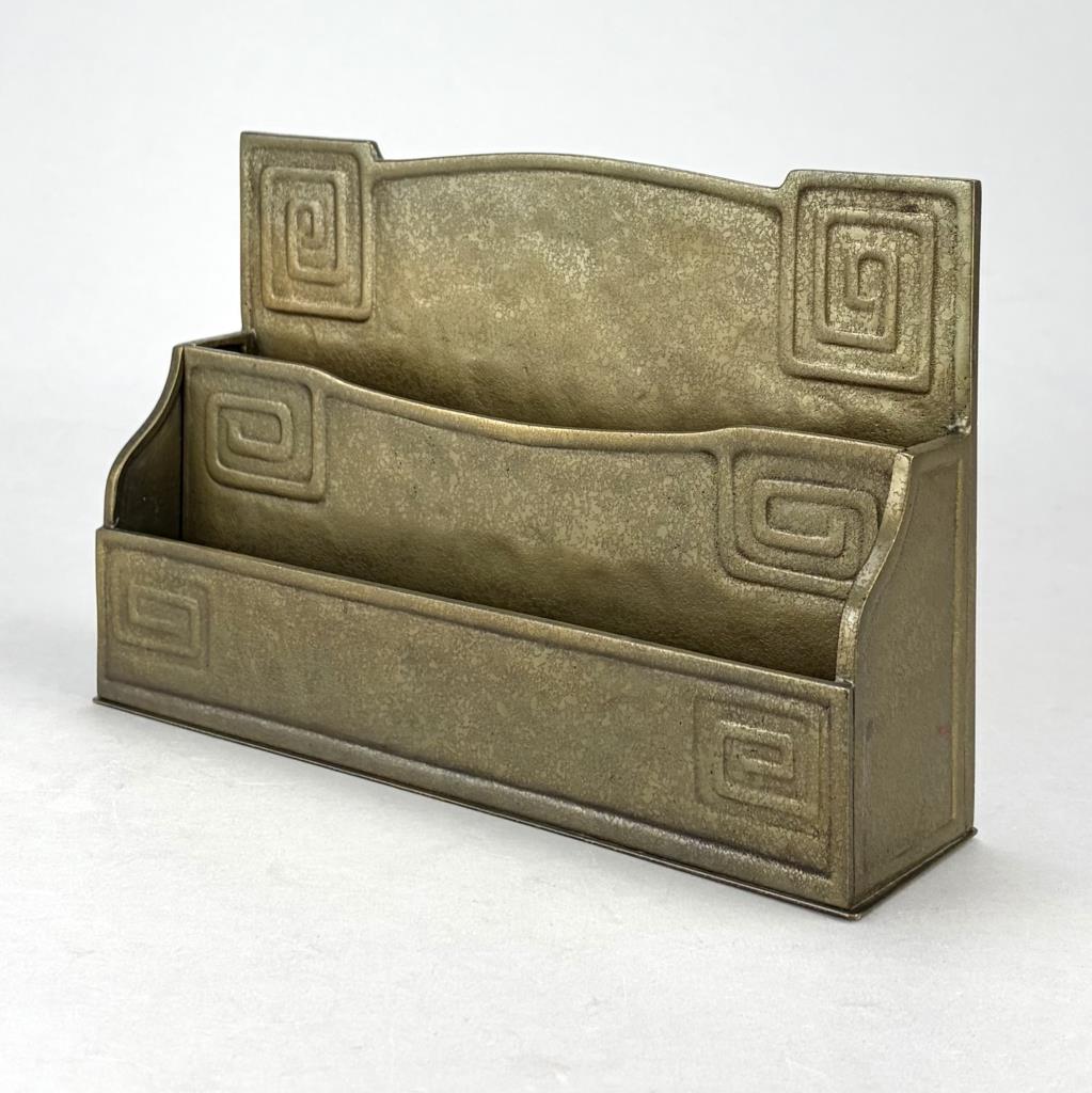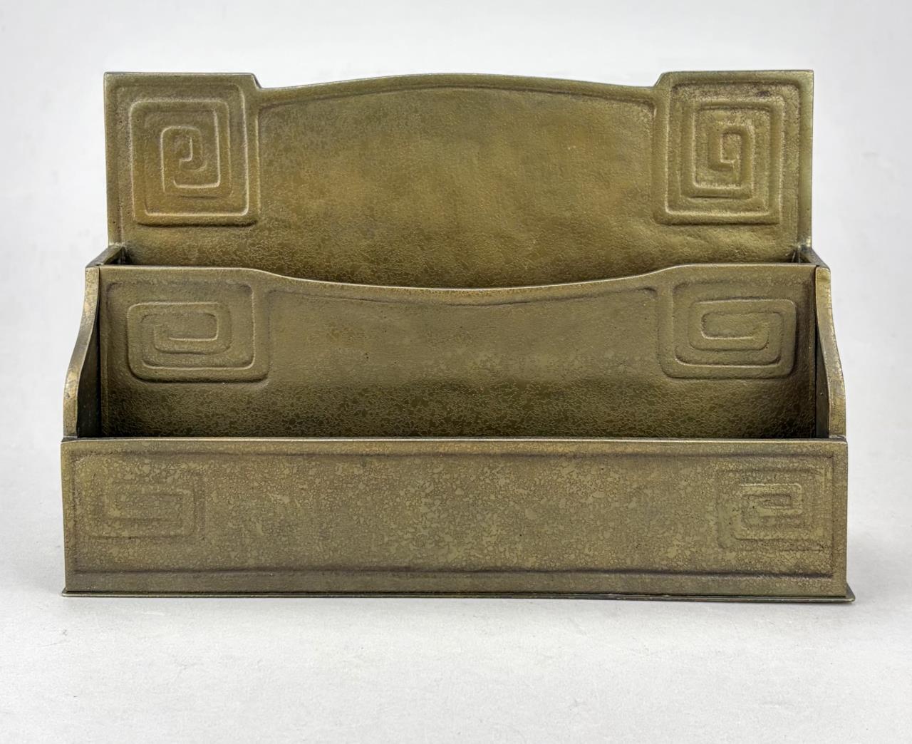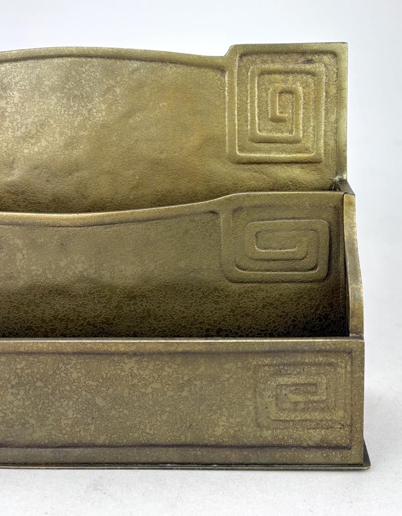 Tiffany Studios (New York City), Arts and Crafts Movement desk letter rack, in the”Modeled” pattern, also sometimes know as the “Greek Key” or the “Meander” pattern, marked on underside, gilt bronze, circa 1920s, 2-3/8″ x 9-3/8″ x 6-1/16″. Reference: “Tiffany Desk Treasures; A Collectors Guide”, by George A. Kemeny and Donald Miller, 2002, pp. 46-49.