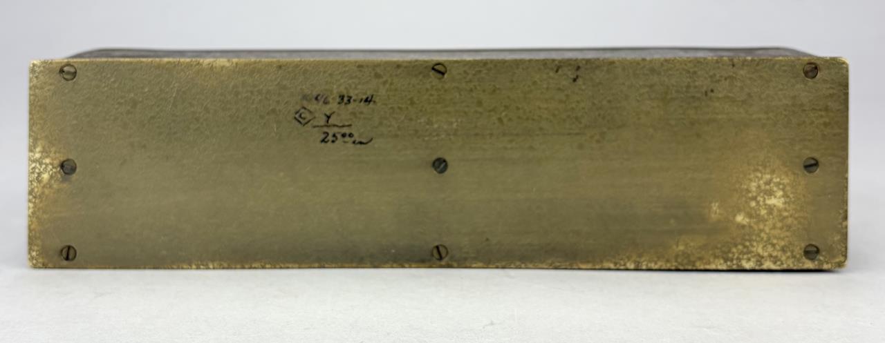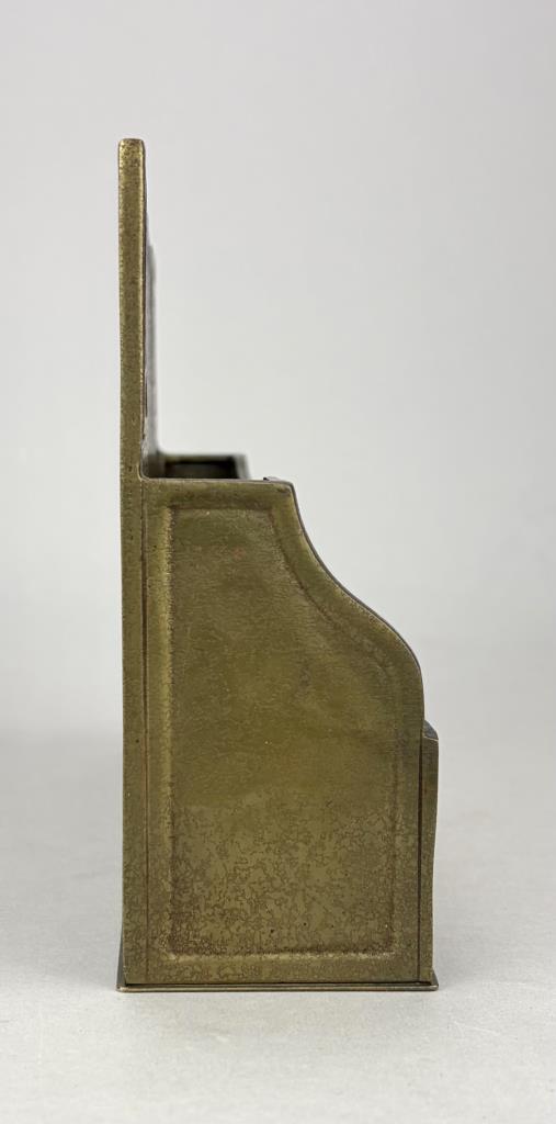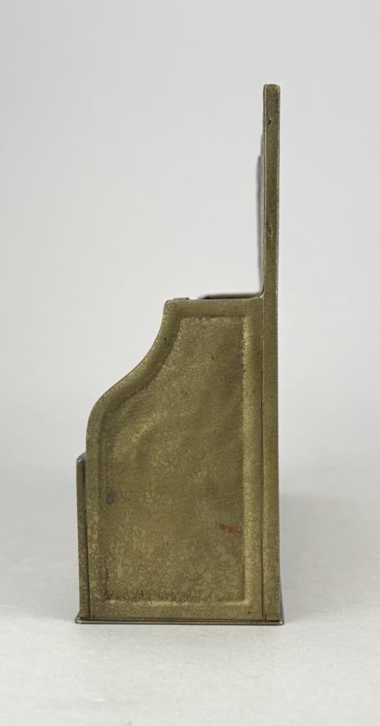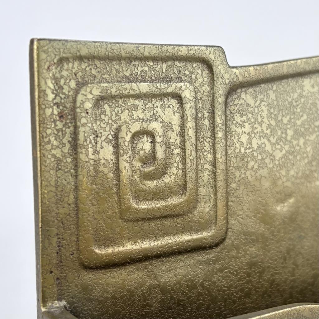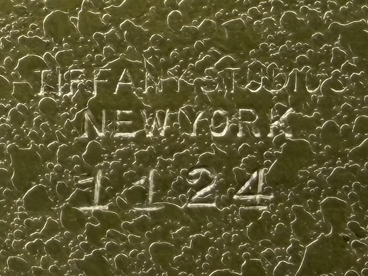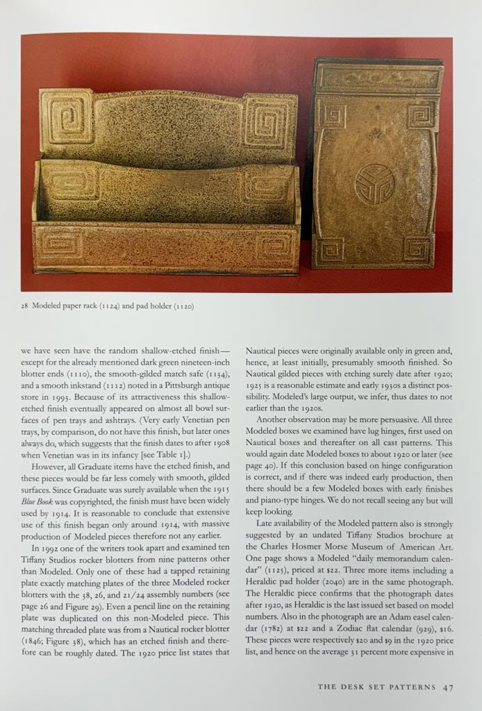 Tiffany Studios (New York City), Arts and Crafts Movement desk letter rack, in the”Modeled” pattern, also sometimes know as the “Greek Key” or the “Meander” pattern, marked on underside, gilt bronze, circa 1920s, 2-3/8″ x 9-3/8″ x 6-1/16″. Reference: “Tiffany Desk Treasures; A Collectors Guide”, by George A. Kemeny and Donald Miller, 2002, pp. 46-49.