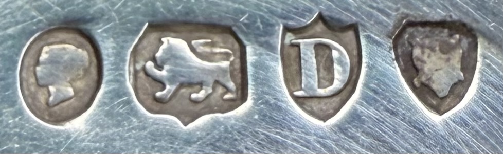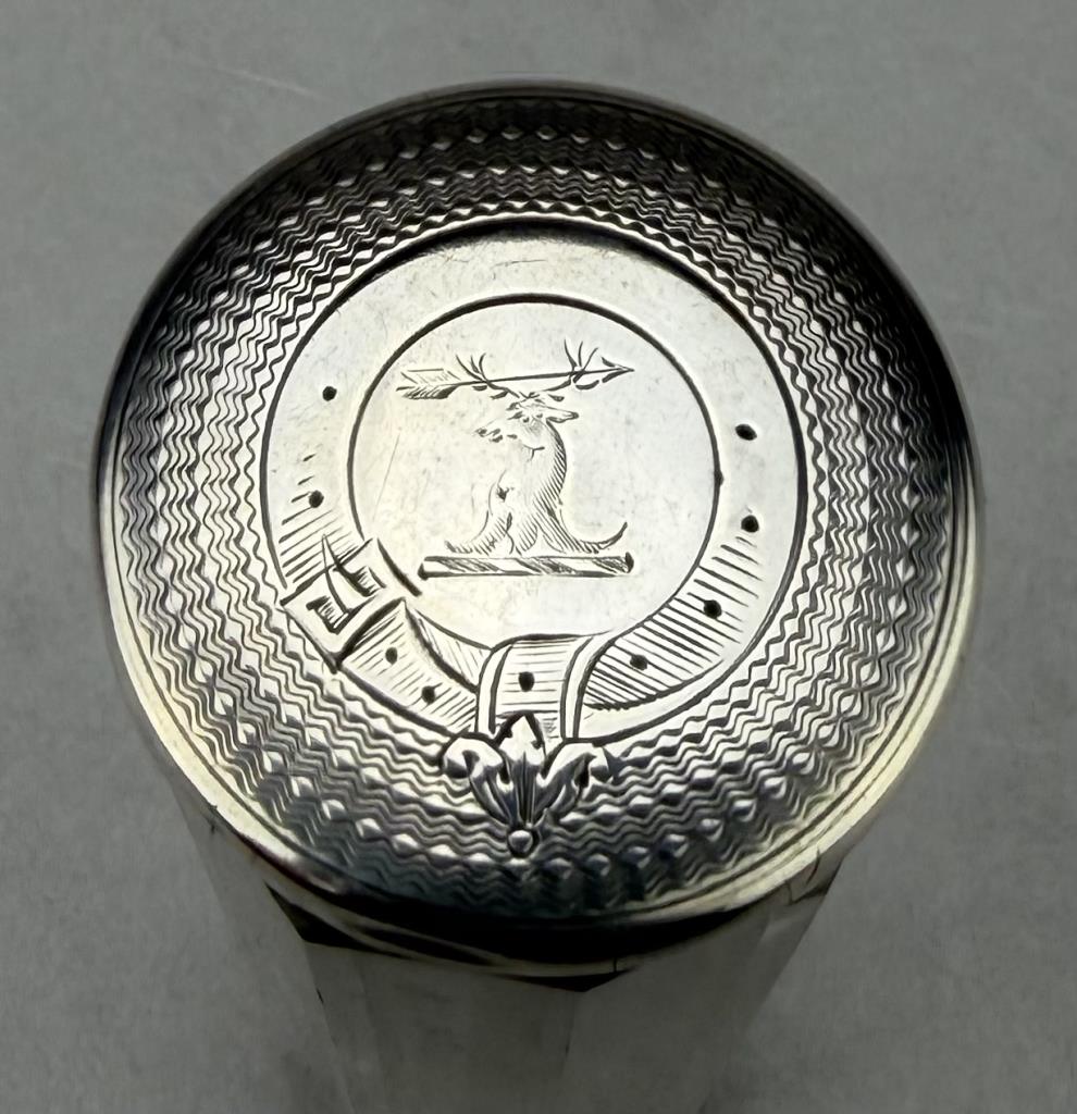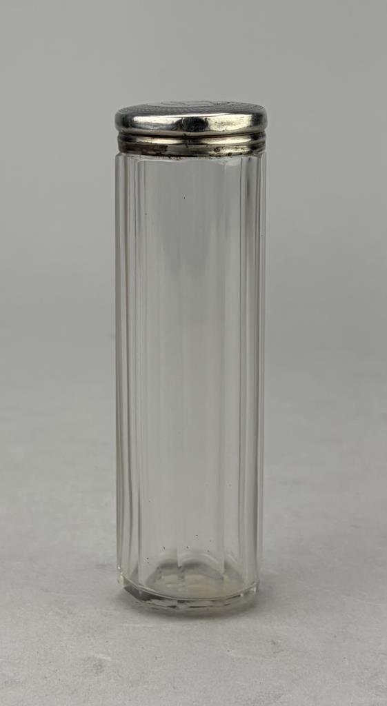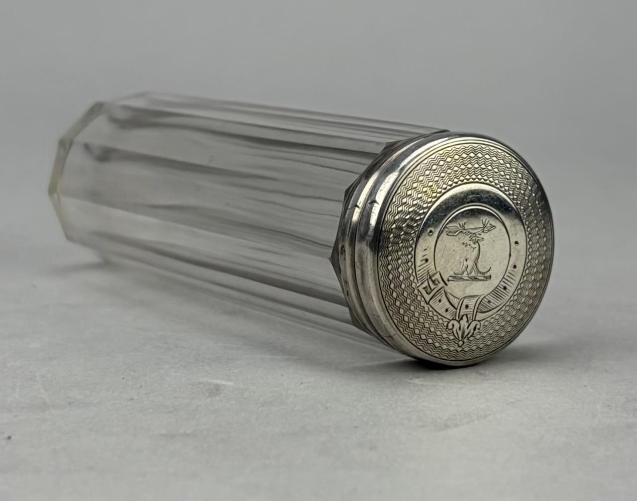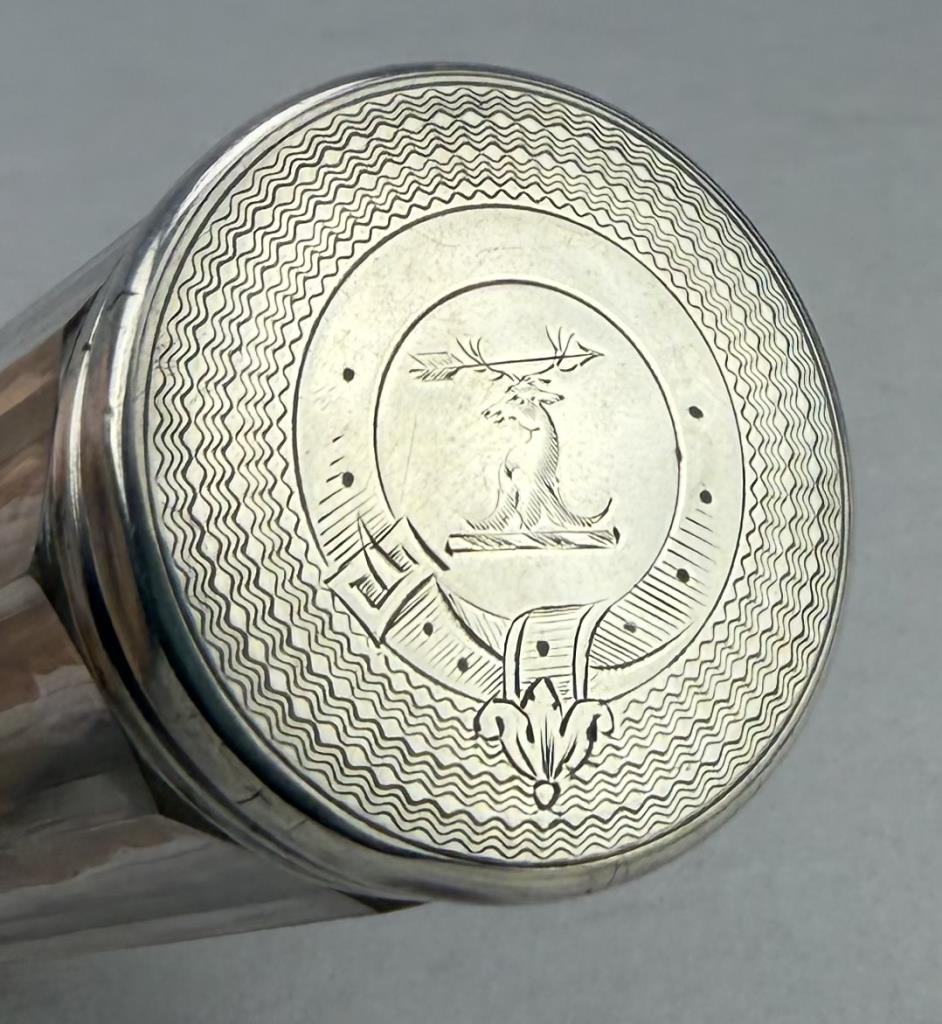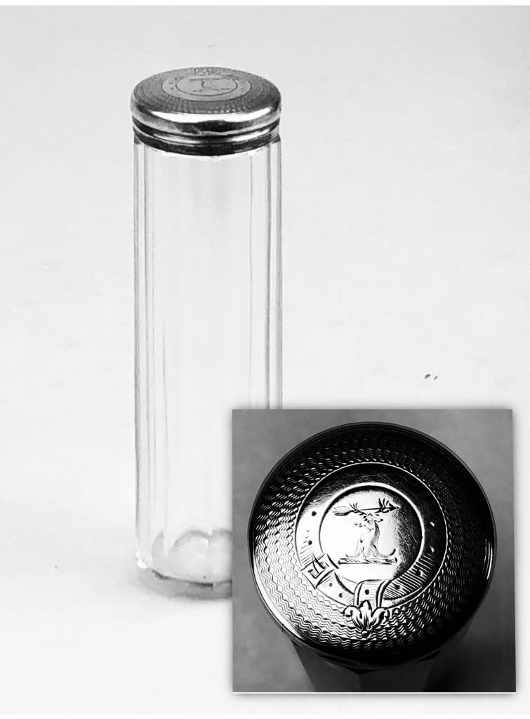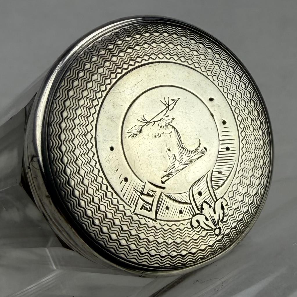 Antique vanity dresser jar or canister, faceted cut glass with a sterling cap hallmarked for 1879 and engraved with a most likely Scottish clan crest, possibly for Clan Fraser, 4-5/8″, 6 grams sterling weight.