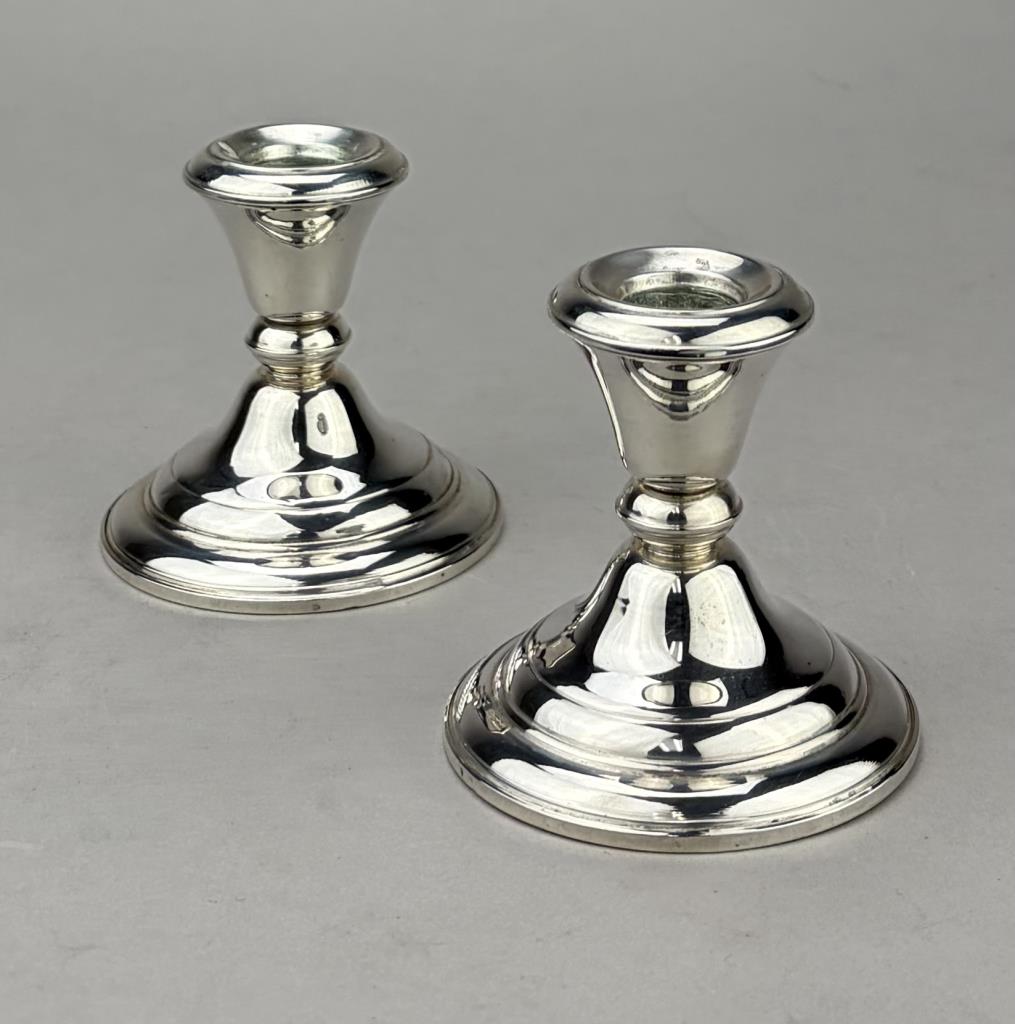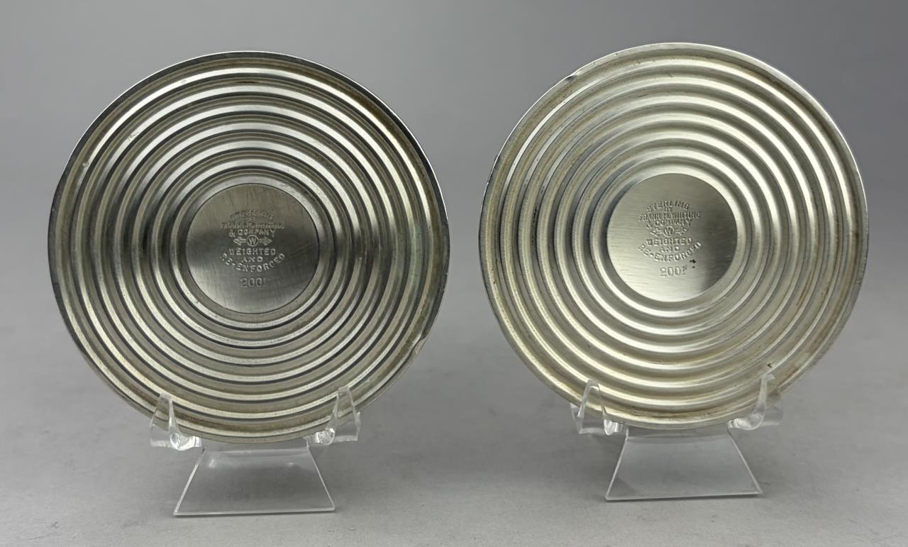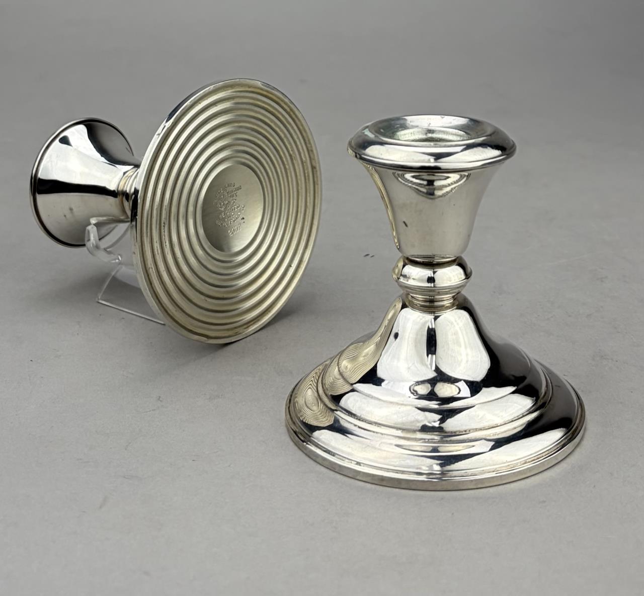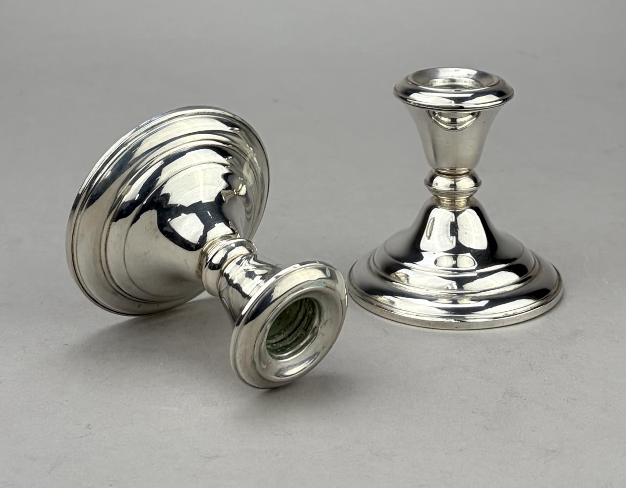 Pair of Frank M. Whiting Company (North Attleboro, Massachusetts) weighted sterling silver candle holders, marked on bottom, early to mid 20th Century, 3-1/4″ (H).