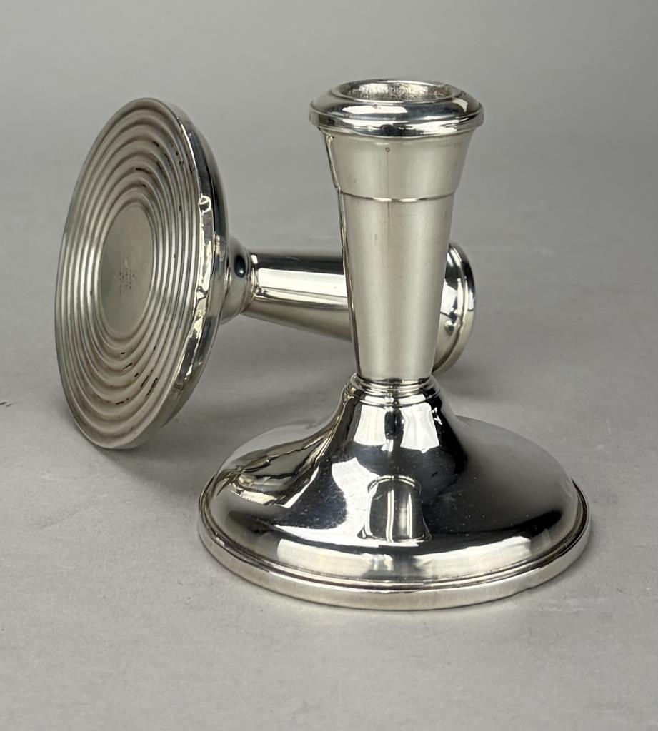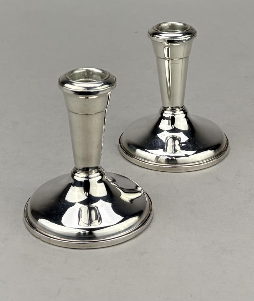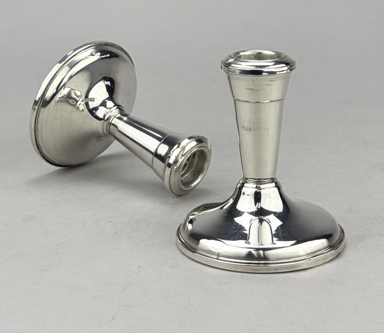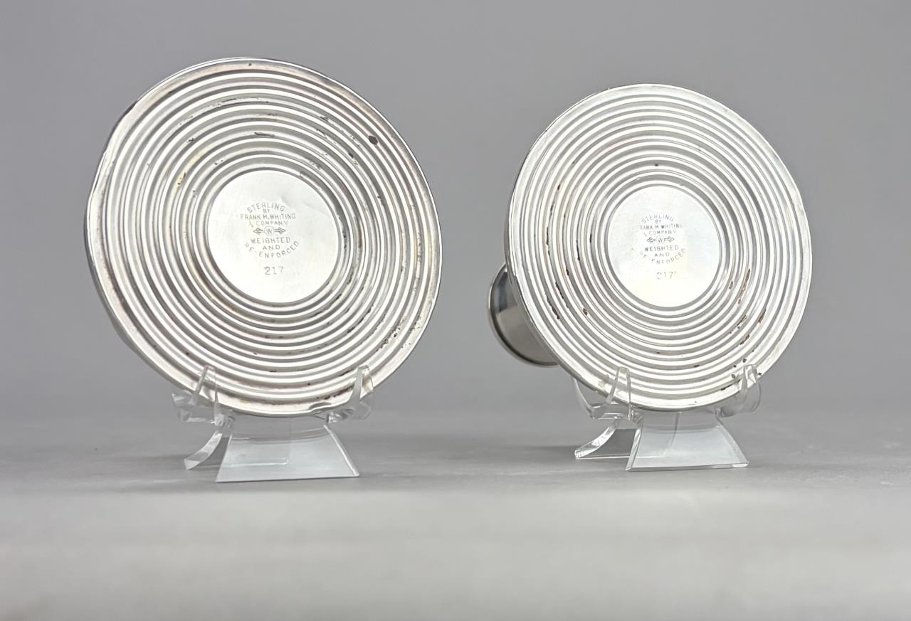 Pair of Frank M. Whiting Company (North Attleboro, Massachusetts) weighted sterling silver candle holders, marked on bottom, early to mid 20th Century, 3-3/4″ (H).