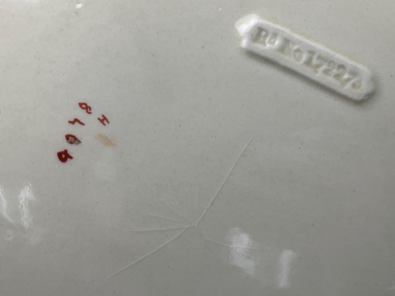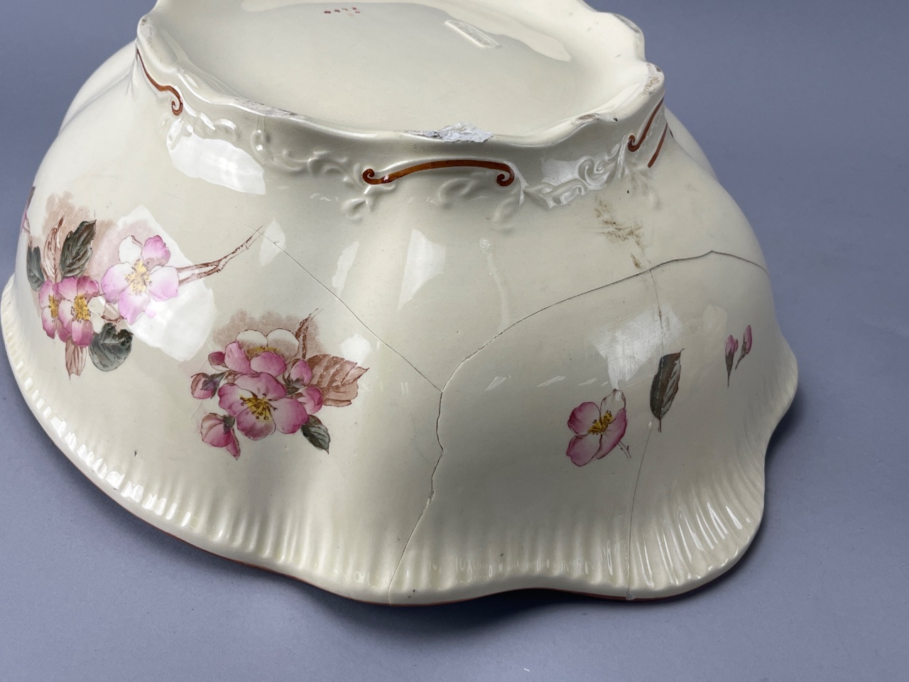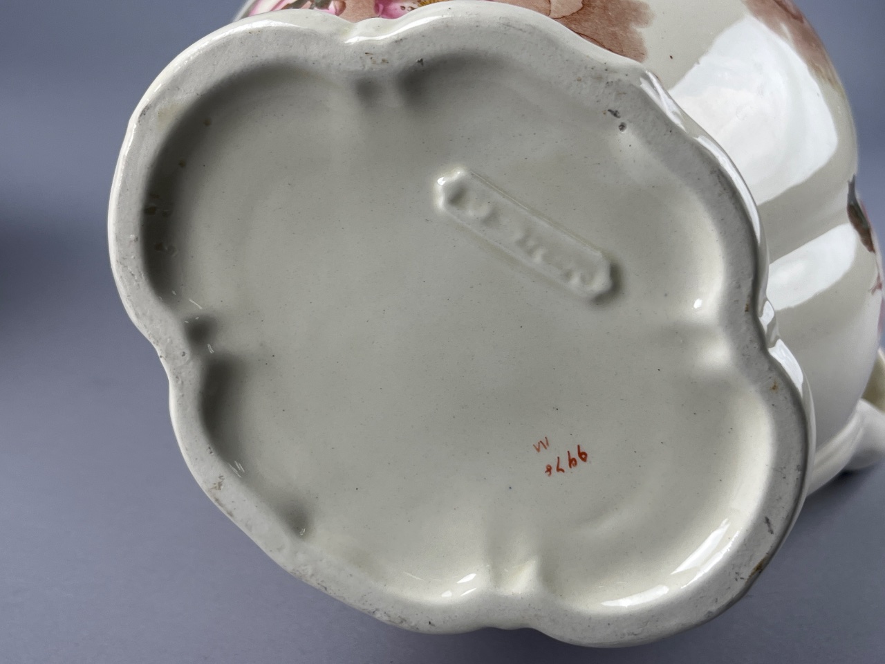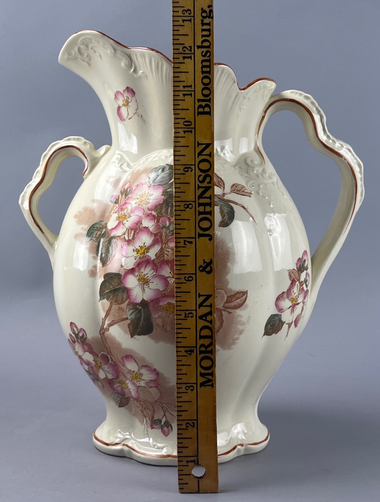 Ceramic pitcher and basin set featuring pink and white floral decoration with green leaves. Both pieces have scalloped edges. Markings are shown in photos. Pitcher measures 13″ tall. CONDITION: The basin has a visible crack on the side and a chip on the rim. SHIPPING: In-House Shipping Available