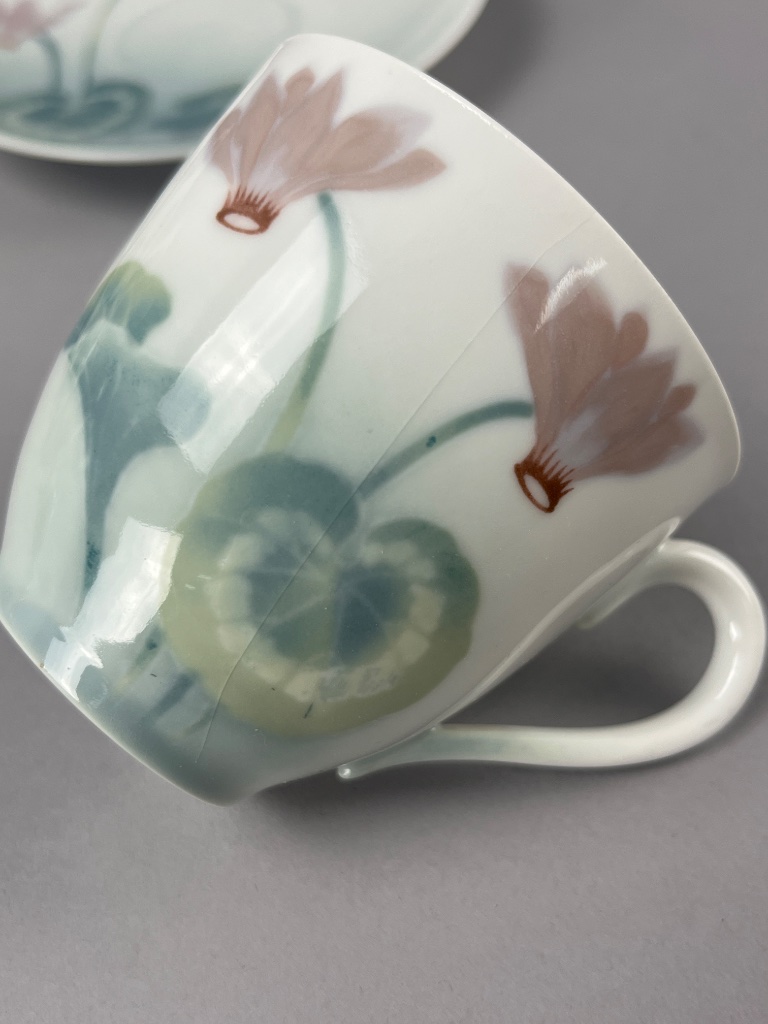 Jaeger & Comp. nine-piece porcelain tea set featuring floral motifs in pink and green on a white background. The set includes a teapot with lid, creamer, sugar bowl with lid, and four teacups with 6 matching saucers. The base of the saucers bears the mark ‘Jaeger & Comp.’ Teapot measures about 9″ tall. CONDITION: Crack on the teacup as shown in photos. SHIPPING: In-House Shipping Available