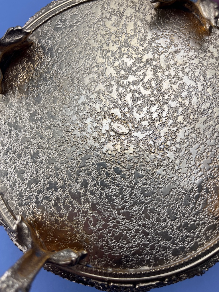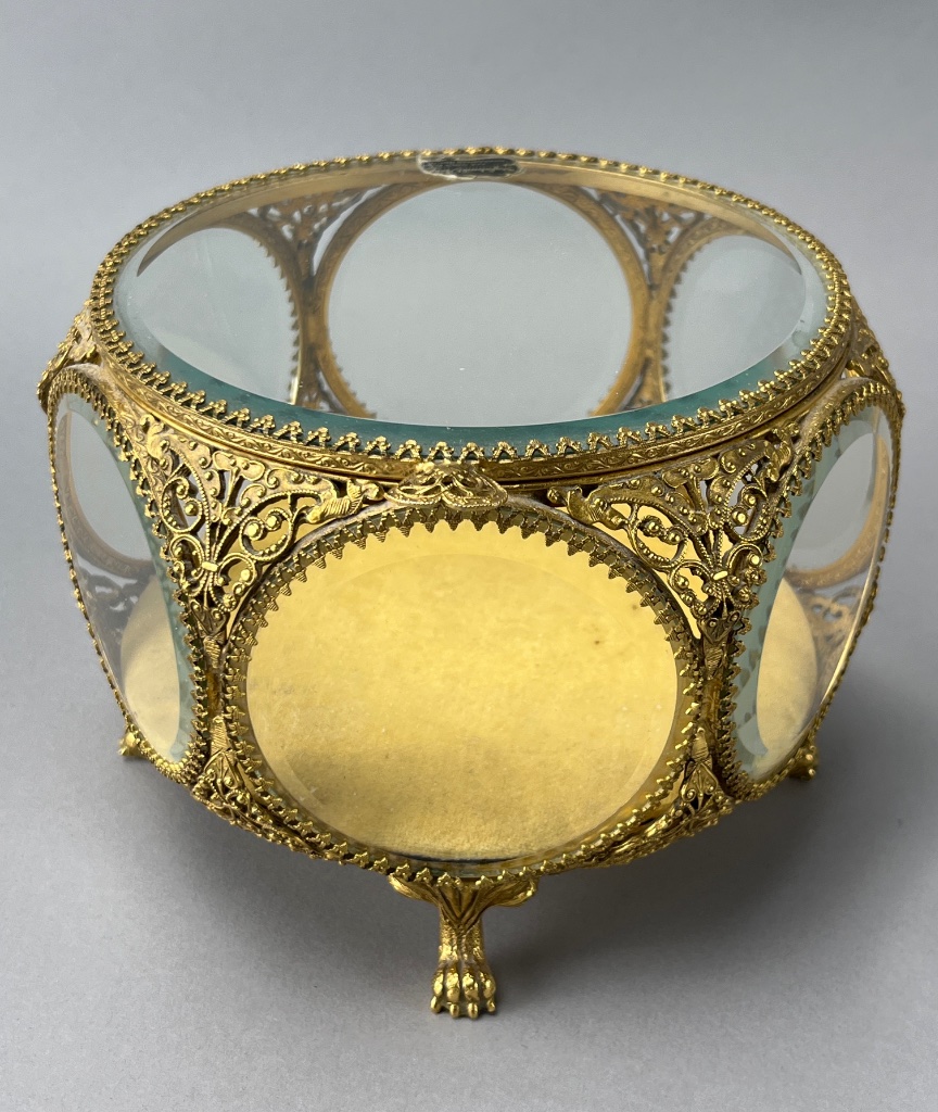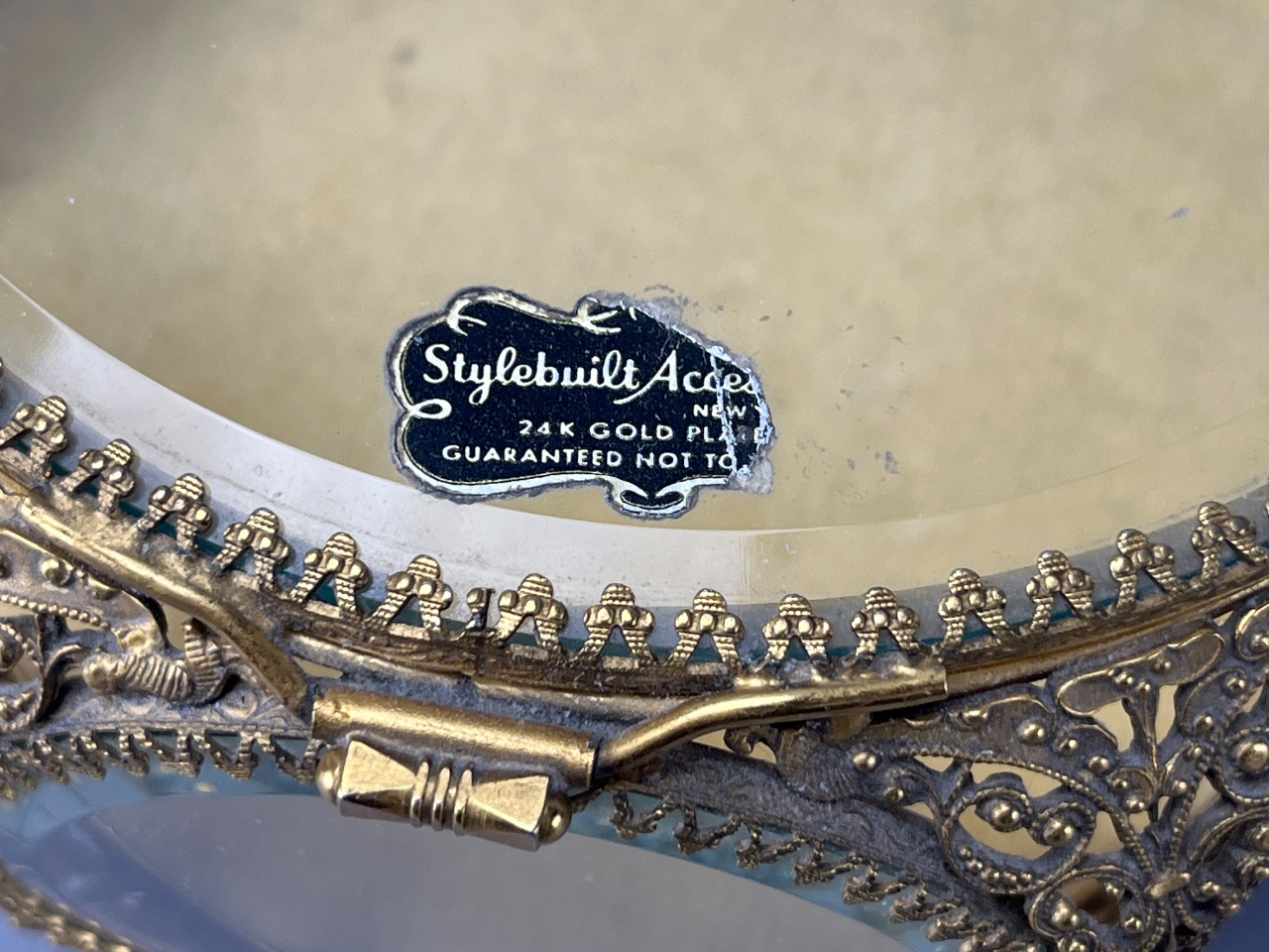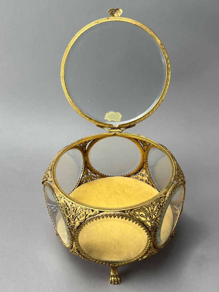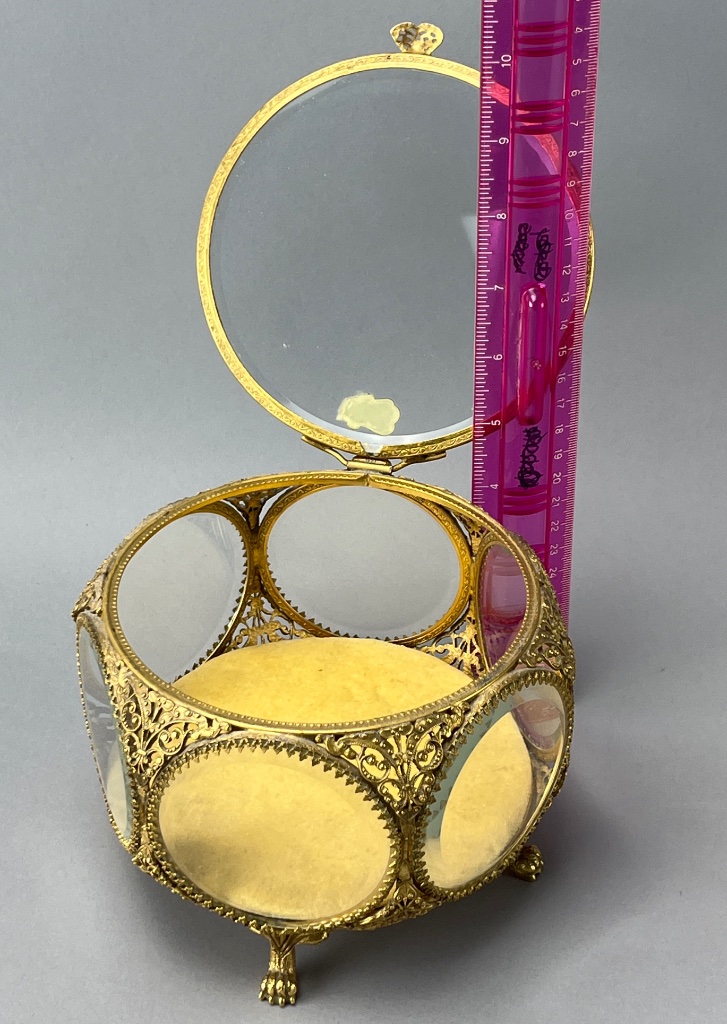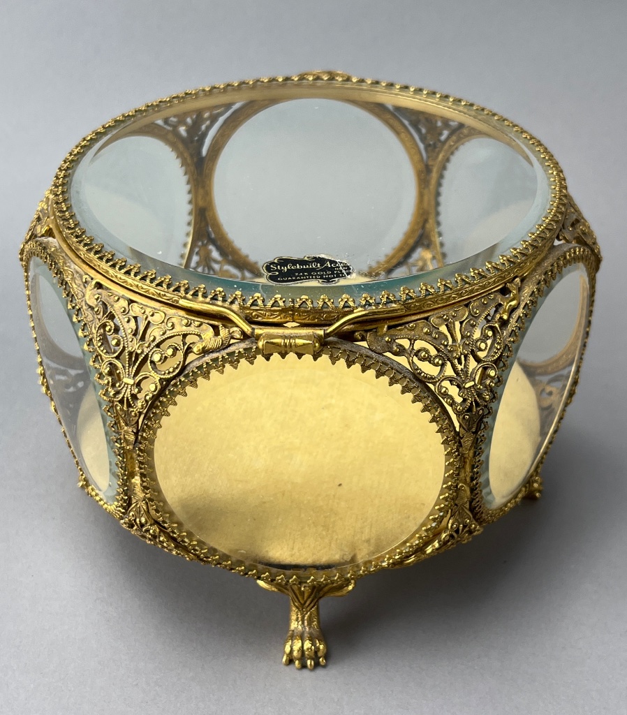Stylebuilt 24K gold plated glass box featuring a round design with a gold-plated metal frame and decorative filigree accents. The box includes four glass panels with circular openings and a hinged lid with a heart-shaped clasp. Interior label reads ‘Stylebuilt Ac’ and ’24K GOLD PLATED GUARANTEED NOT TO.’ Measures 4″ tall and 5″ wide. CONDITION: Some wear to the gold plating and minor scratches on the glass panels. SHIPPING: In-House Shipping Available