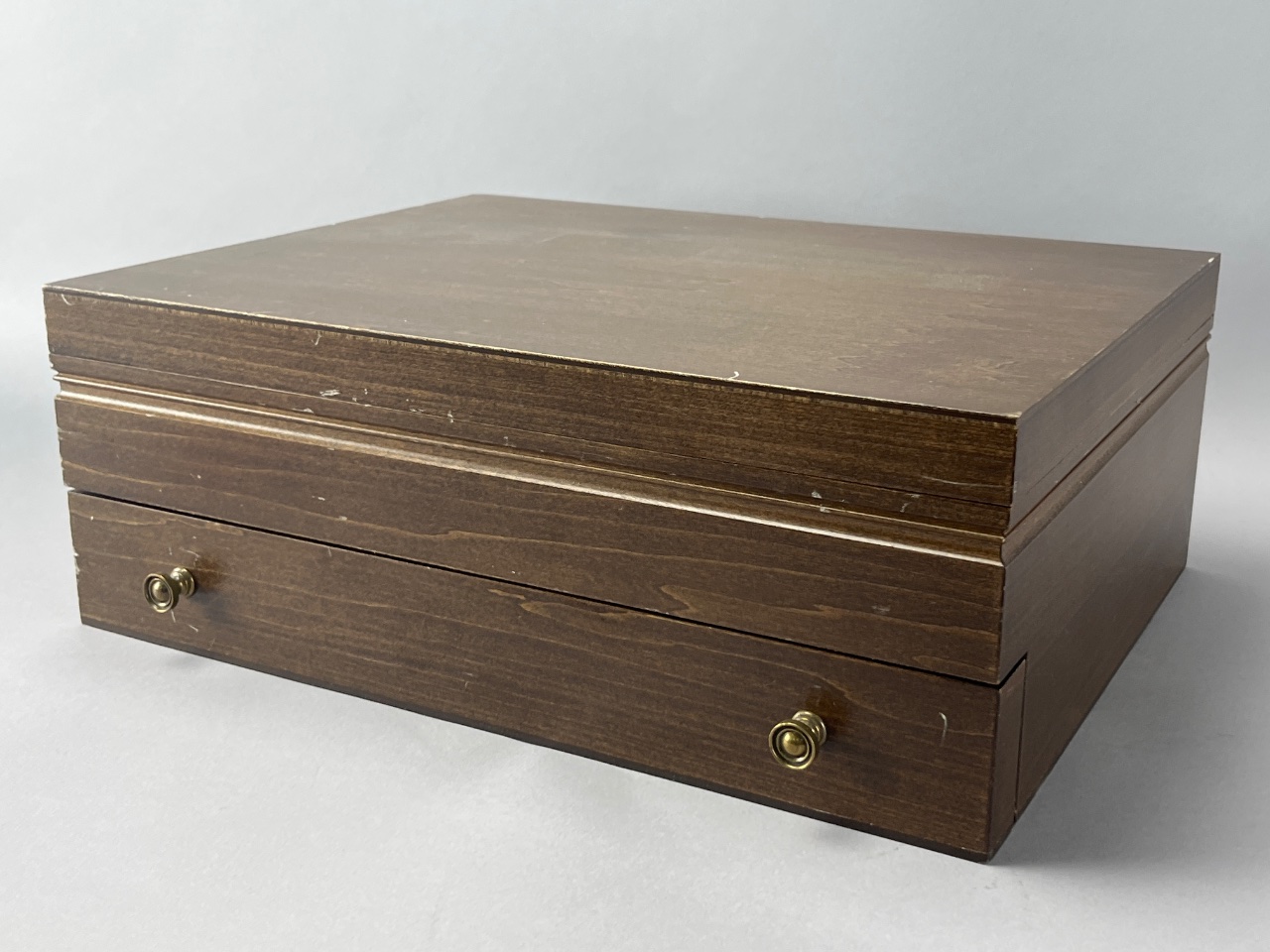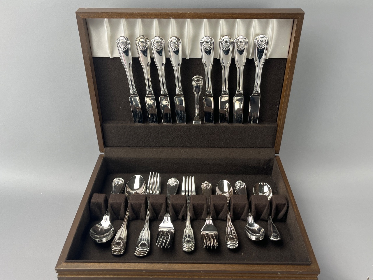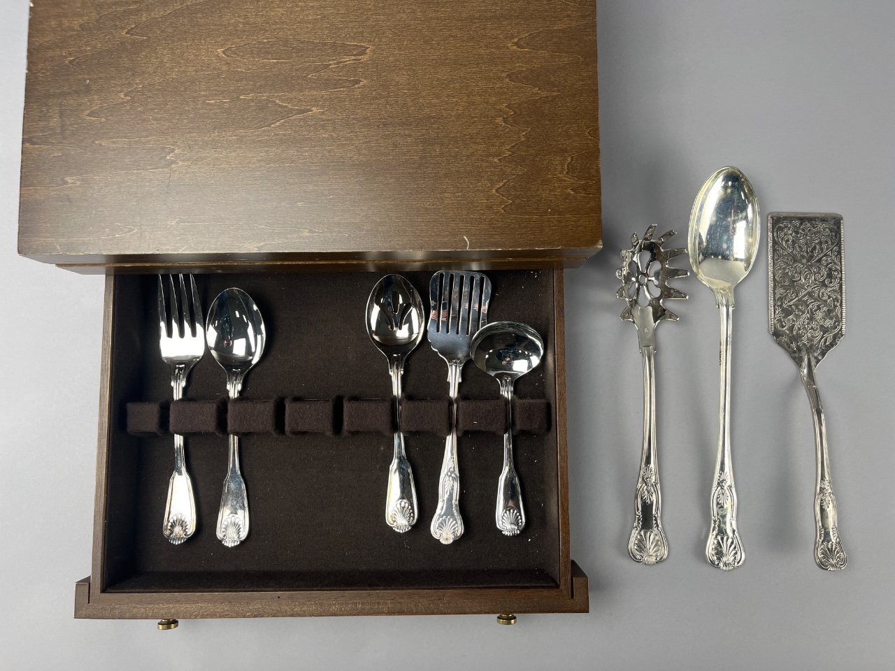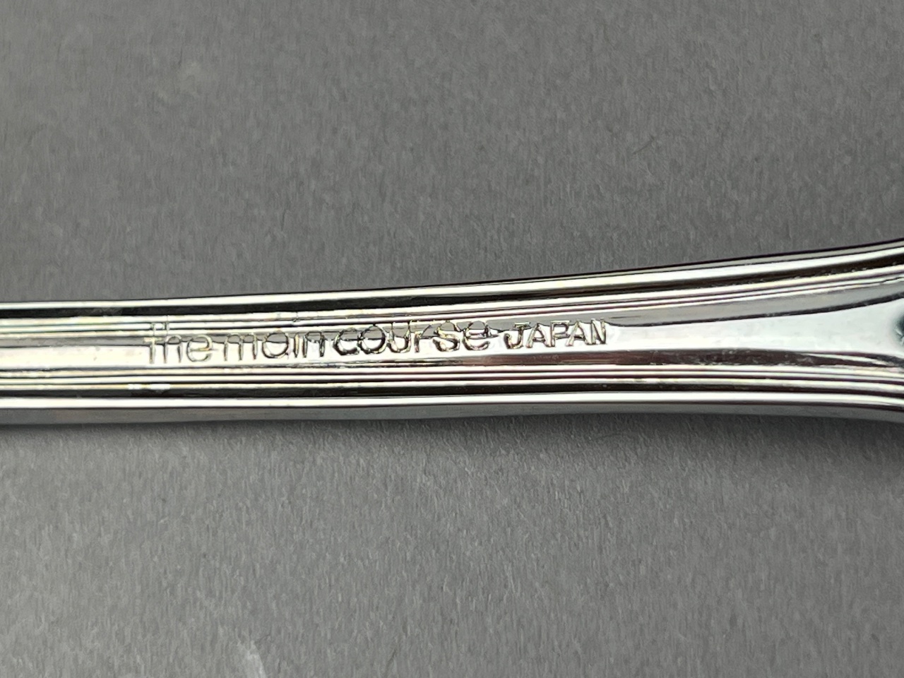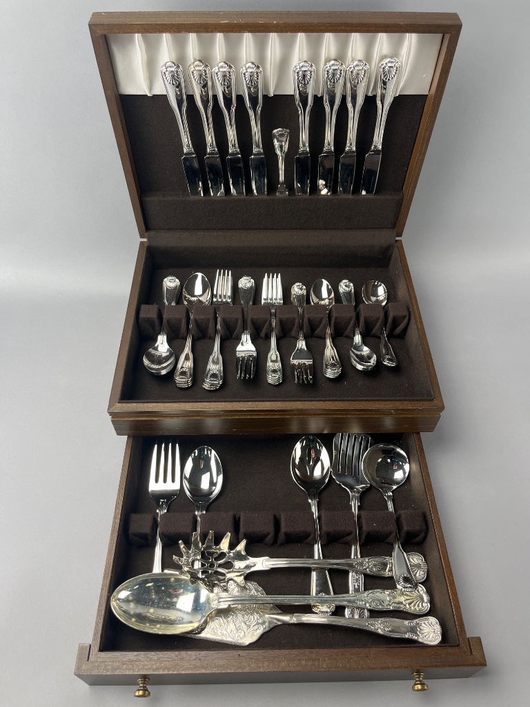 Silverware set with serving utensils by ‘the main course’, marked ‘the main course JAPAN’ on one spoon. Includes stainless steel flatware with ornate handle designs, stored in a wooden presentation box with velvet-lined compartments. Case measures about 14″ wide. CONDITION: Surface scratches observed on the wooden box. No visible tarnishing on the silverware. SHIPPING: In-House Shipping Available