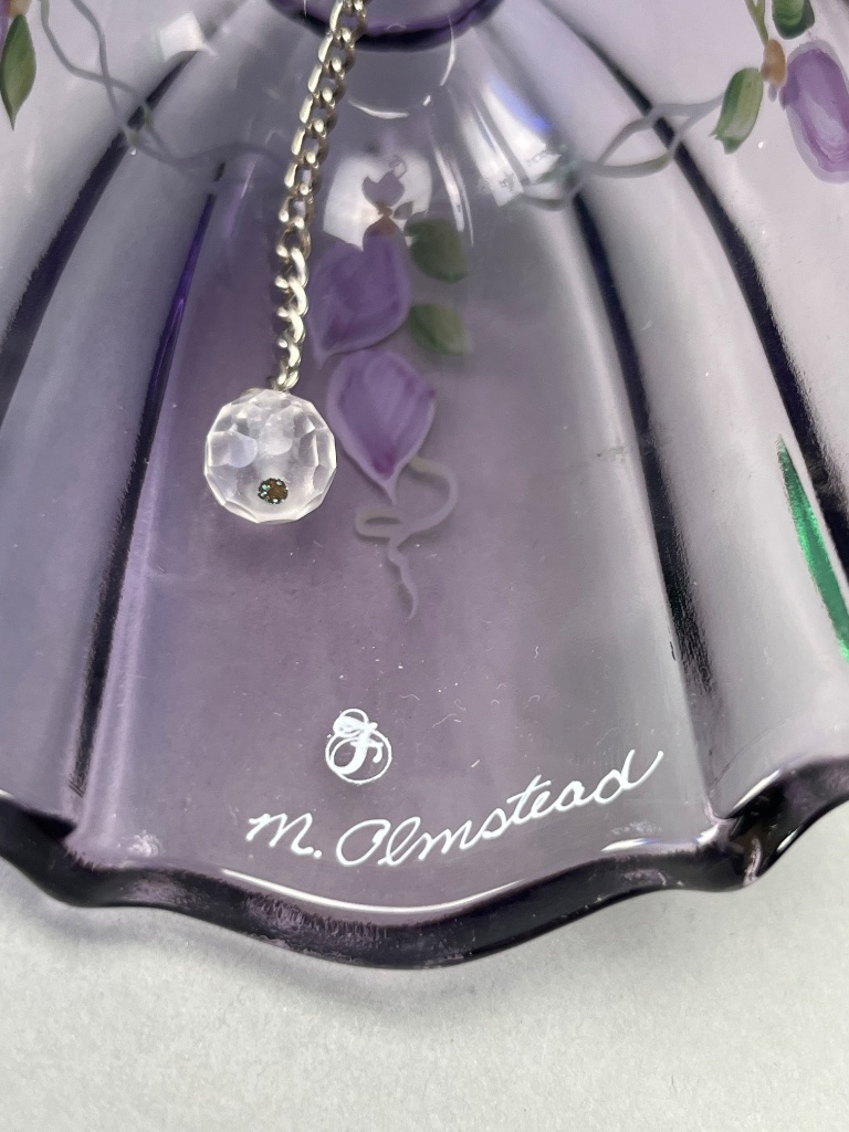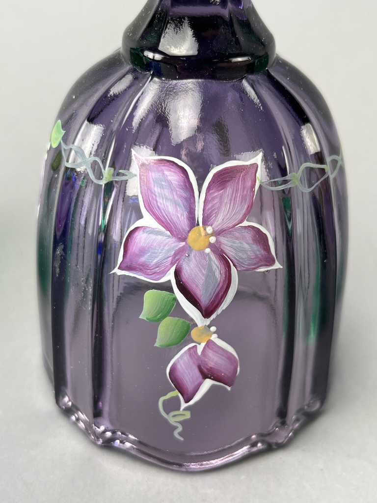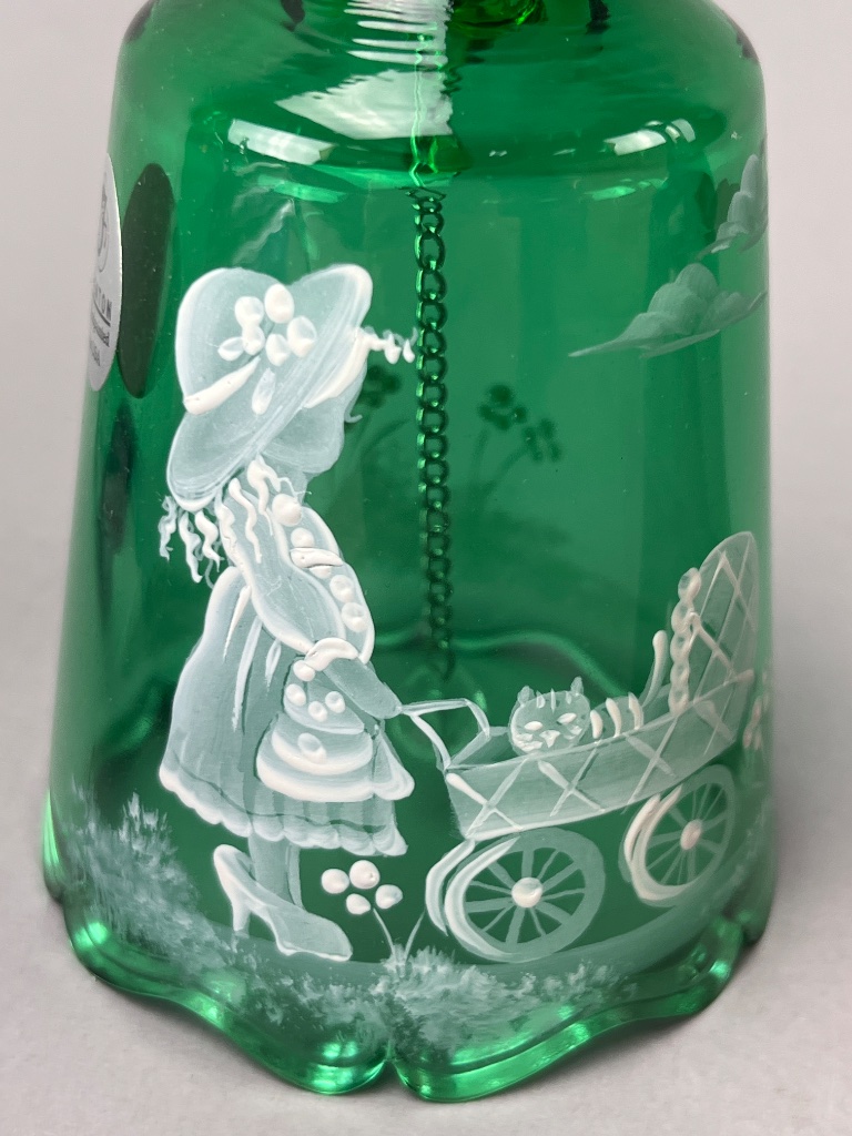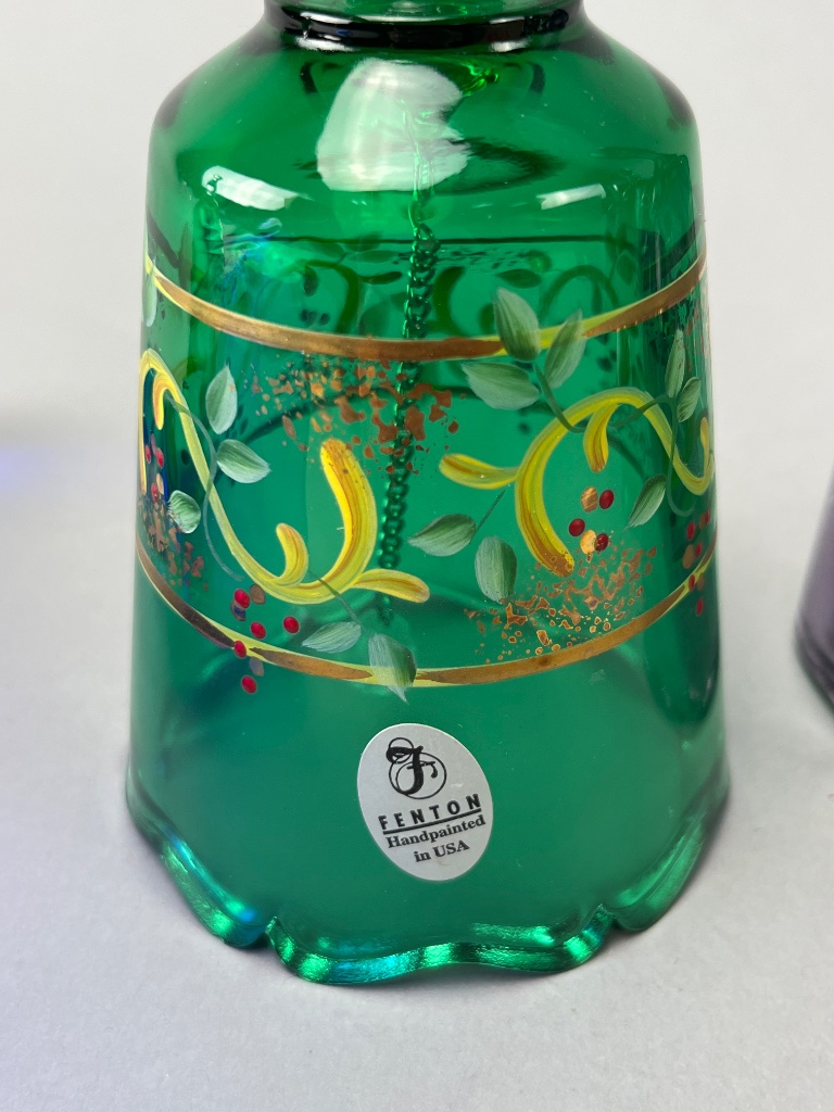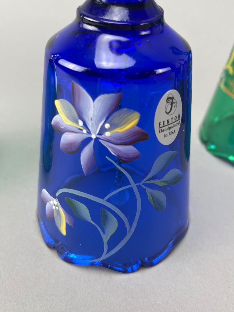 Set of six decorative glass bells, including four Fenton bells marked ‘Handpainted in USA,’ one Bohemia Crystal bell marked ‘Bohemia Crystal, Made in Czech Republic,’ and one unmarked bell. Signatures observed include ‘M. Olmstead’ and ‘hand painted by S. Jackson.’ The set features varying colors and designs, including floral motifs and a child with a cat design. CONDITION: Condition not assessed. SHIPPING: In-House Shipping Available