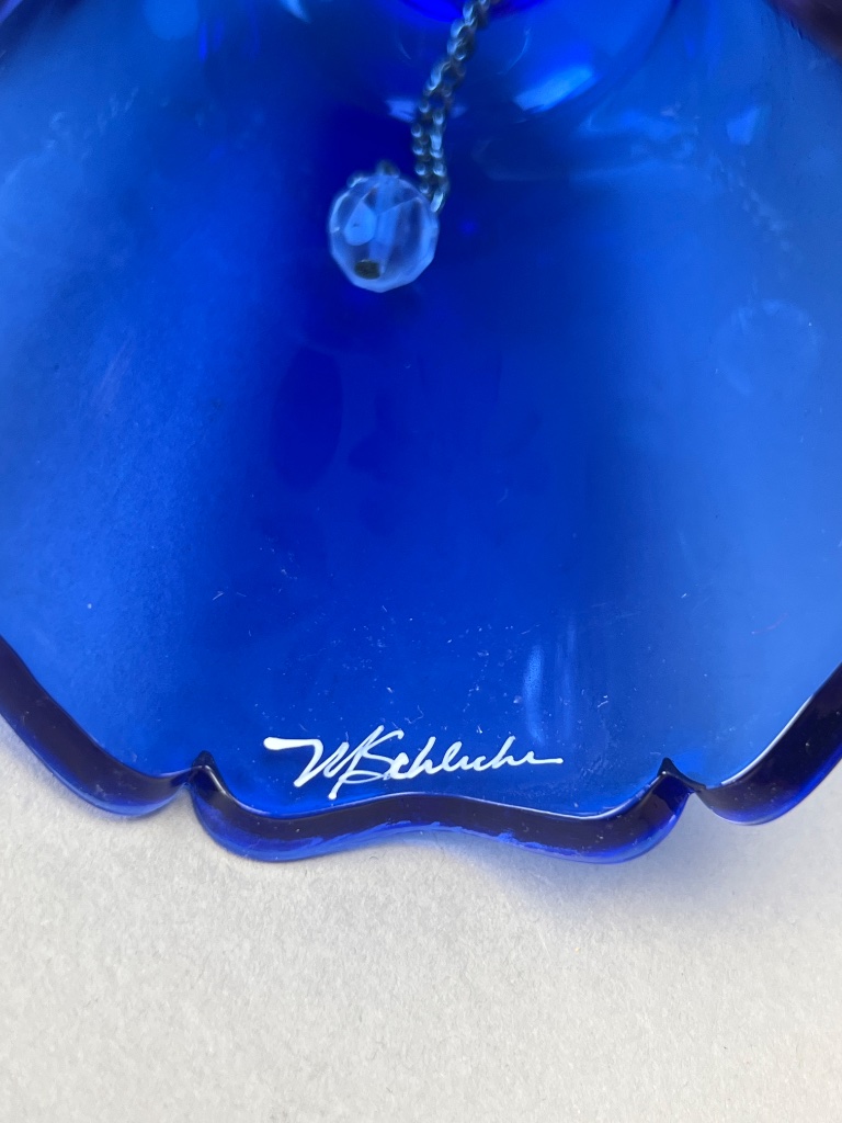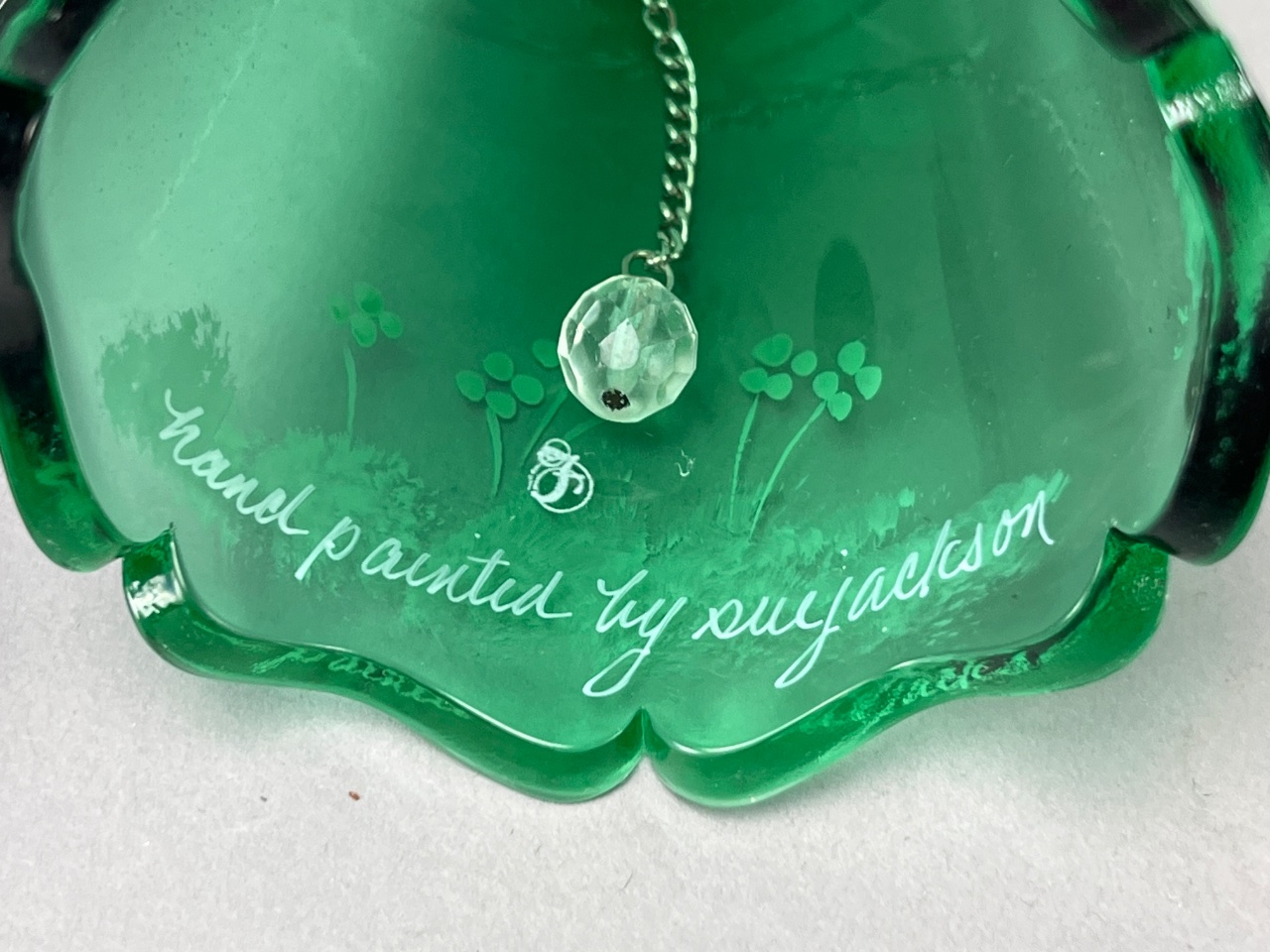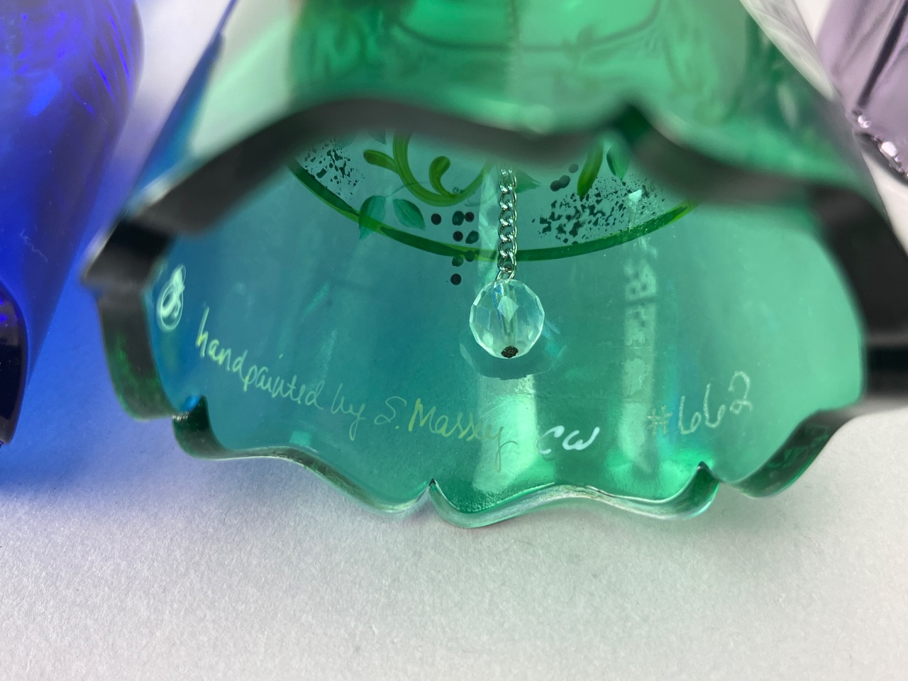Set of six decorative glass bells, including four Fenton bells marked ‘Handpainted in USA,’ one Bohemia Crystal bell marked ‘Bohemia Crystal, Made in Czech Republic,’ and one unmarked bell. Signatures observed include ‘M. Olmstead’ and ‘hand painted by S. Jackson.’ The set features varying colors and designs, including floral motifs and a child with a cat design. CONDITION: Condition not assessed. SHIPPING: In-House Shipping Available