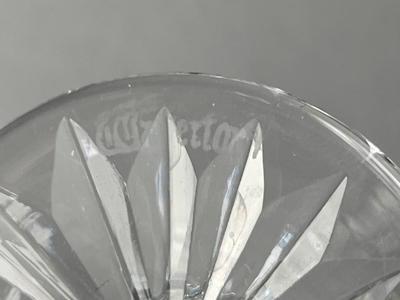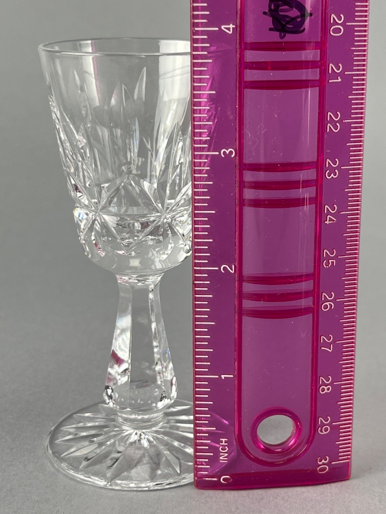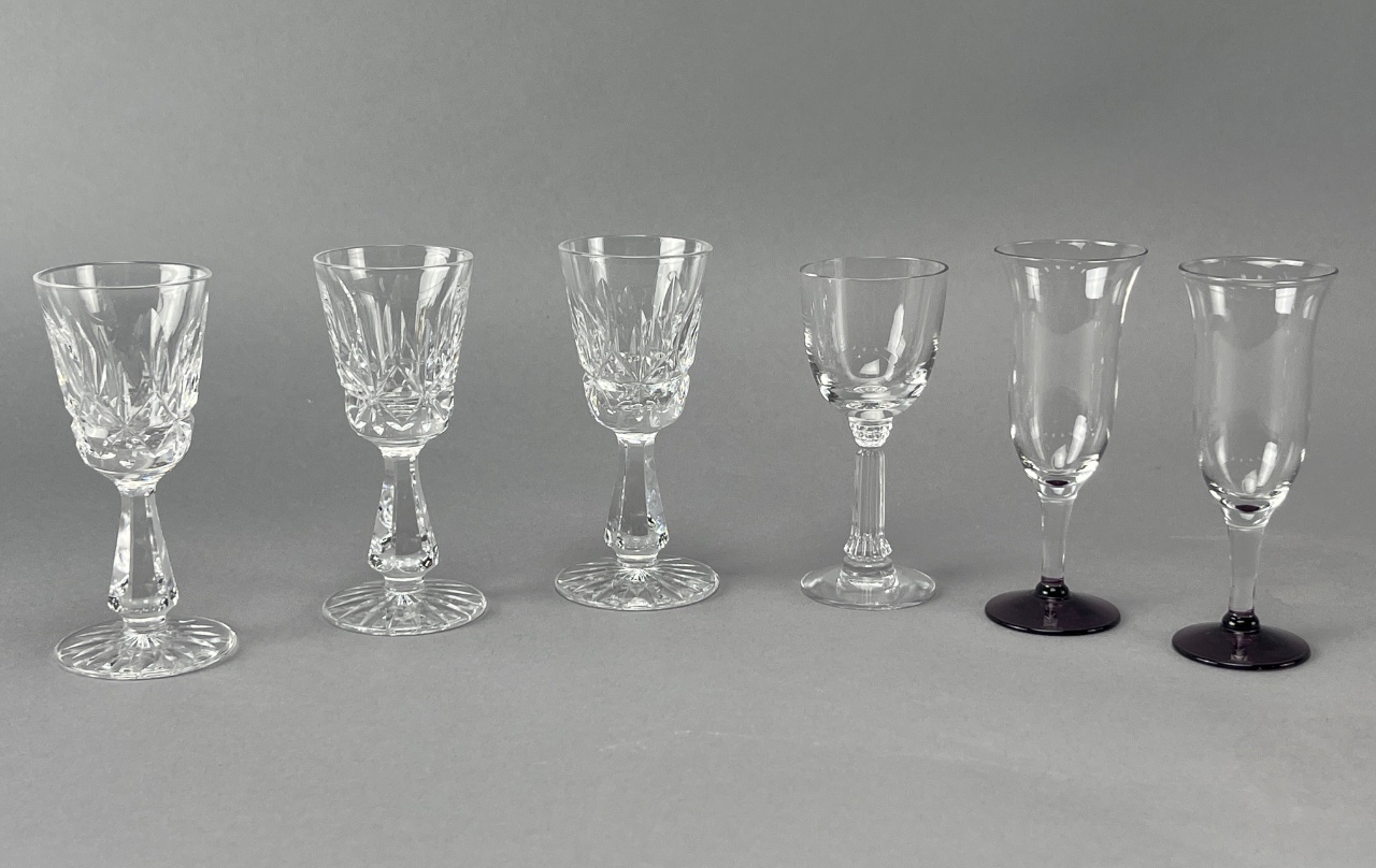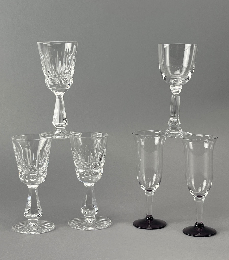 Set of six stemware glasses, including three Waterford crystal glasses with acid-etched ‘Waterford’ hallmark and hand-cut patterns, and three unmarked glasses with smooth surfaces. The unmarked glasses vary in height, with one featuring a black base. Taller Waterford glasses measure about 4″ each. CONDITION: SHIPPING: In-House Shipping Available