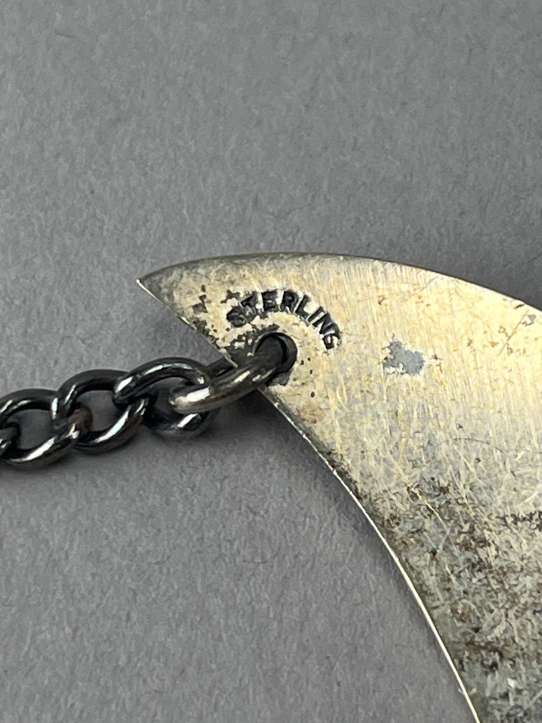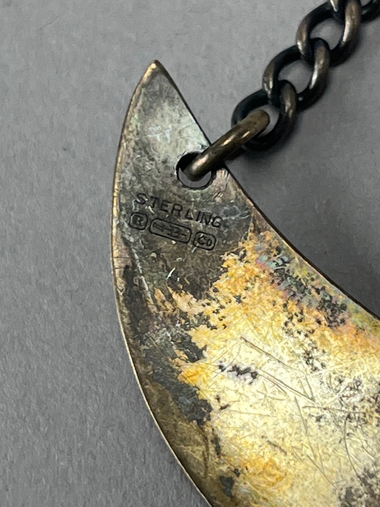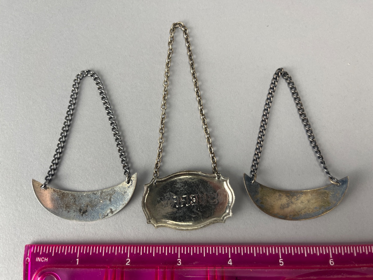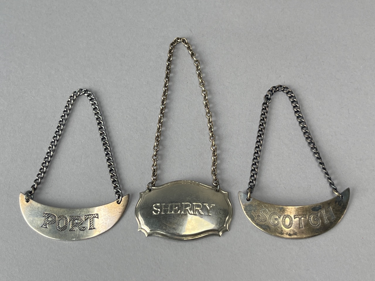 Set of three liquor labels by R & CO, including one oval label marked ‘SHERRY’ and two crescent-shaped labels marked ‘PORT’ and ‘SCOTCH’. Each label features a chain for hanging. The ‘PORT’ and ‘SCOTCH’ are marked ‘STERLING’ to confirm silver composition. Labels measure about 2″ each. CONDITION: Surface wear and tarnishing visible on all pieces. Scratches present on the surfaces. SHIPPING: In-House Shipping Available