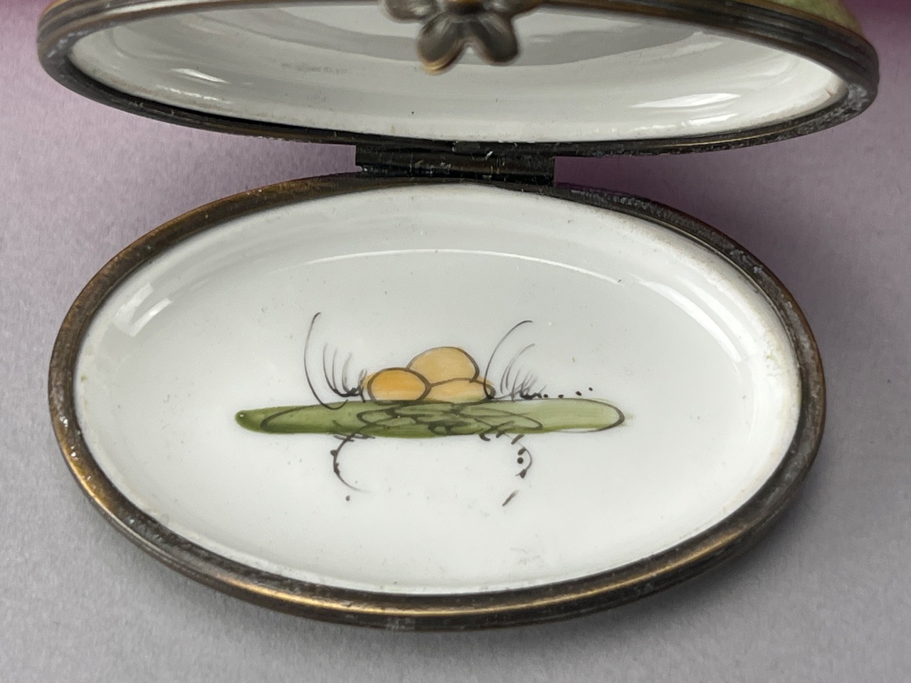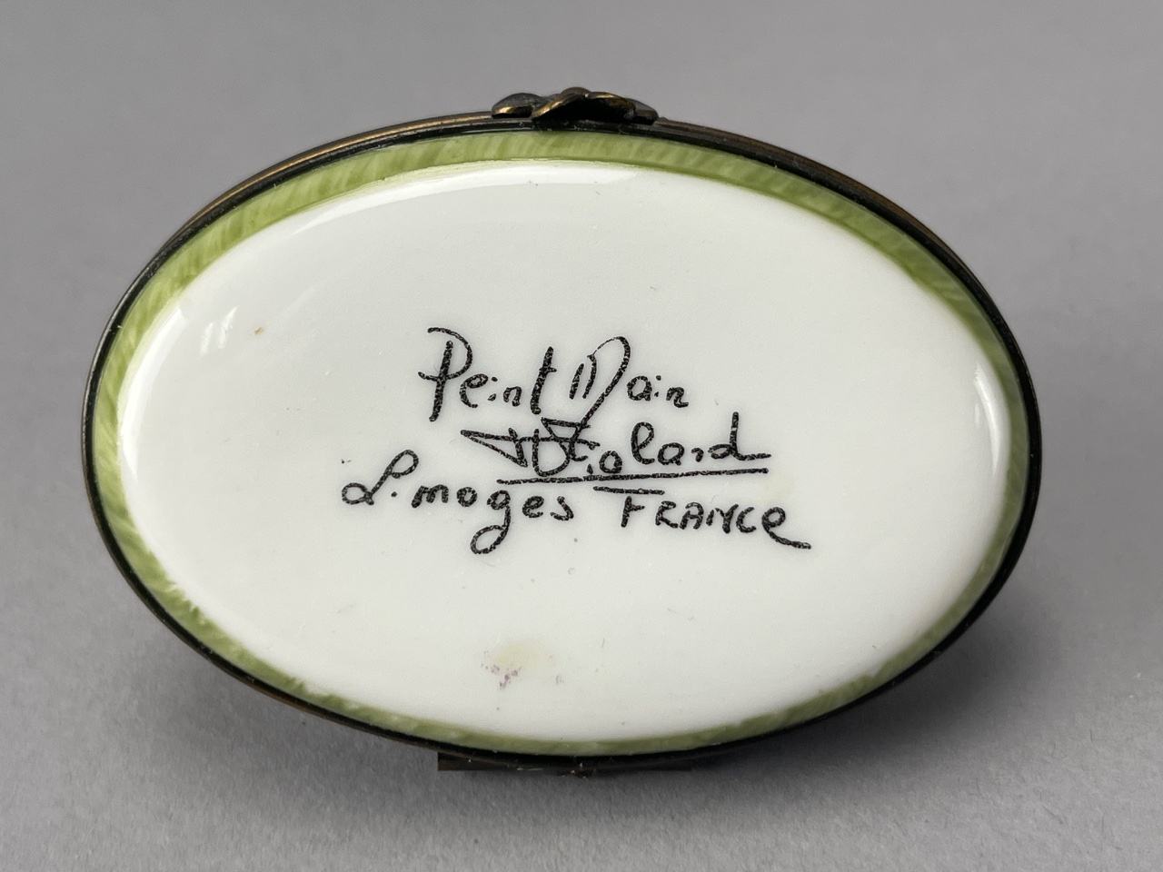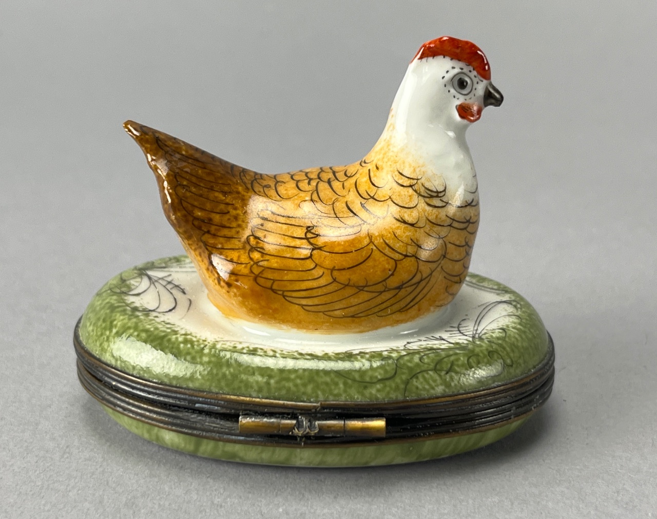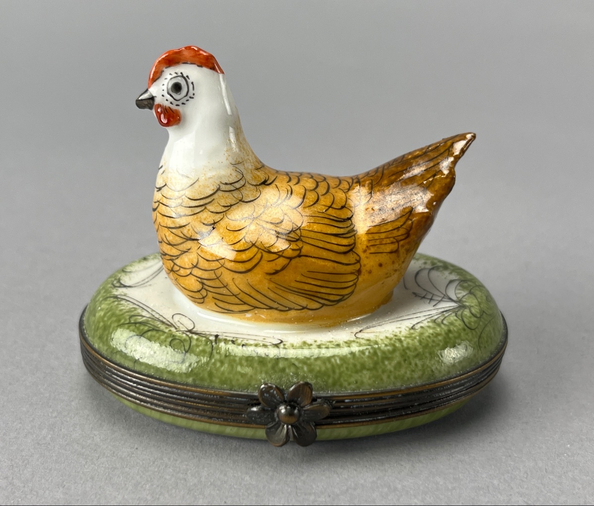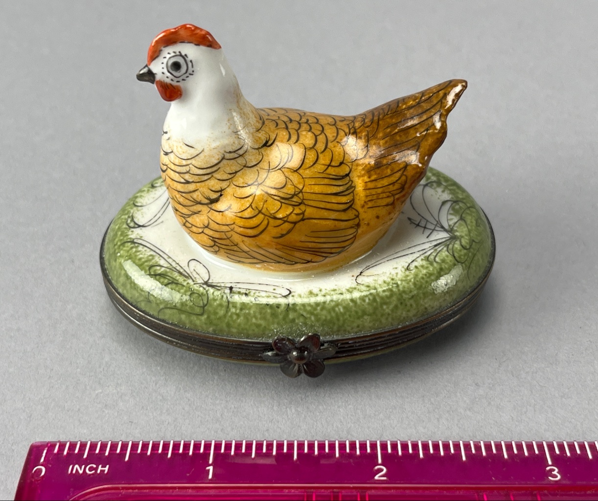 Hand-painted ceramic chicken figure by Limoges, featuring a yellow and brown body with a red comb, mounted on a green base with floral decoration. The underside bears the mark ‘Peint Main, Limoges, France.’ A metal clasp is visible on the side of the base. Measures about 3″ wide. CONDITION: Some surface wear observed on the base. No visible chips or cracks. SHIPPING: In-House Shipping Available
