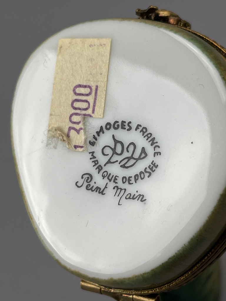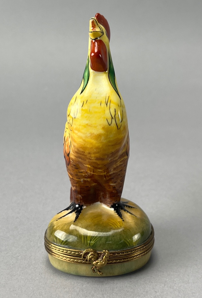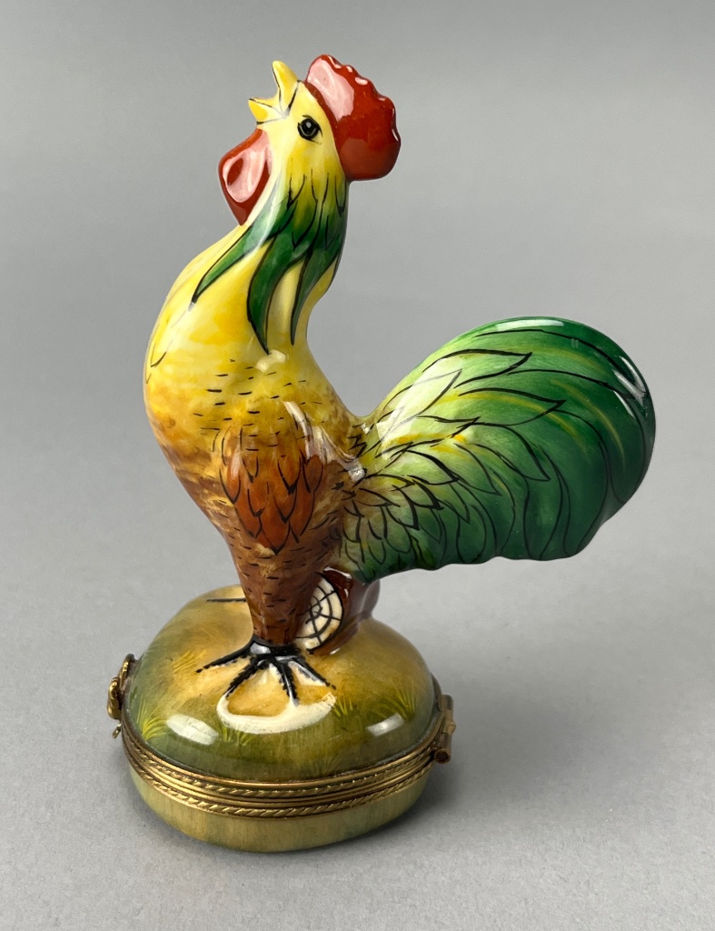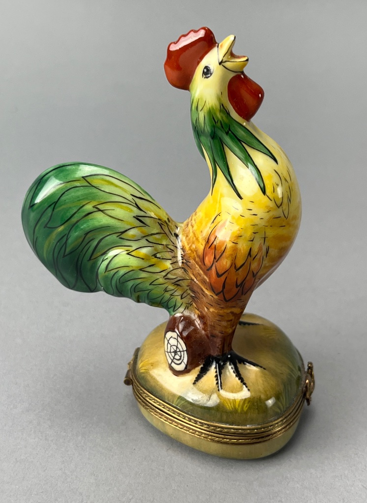 Limoges hand-painted ceramic rooster trinket box featuring colorful details, including a red comb and green tail feathers. The oval-shaped base is trimmed with gold-tone metal and marked ‘Limoges France, Marque Deposee, Peint Main.’ The interior of the box is decorated with a painted landscape depicting hills and a sun. Measures about 4″ tall. CONDITION: Gold-tone trim shows minor wear. No visible chips or cracks observed. SHIPPING: In-House Shipping Available