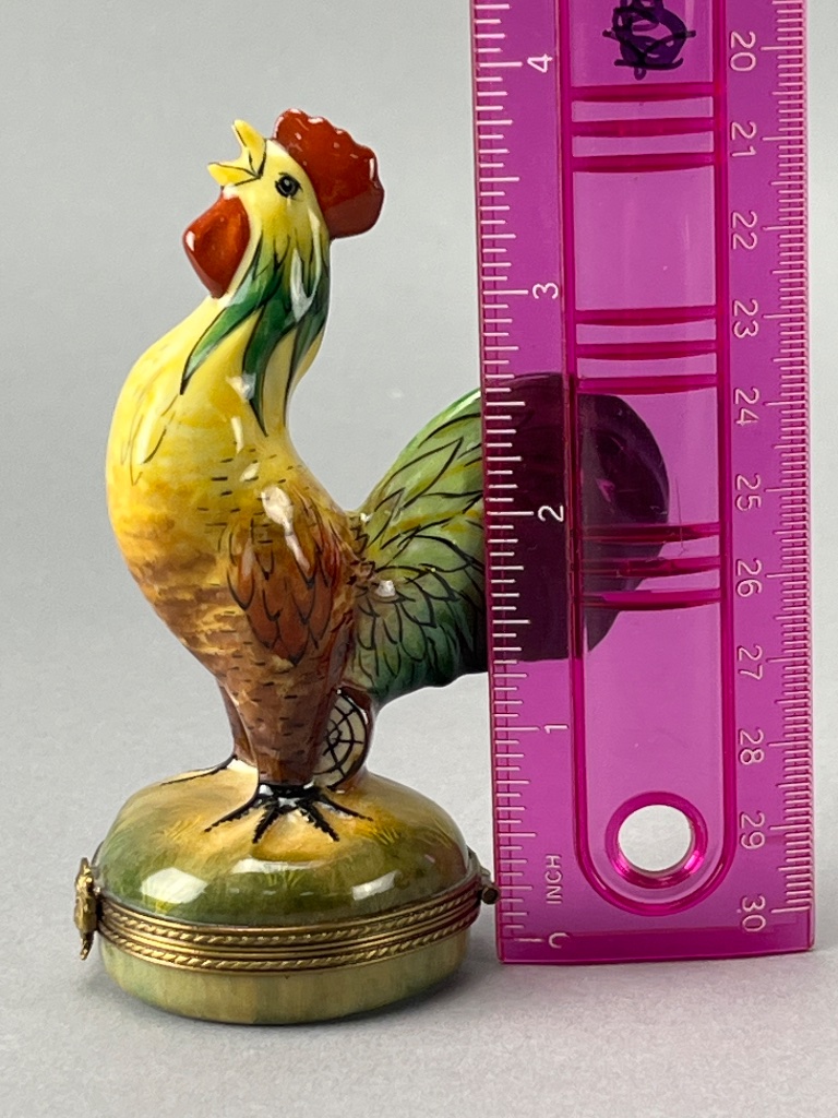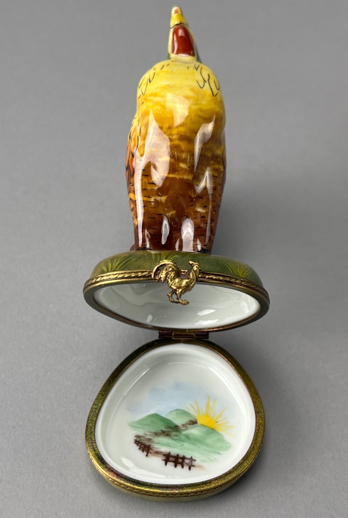 Limoges Hand-Painted Rooster Trinket Box with Landscape Interior