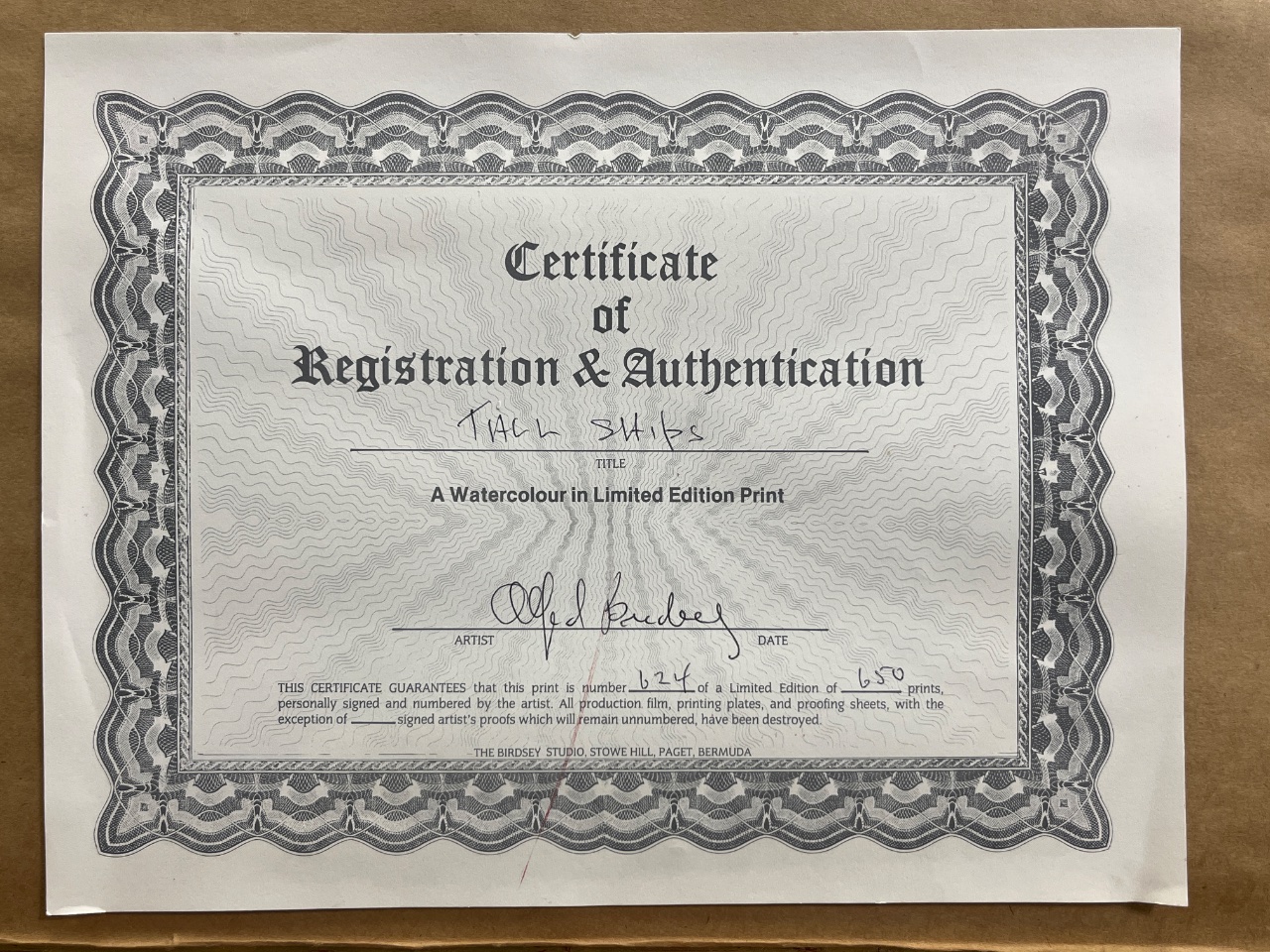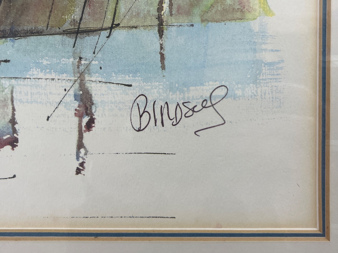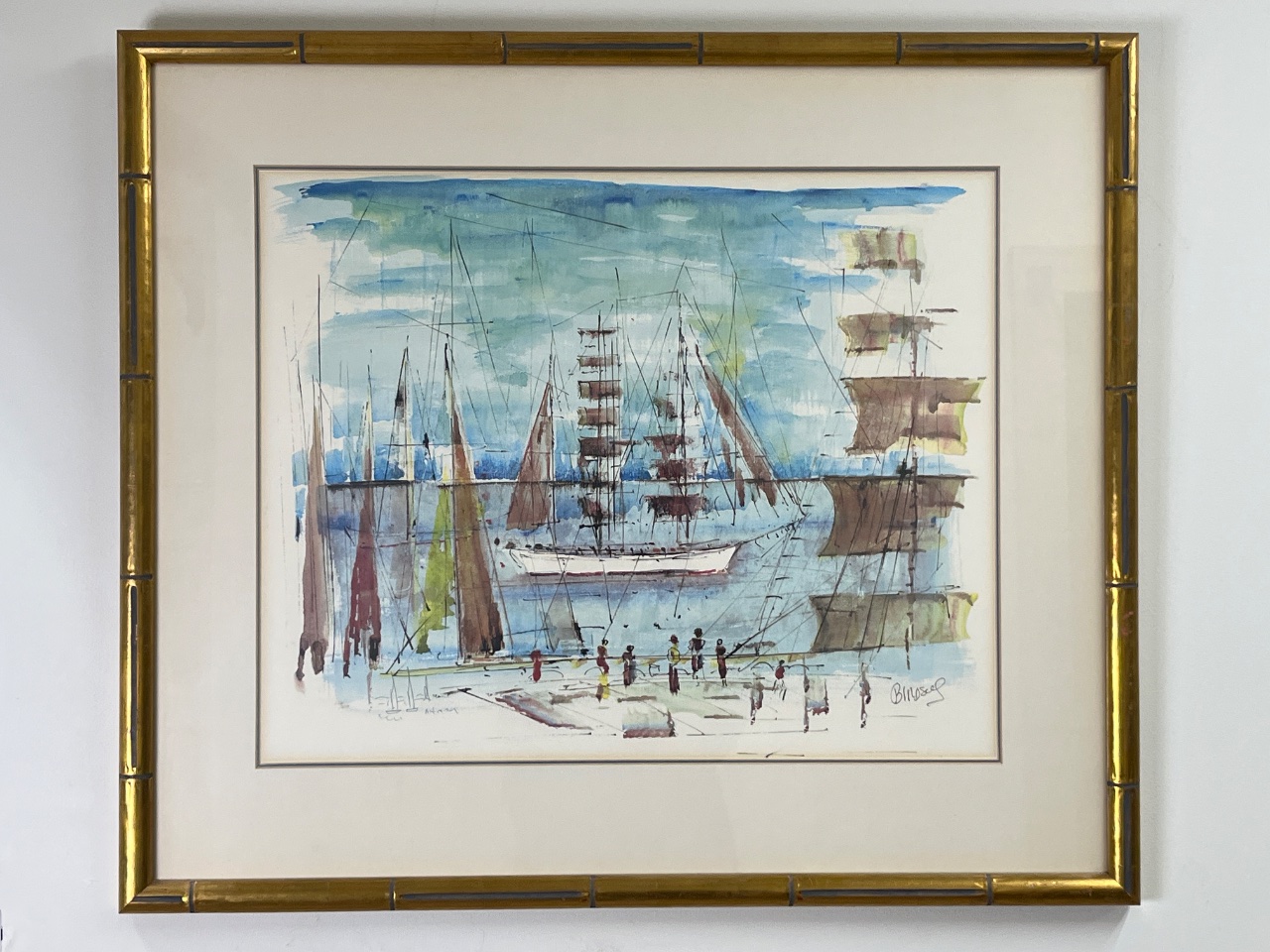 Watercolor painting of a harbor scene with sailboats, signed lower right ‘Birdsey’. The artwork features a light blue and green color palette and is presented in a gold bamboo-style frame. Frame measures 31.5″ x 26.5″. CONDITION: SHIPPING: In-House Shipping Available