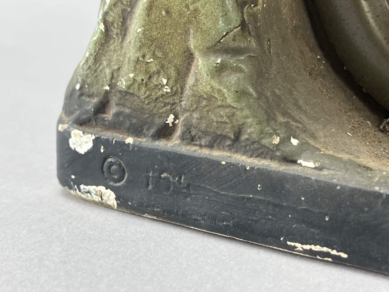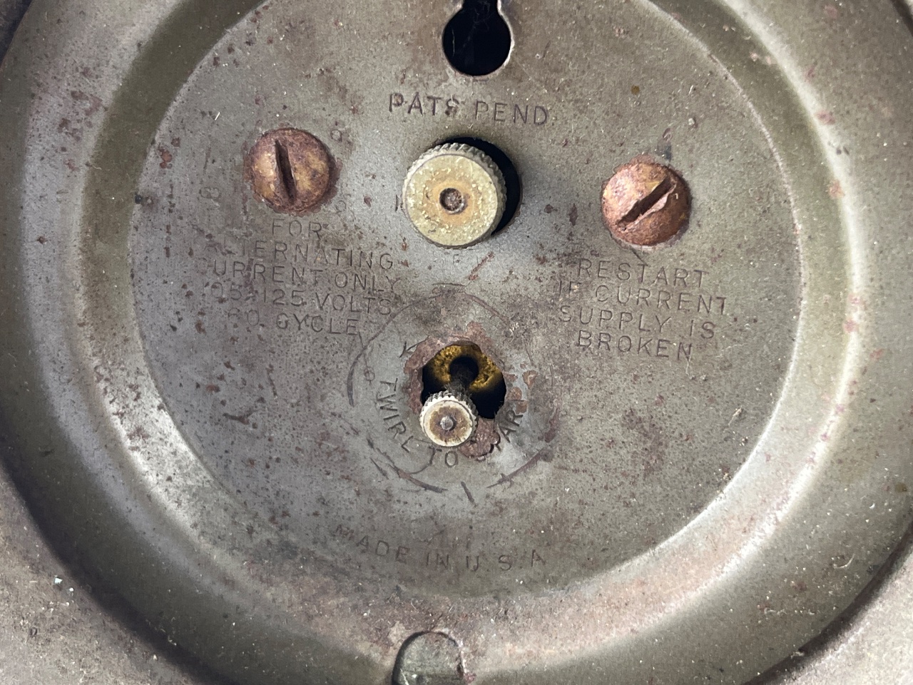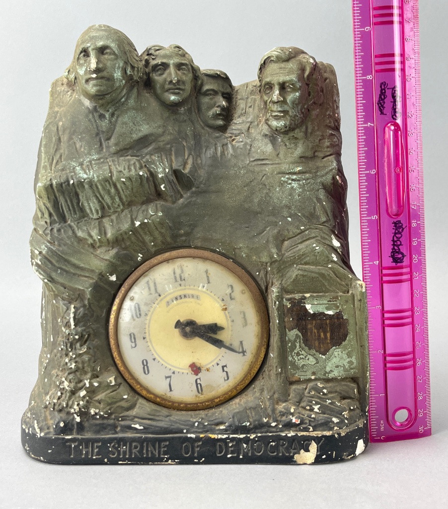 Lansire Synchronous Clock with a sculptural metal base titled ‘The Shrine of Democracy.’ The base features figures and is marked with the year ‘1941,’ ‘PAT. PEND,’ and ‘MADE IN U.S.A.’ The clock face is marked ‘LANSIRE Synchronous Time.’ Clock measures about 9″ tall. CONDITION: Surface wear and paint loss on the base. Clock face shows dirt and scratches. Patina and discoloration are present on the figures. SHIPPING: In-House Shipping Available